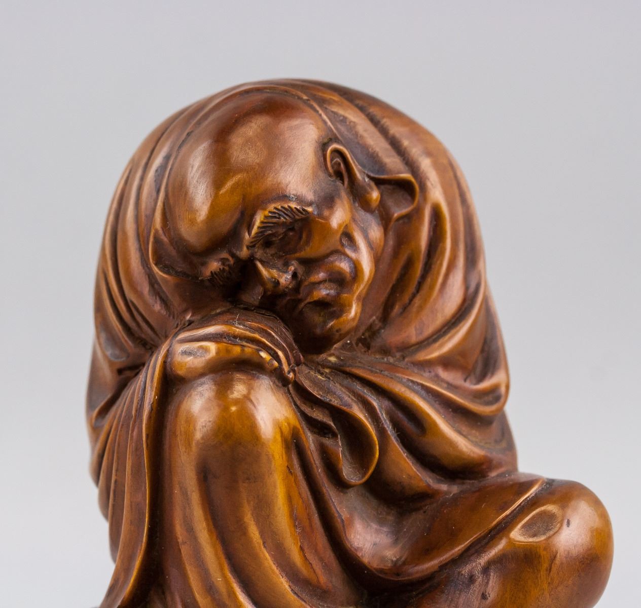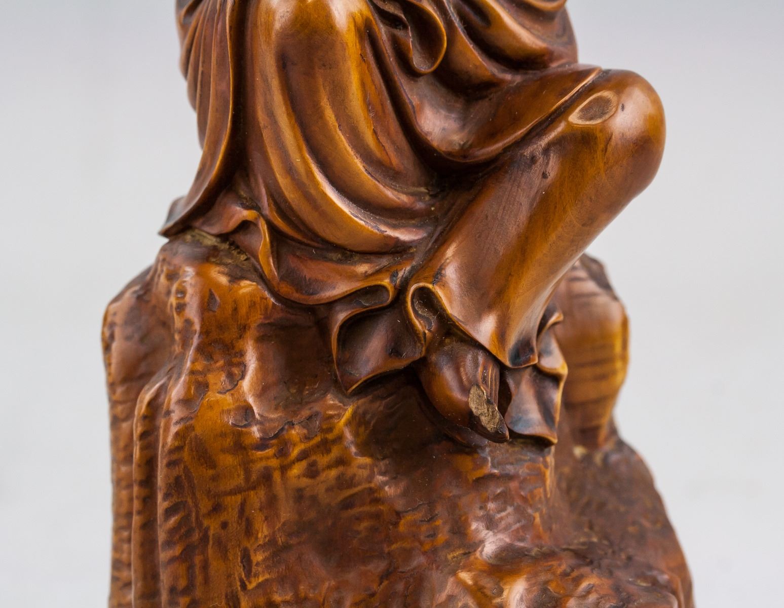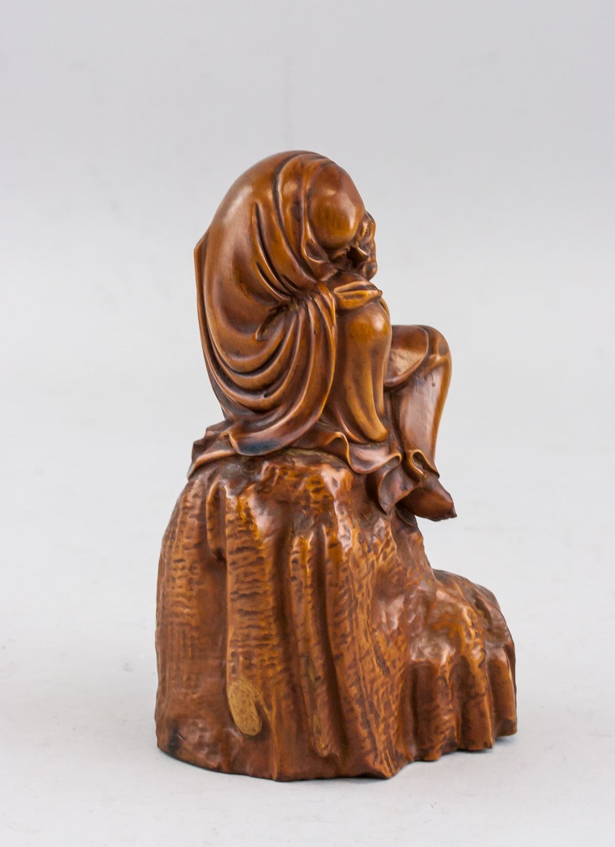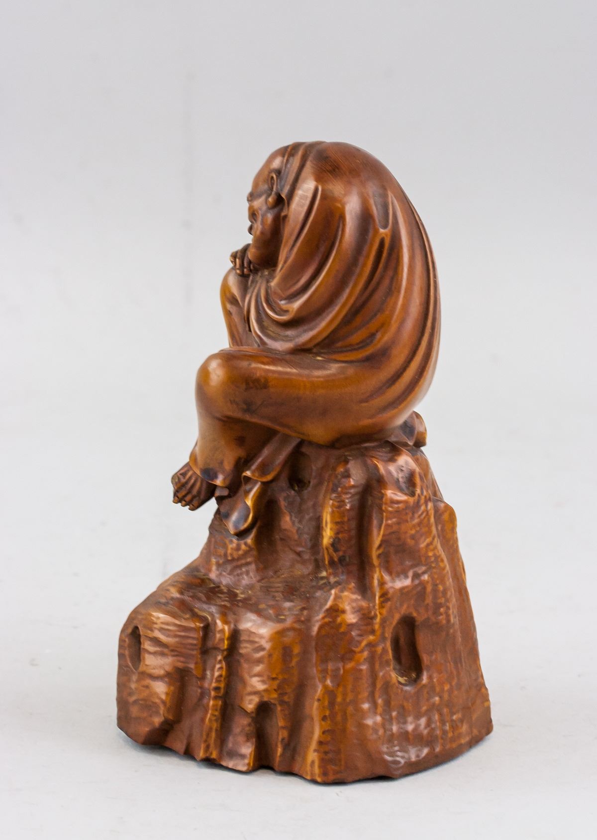 Chinese boxwood carved statue. Featuring a lohan on rock. 15 x 7.5 cm, 398 grams