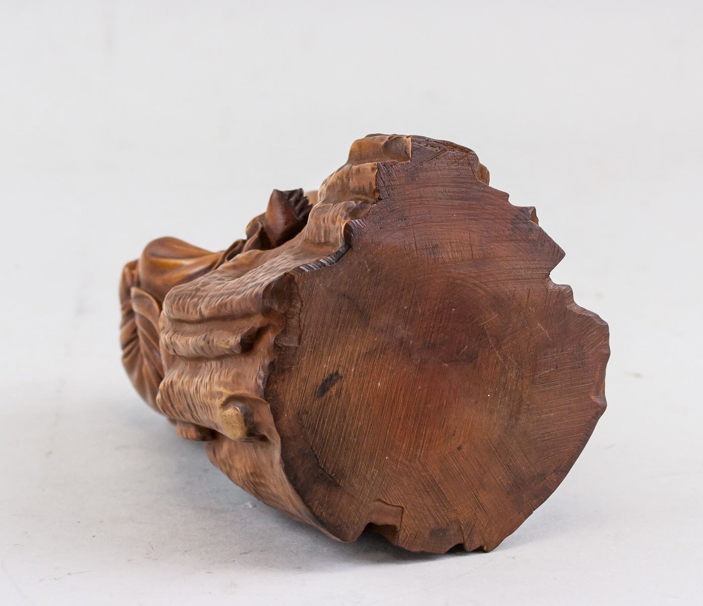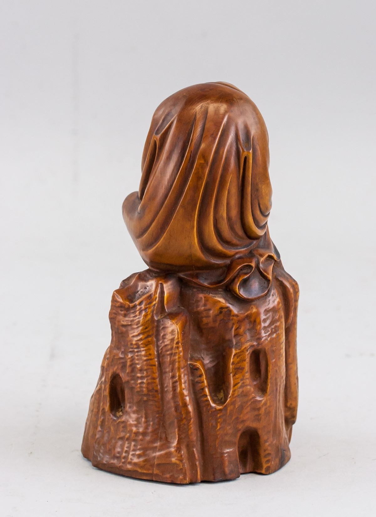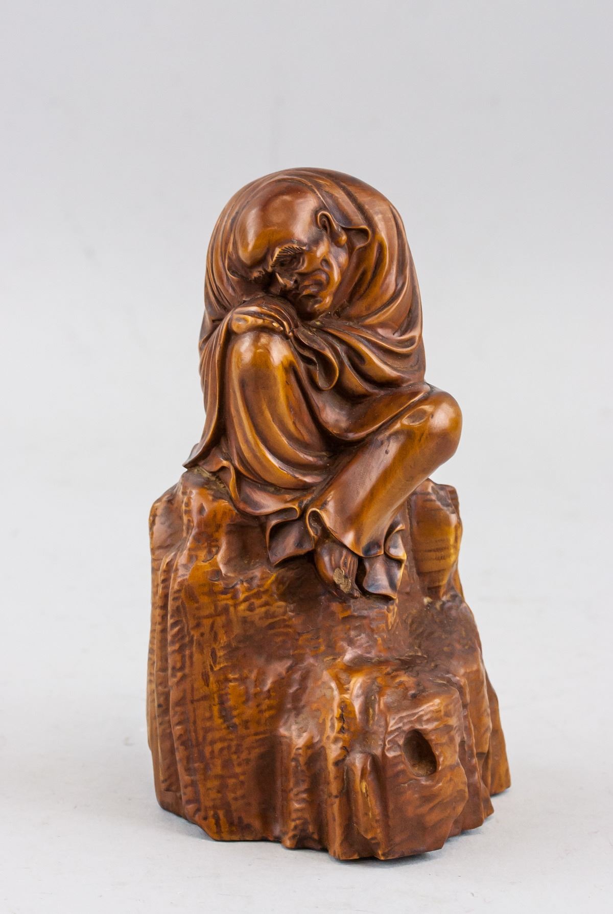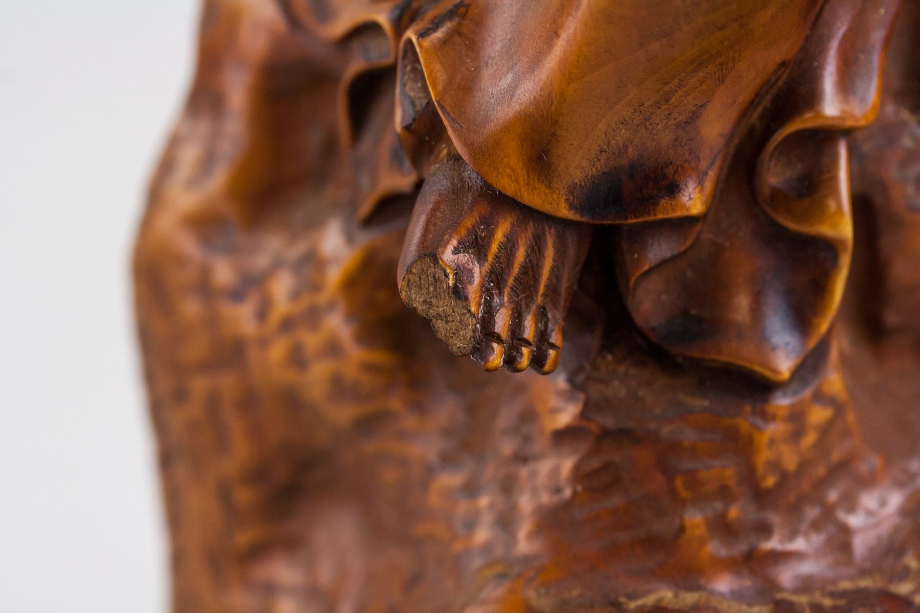 Chinese boxwood carved statue. Featuring a lohan on rock. 15 x 7.5 cm, 398 grams