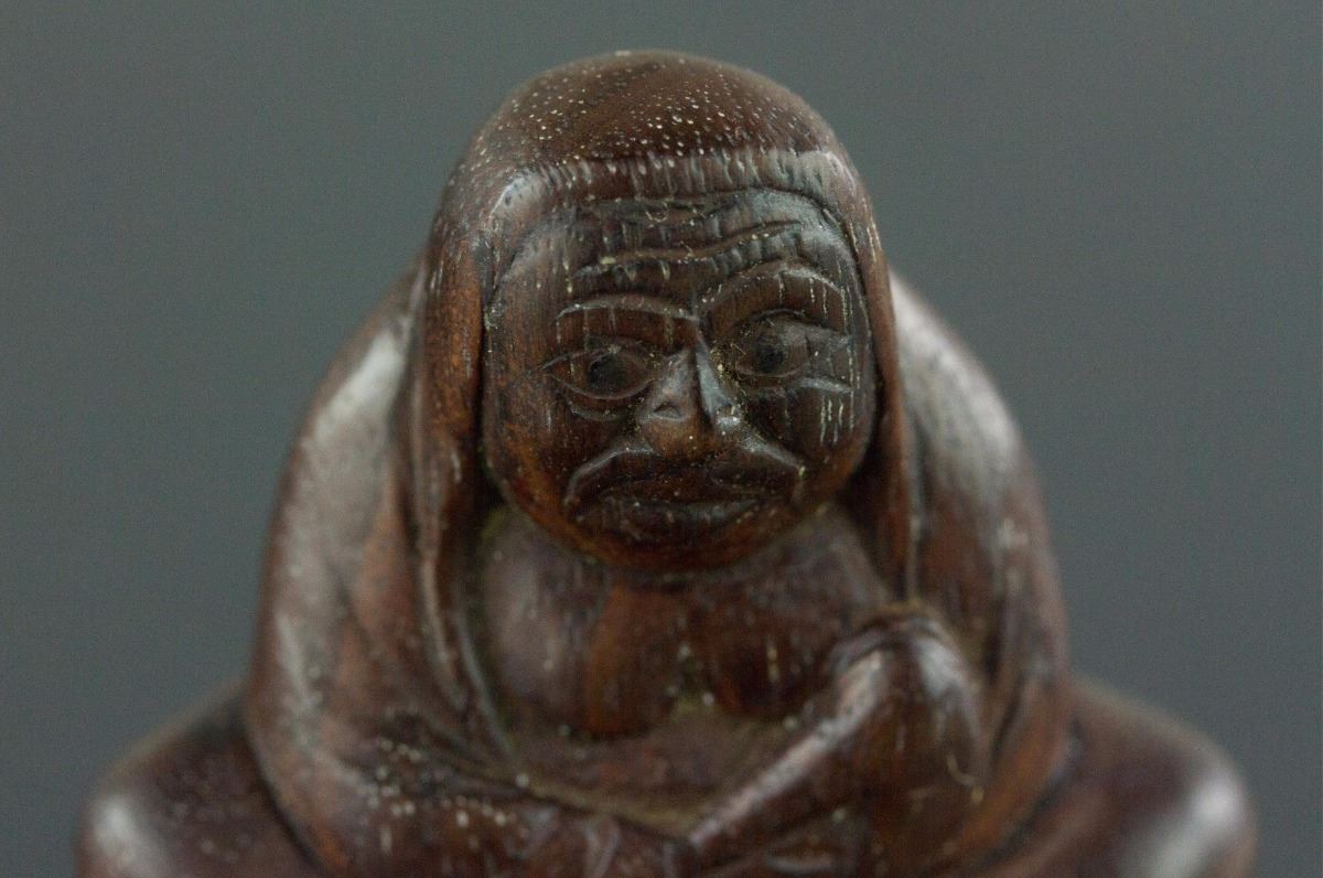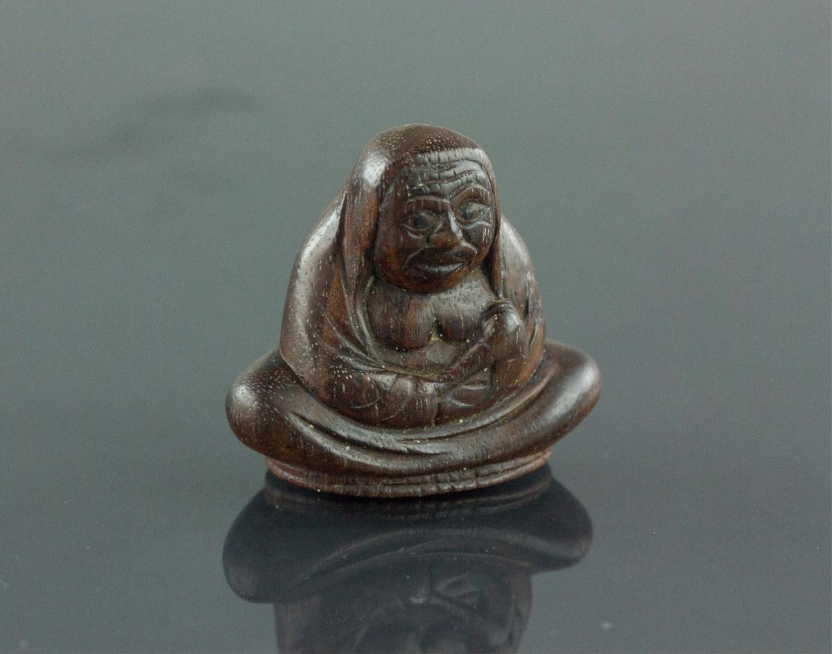 Chinese or Japanese boxwood netsuke; carved meditating Buddha figure; pierced for suspension on base; H: 4 cm, W: 4 cm, 10 grams