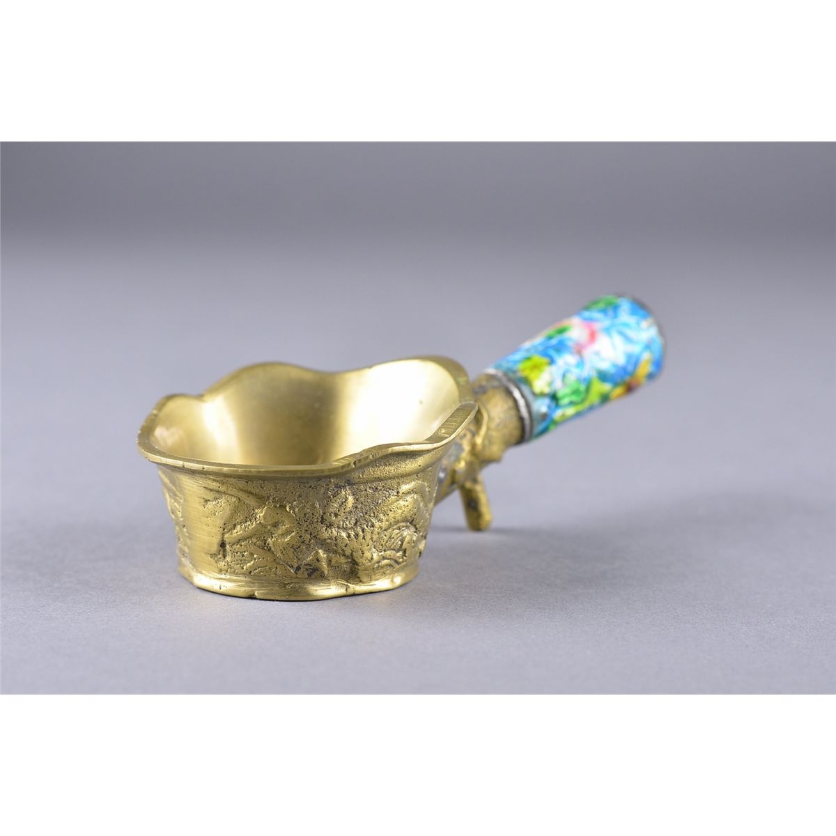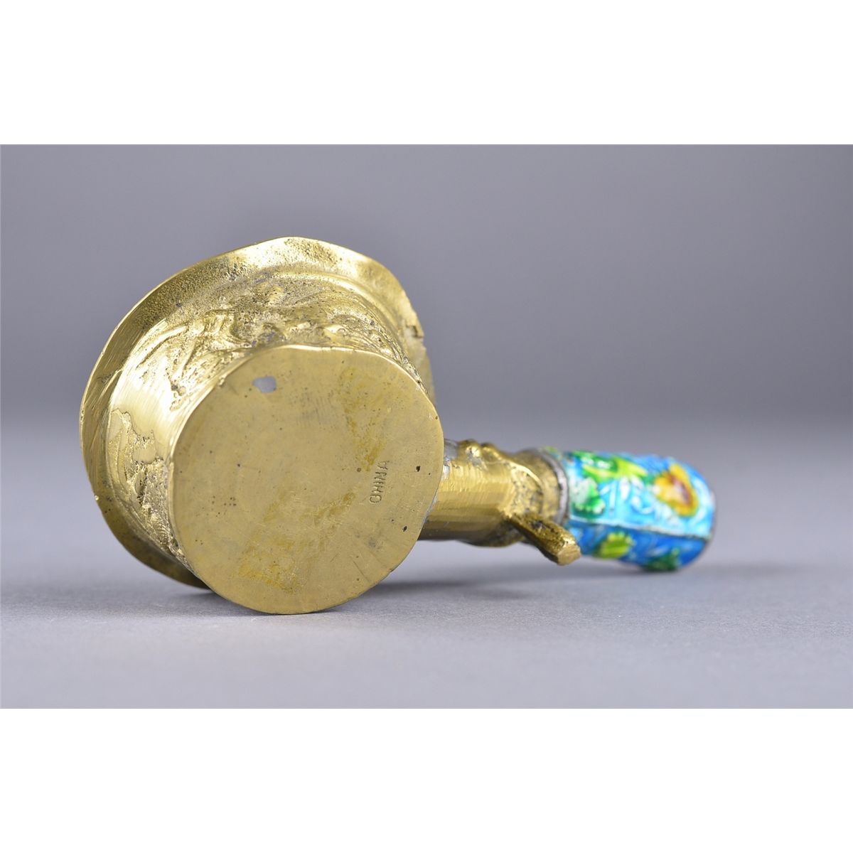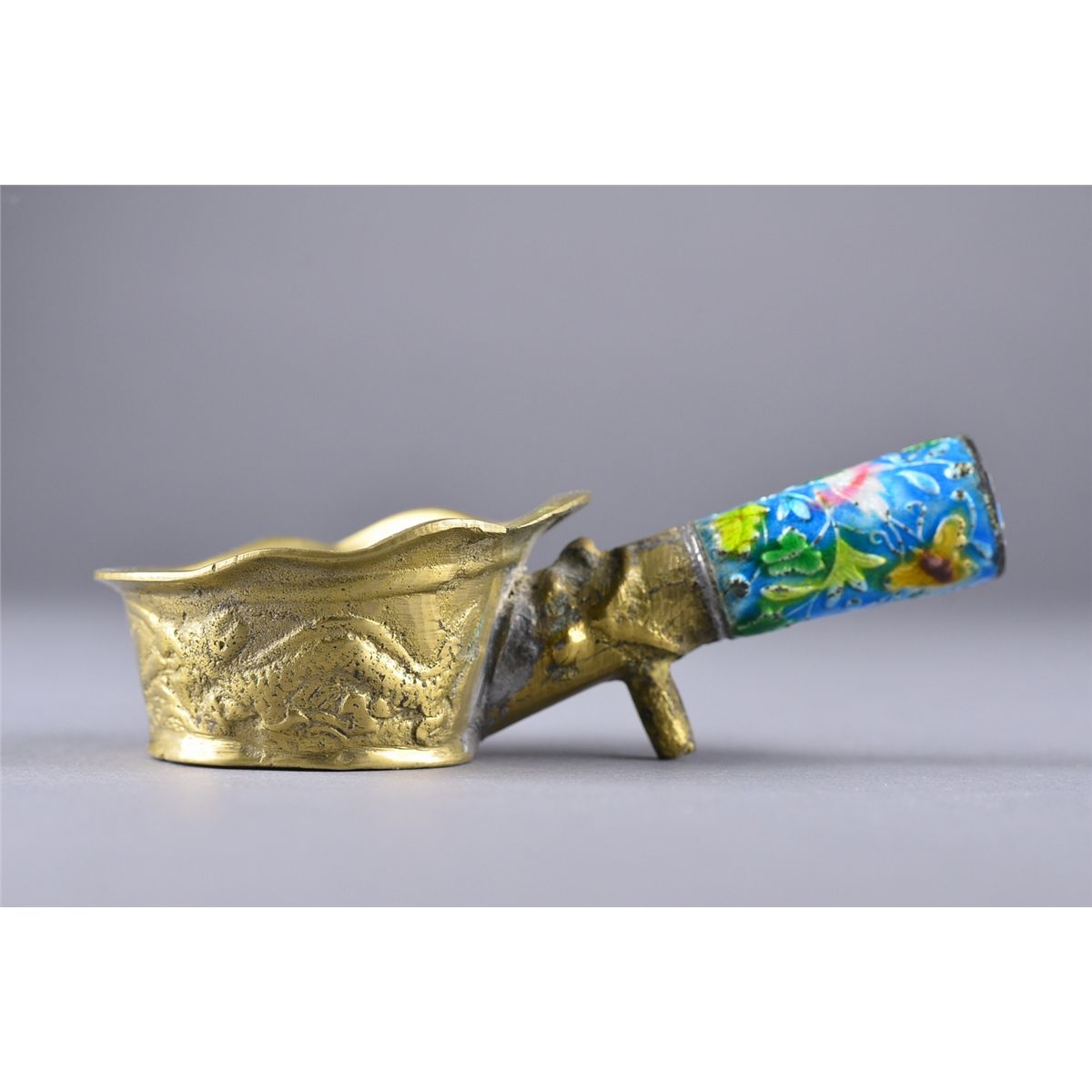 Chinese brass iron with enameled handle; L: 12 cm, 122 grams