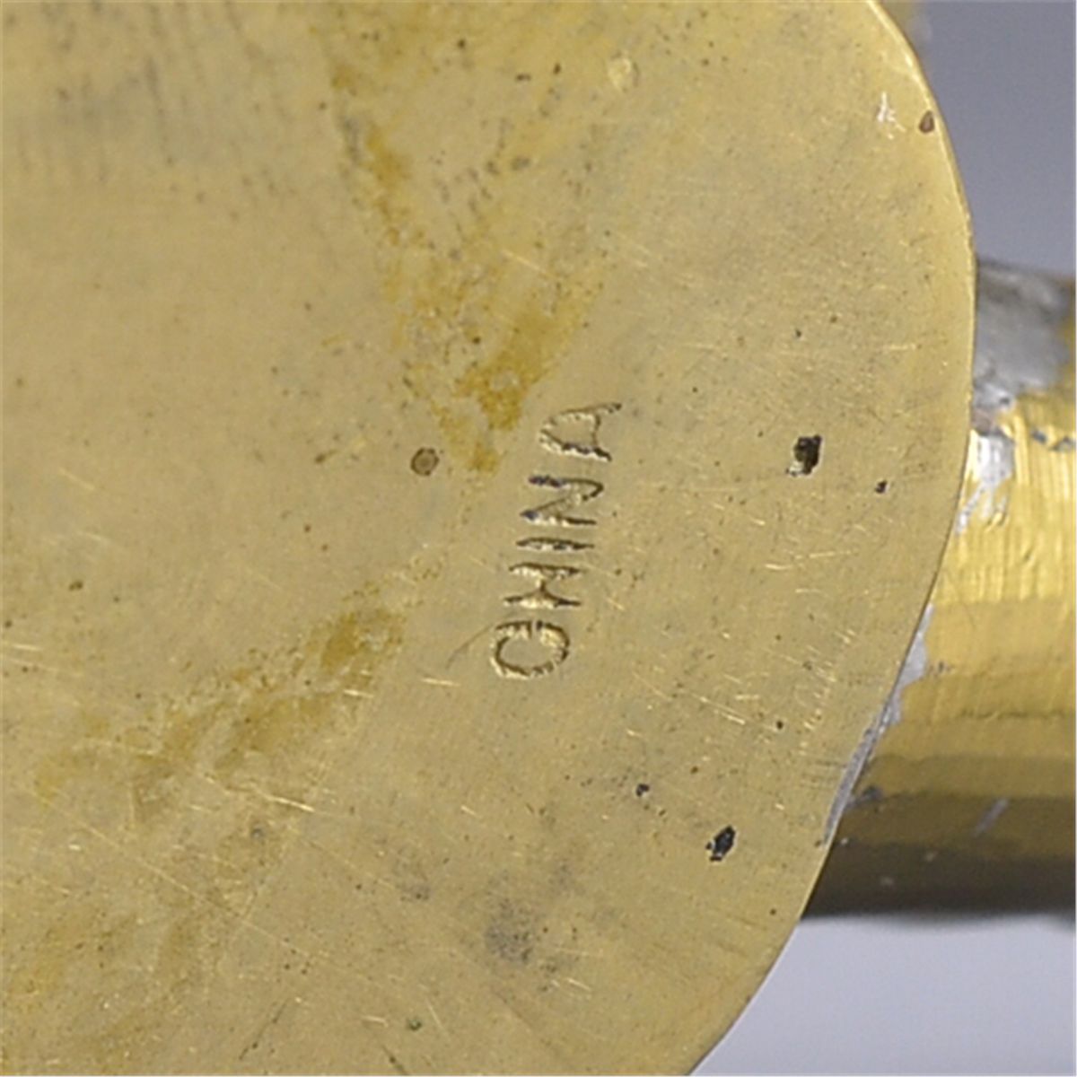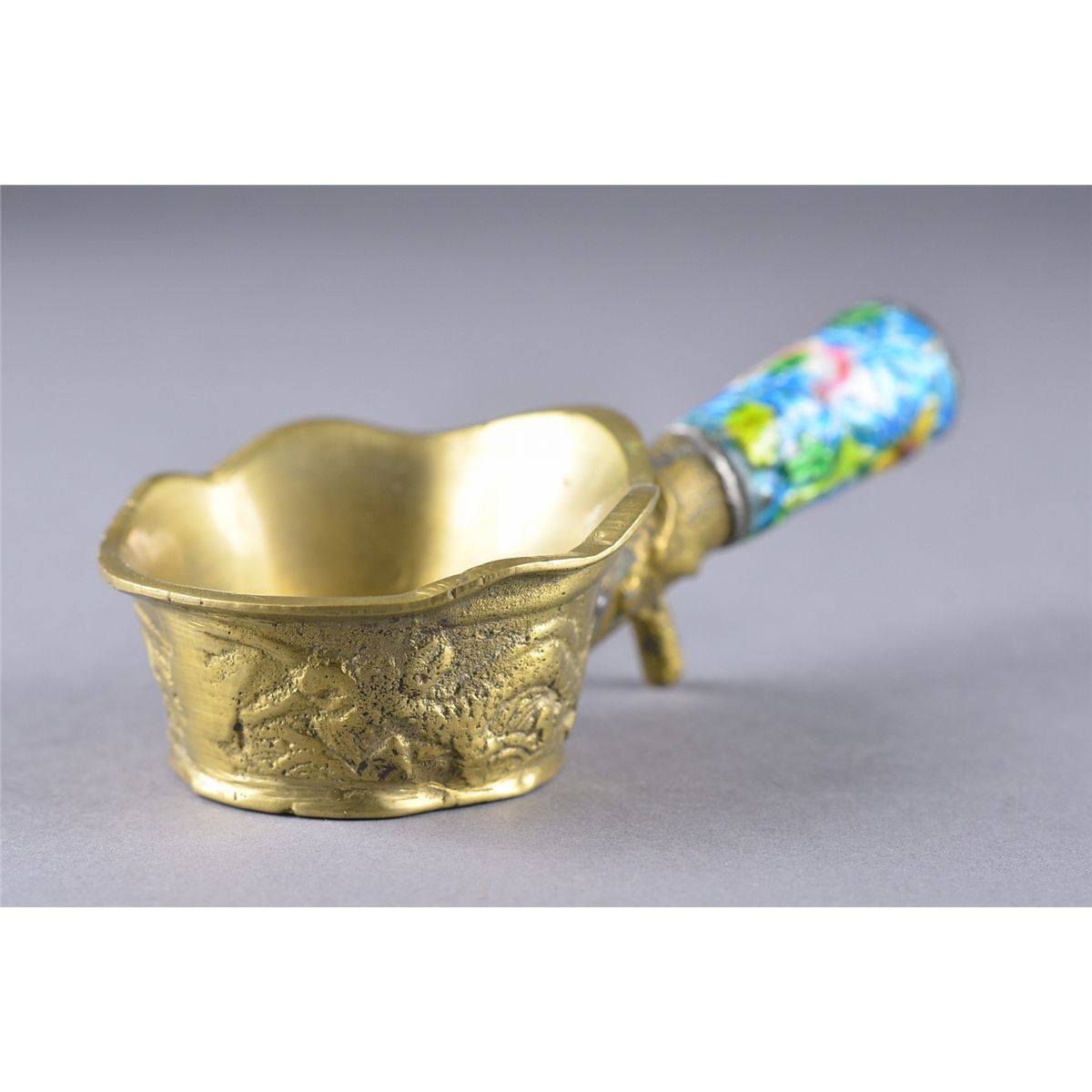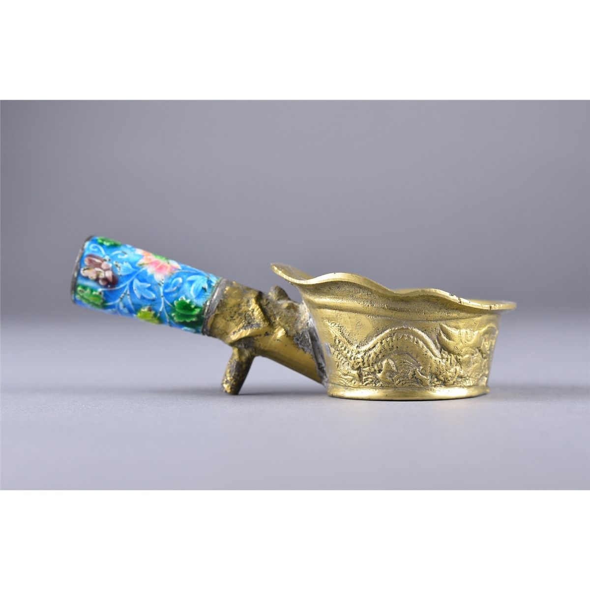 Chinese brass iron with enameled handle; L: 12 cm, 122 grams