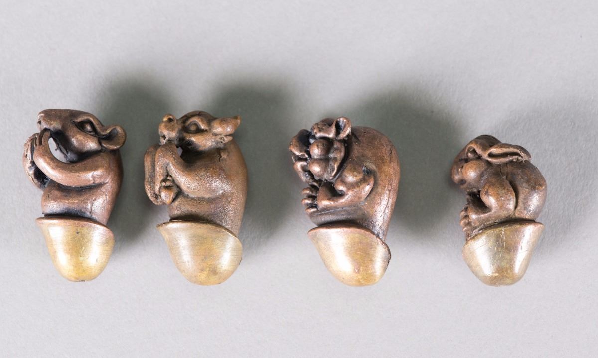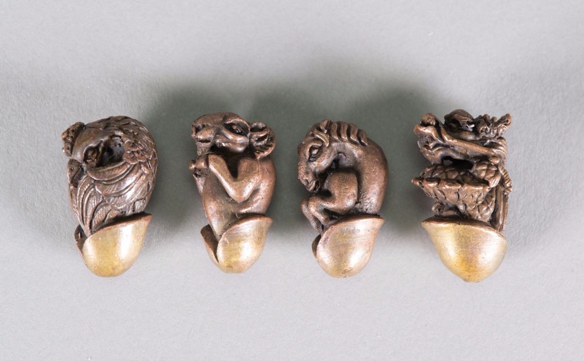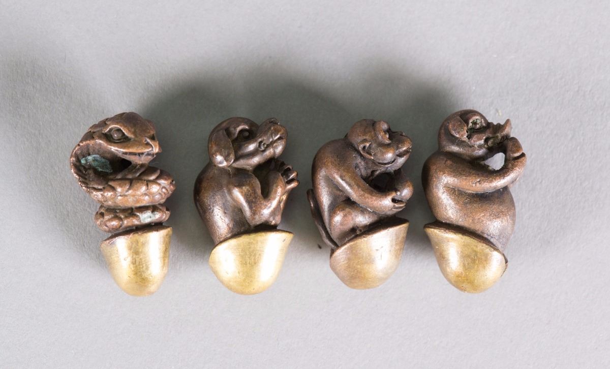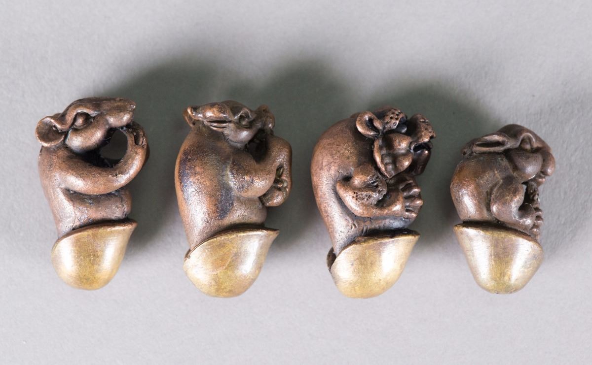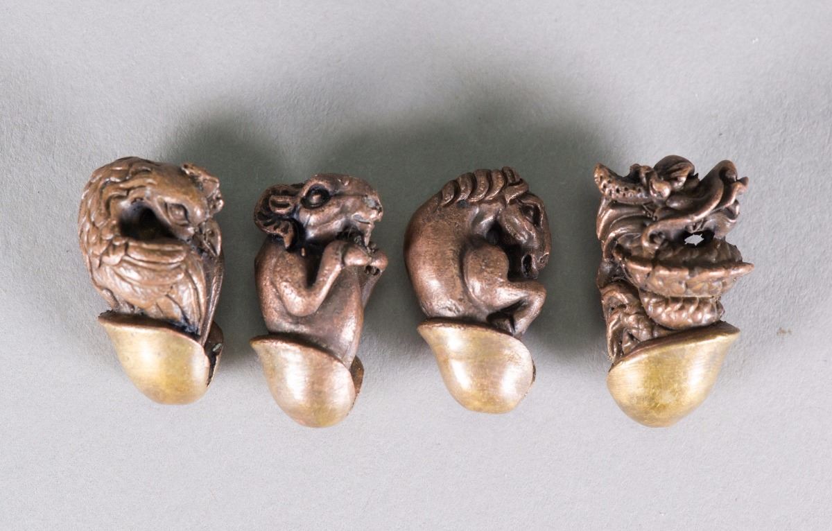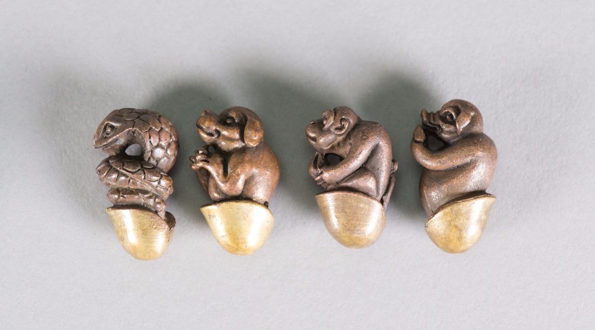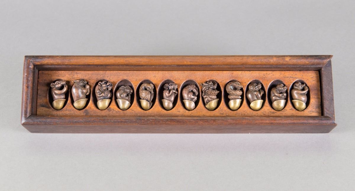 Chinese bronze twelve Zodiac figures; comprised of twelve Chinese animal Zodiac bronze figures; with custom wooden case; Qianlong mark on the cover; H: 3 cm, W: 30 cm, 698 grams