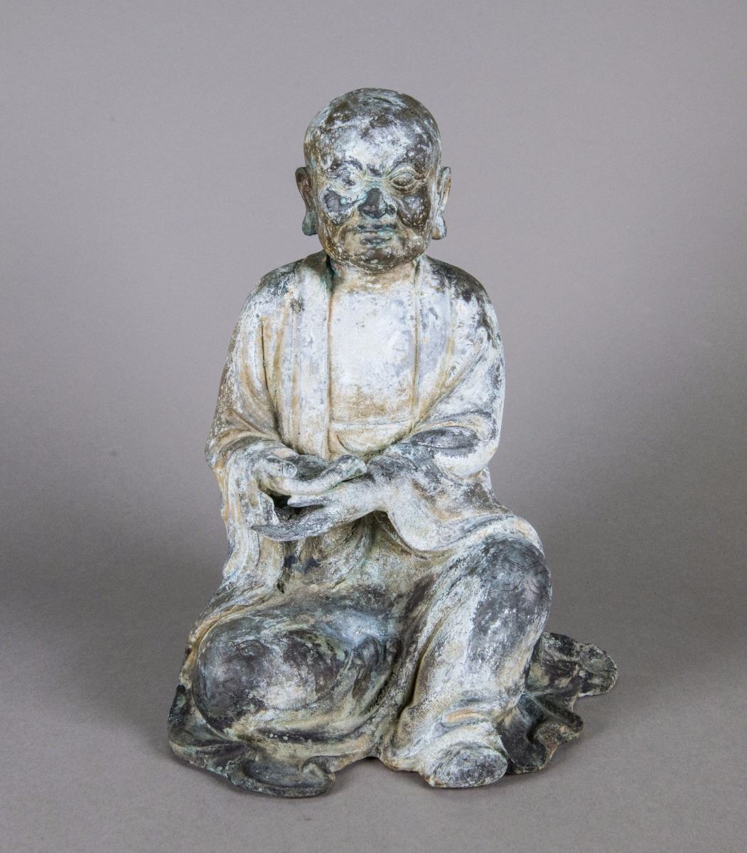 Chinese bronze arhat figure; featuring a seated arhat wearing a robe; H: 27.5 cm, L: 22 cm, W: 20.3 cm, 4937 grams