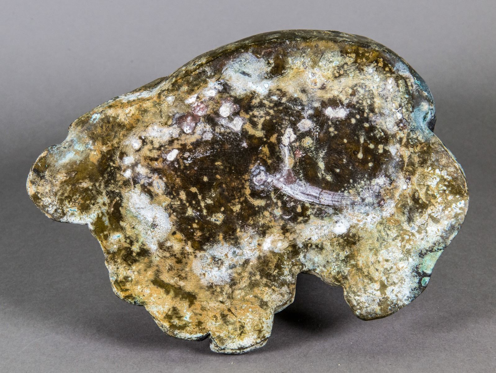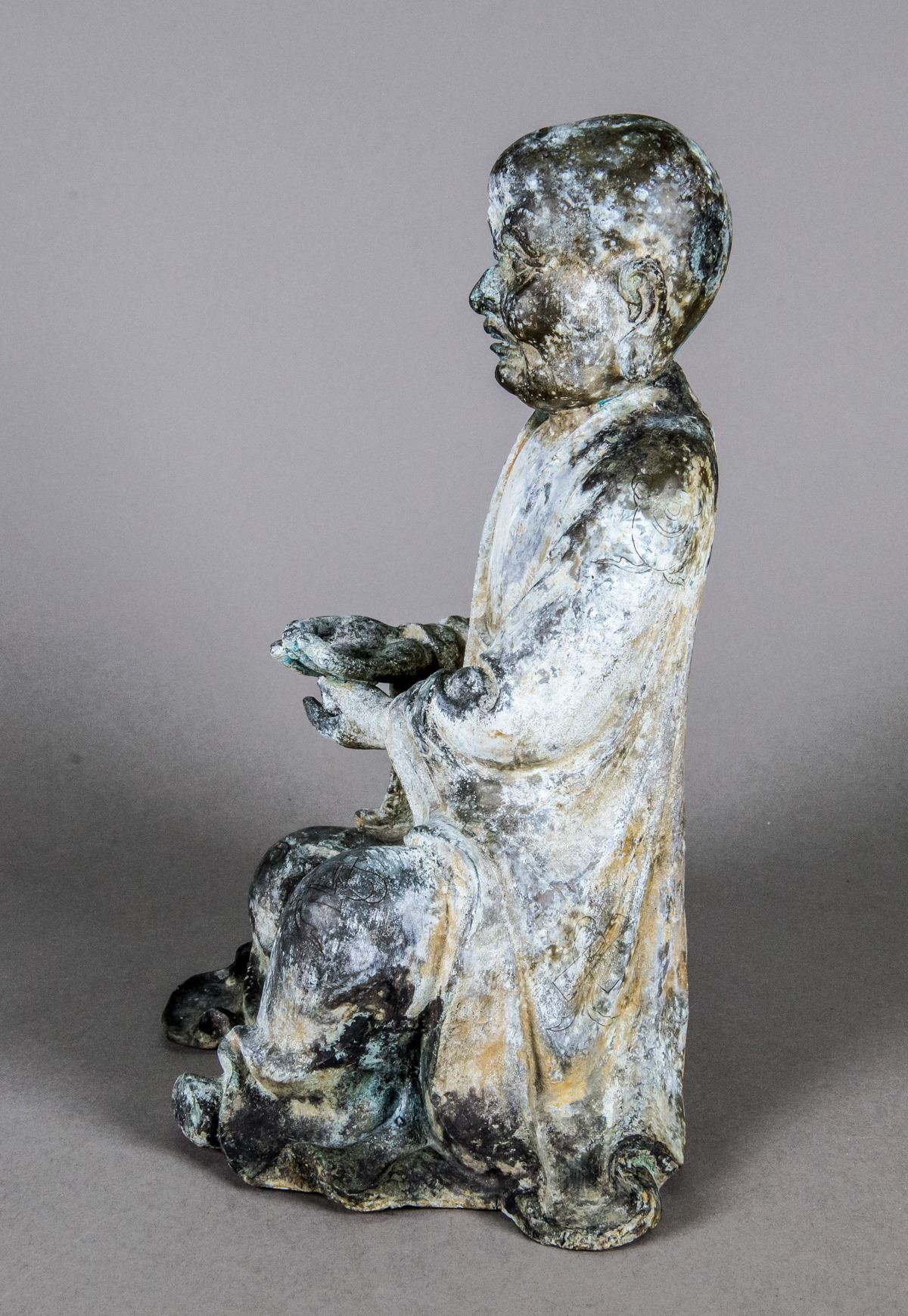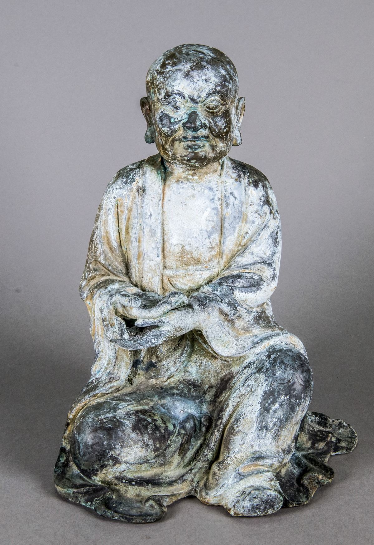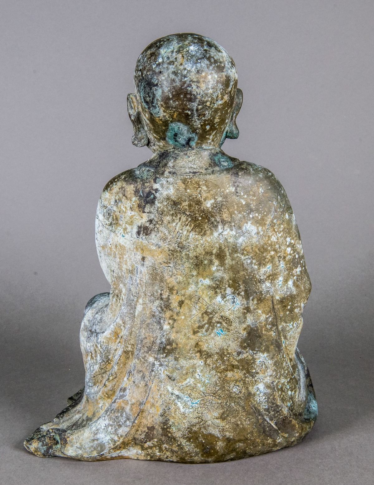 Chinese bronze arhat figure; featuring a seated arhat wearing a robe; H: 27.5 cm, L: 22 cm, W: 20.3 cm, 4937 grams