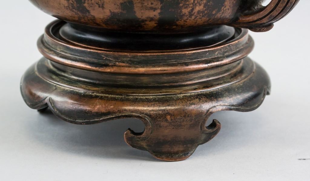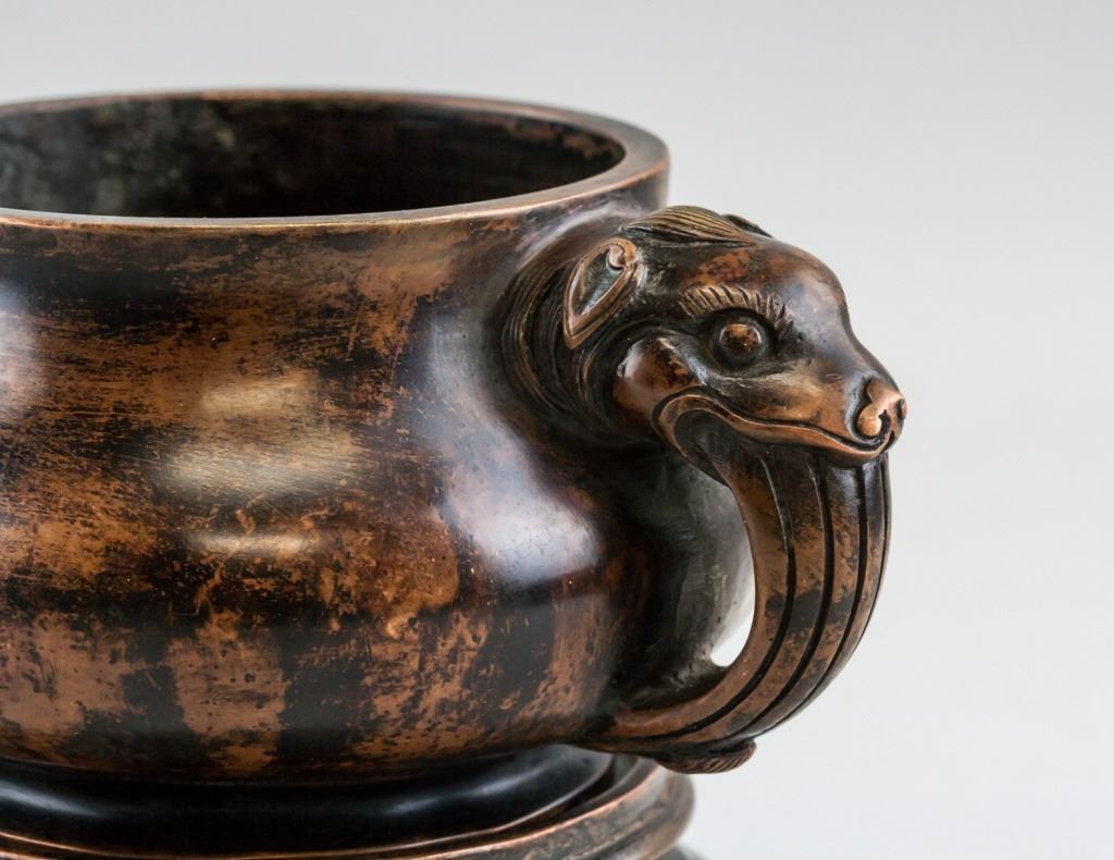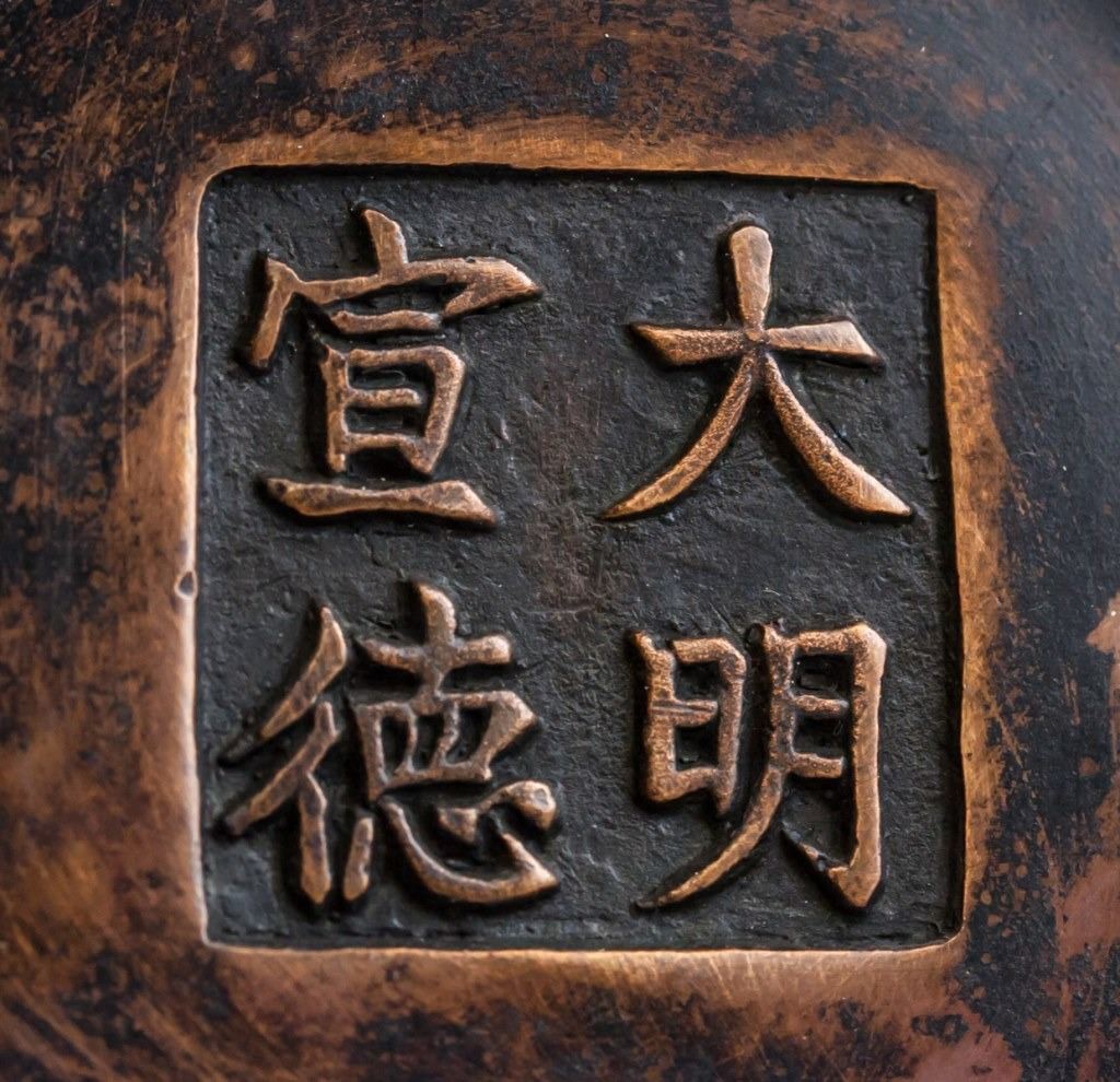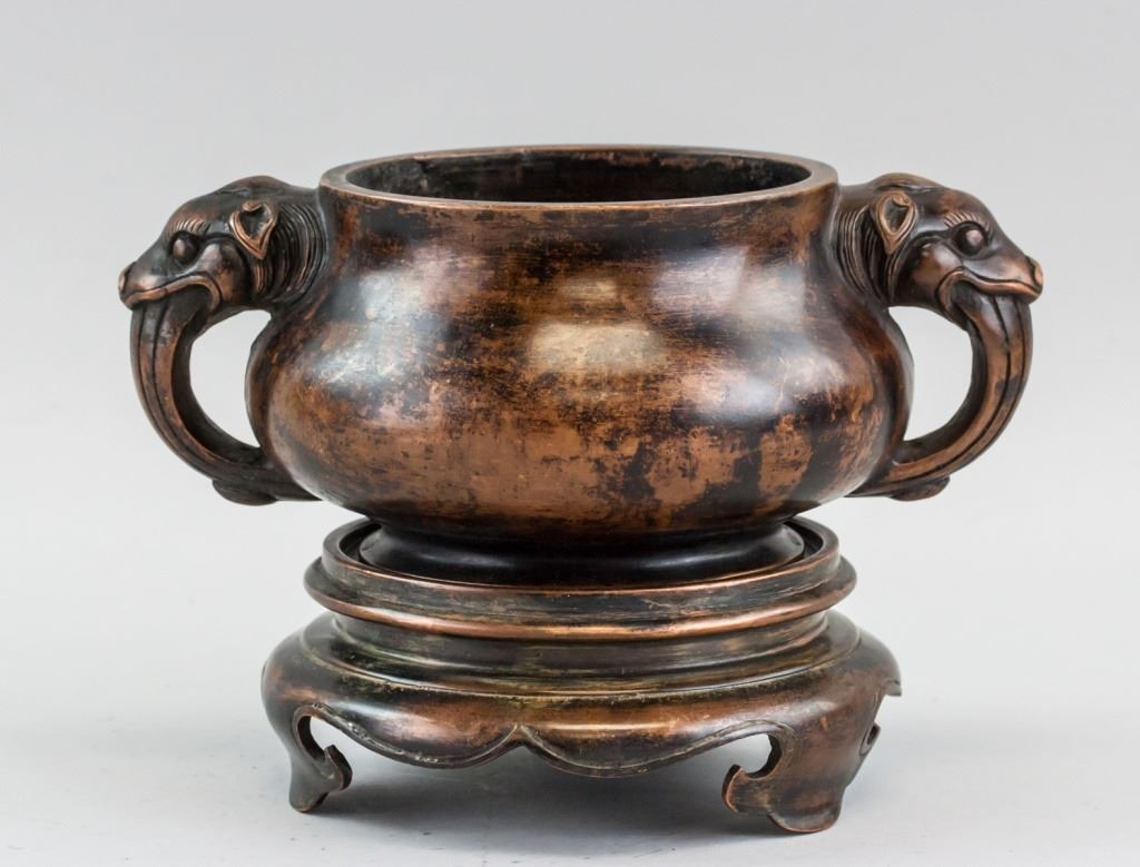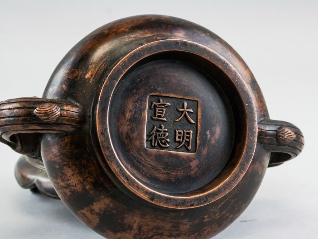 Chinese bronze censer. Of round body with base. Flanked with two beast form handles. Four-character Ming dynasty Xuande mark on base. 14 x 15 cm, 1865 grams total