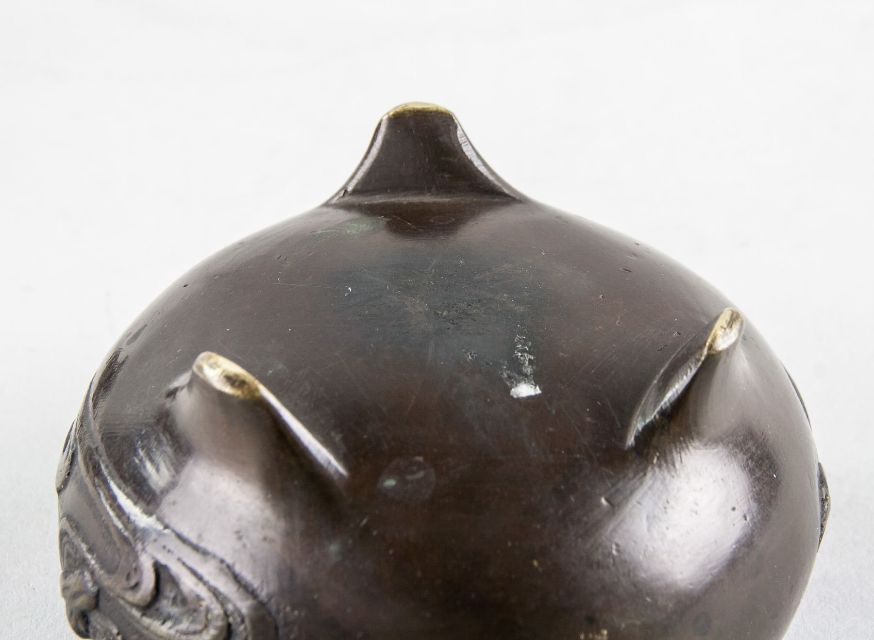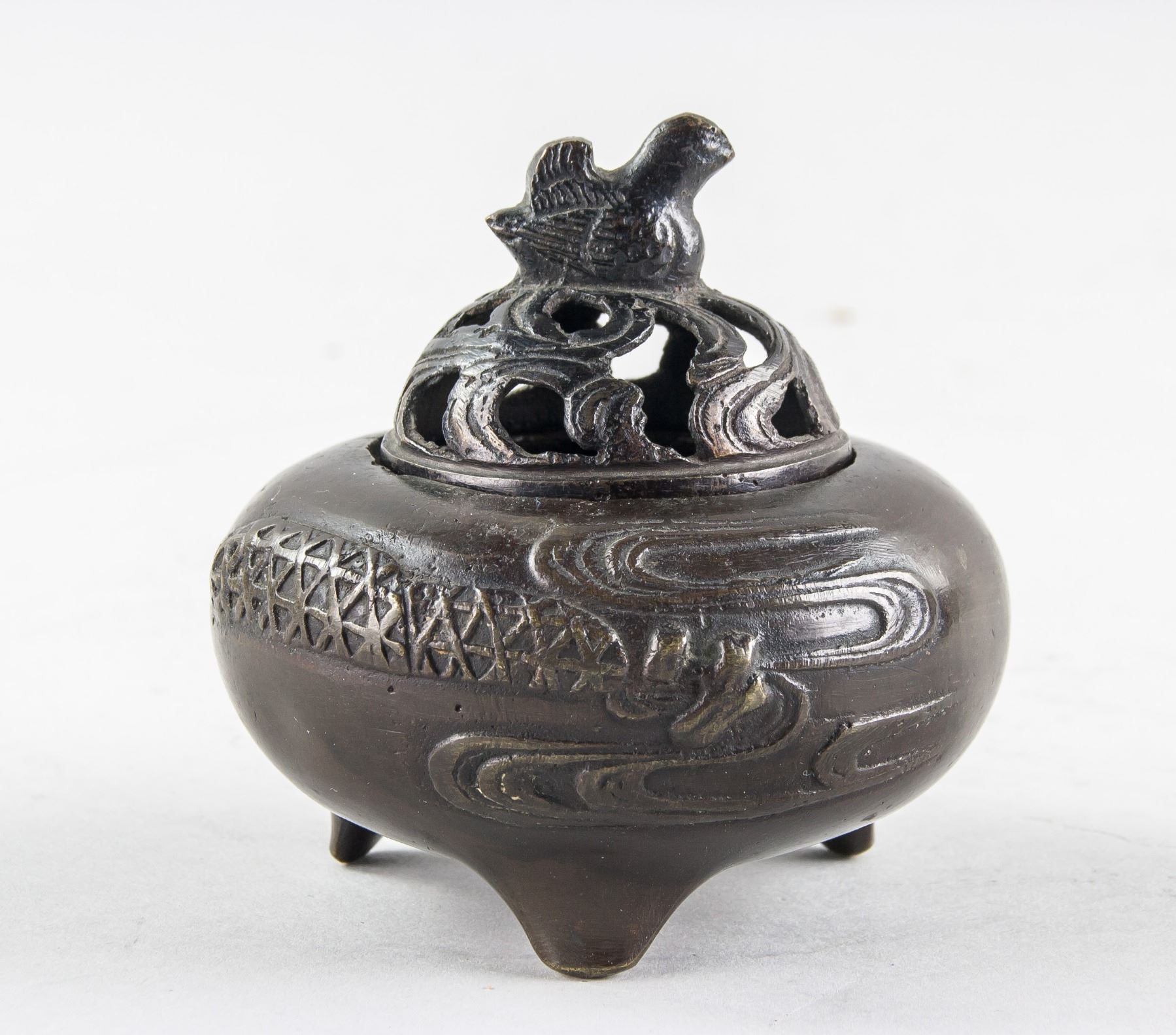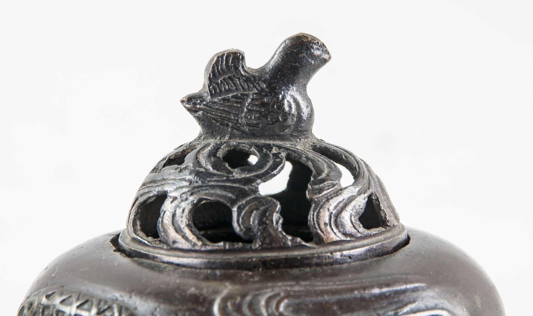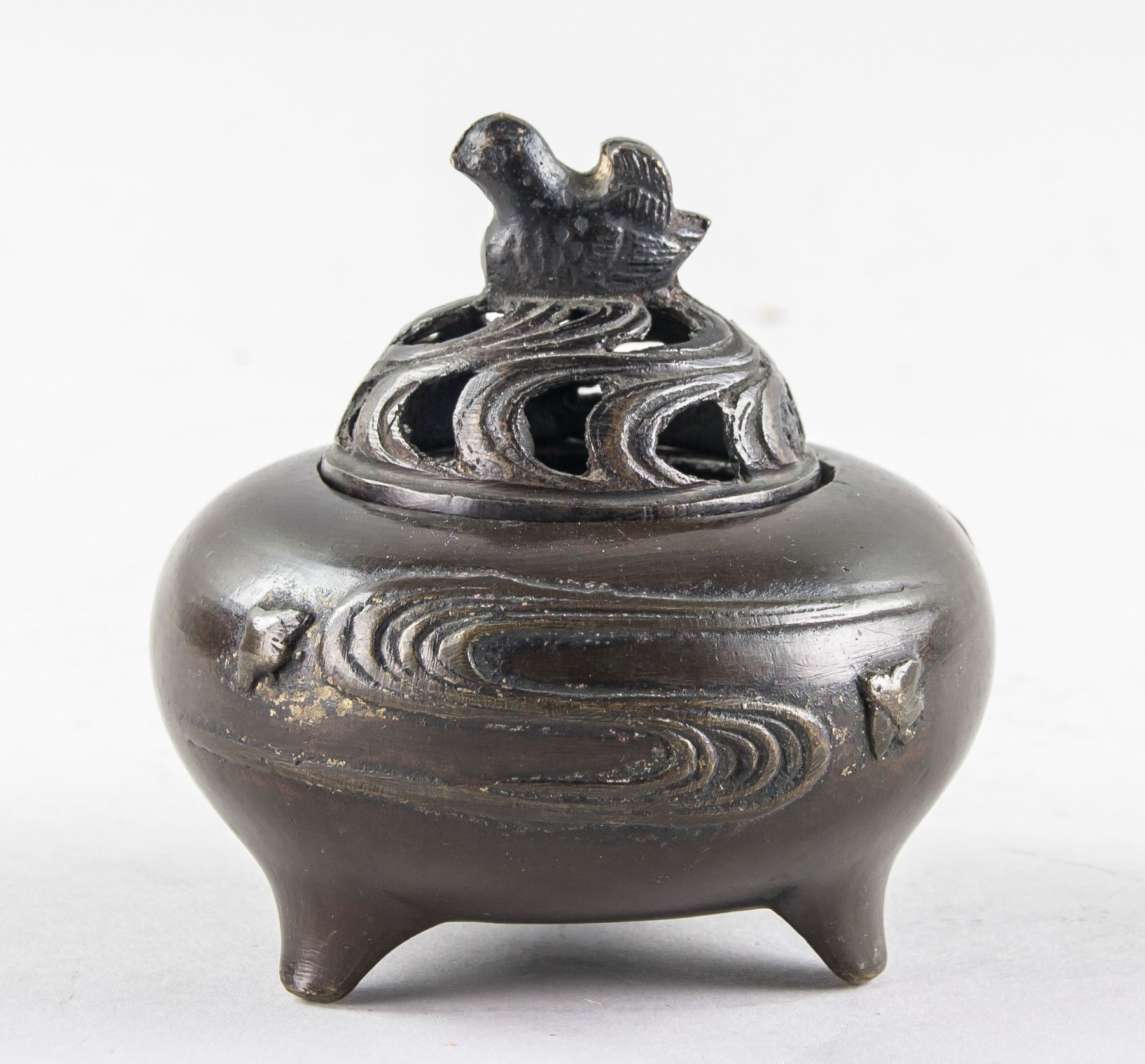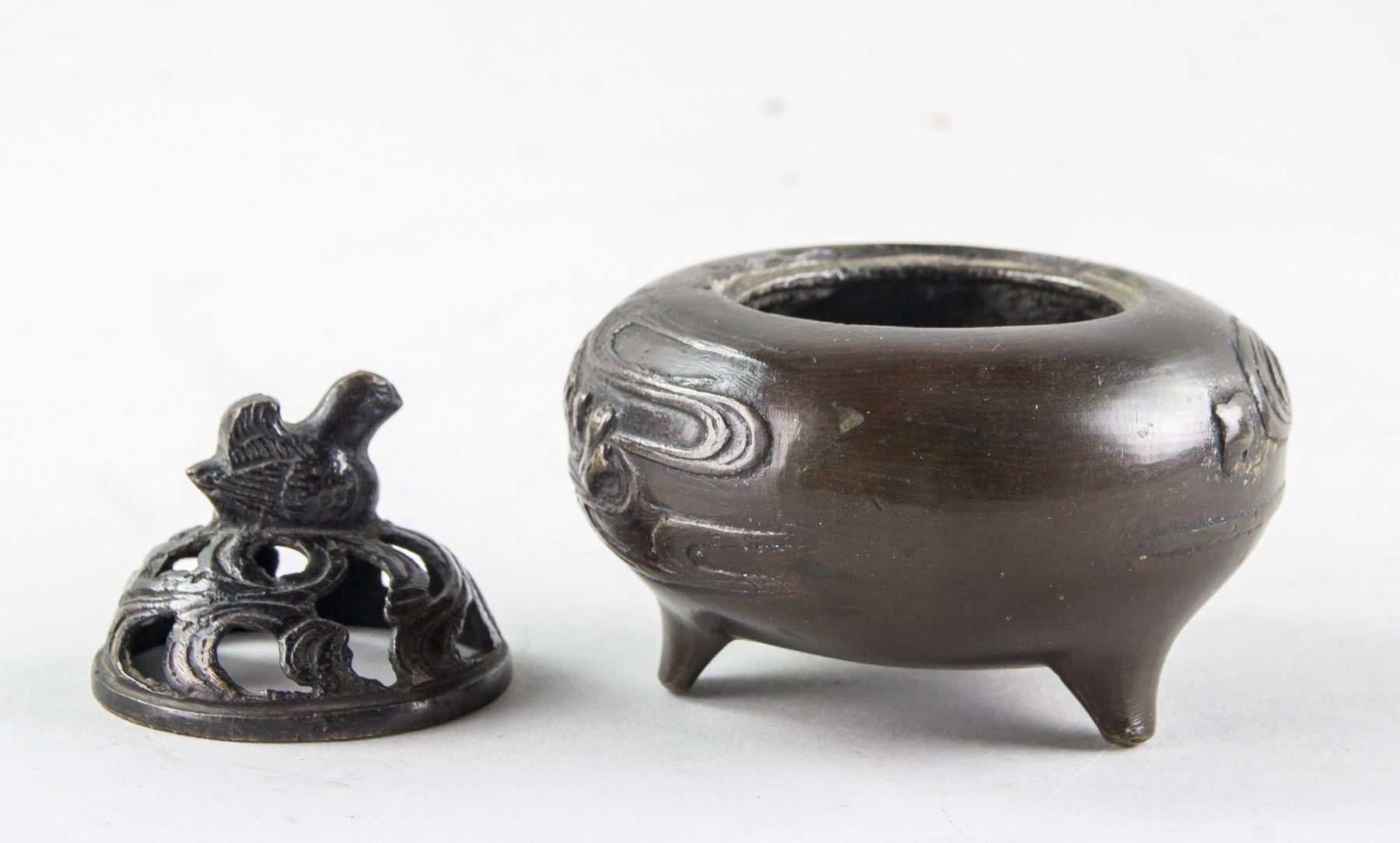 Chinese bronze censer, of compressed globular body, supported on three legs, cover surmounted by a bird, carved with curves and birds on body, 9 x 9 cm, 351 grams