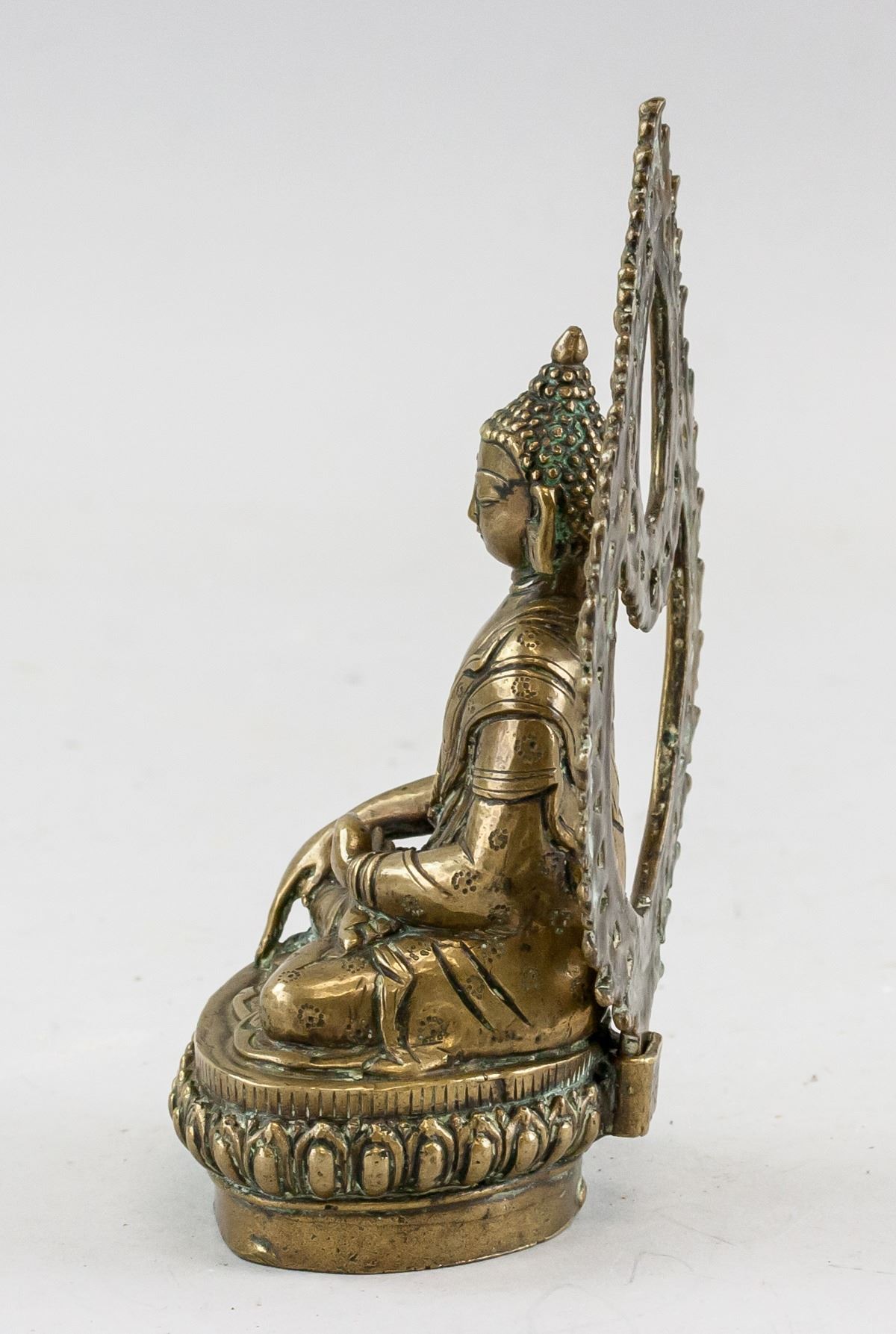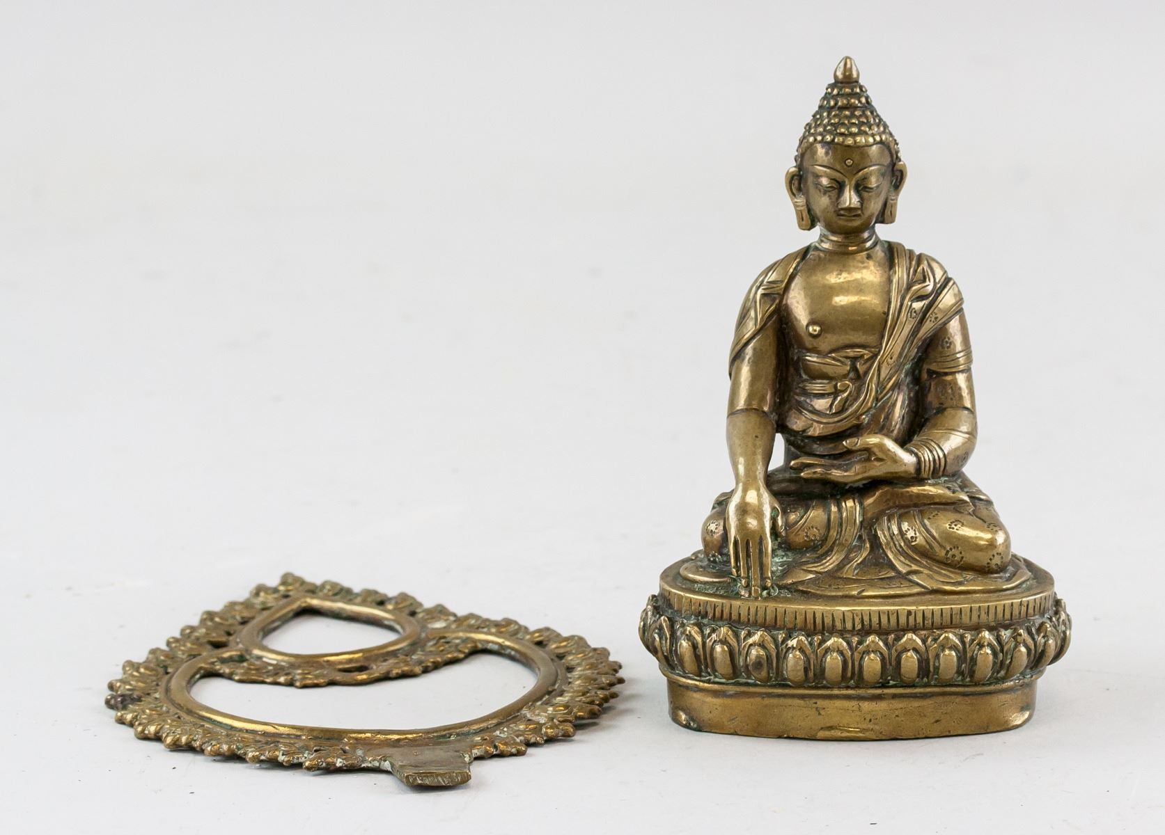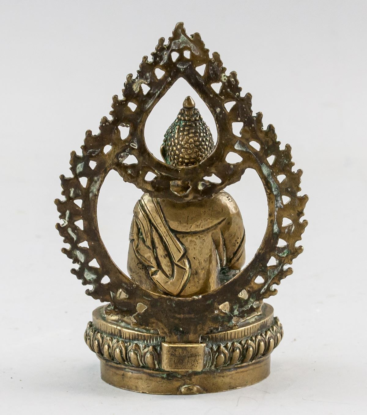 Chinese bronze statue. Featuring seated Shakyamuni Buddha on lotus pedal base. With detachable aura on back. 15 x 11 cm, 403 grams