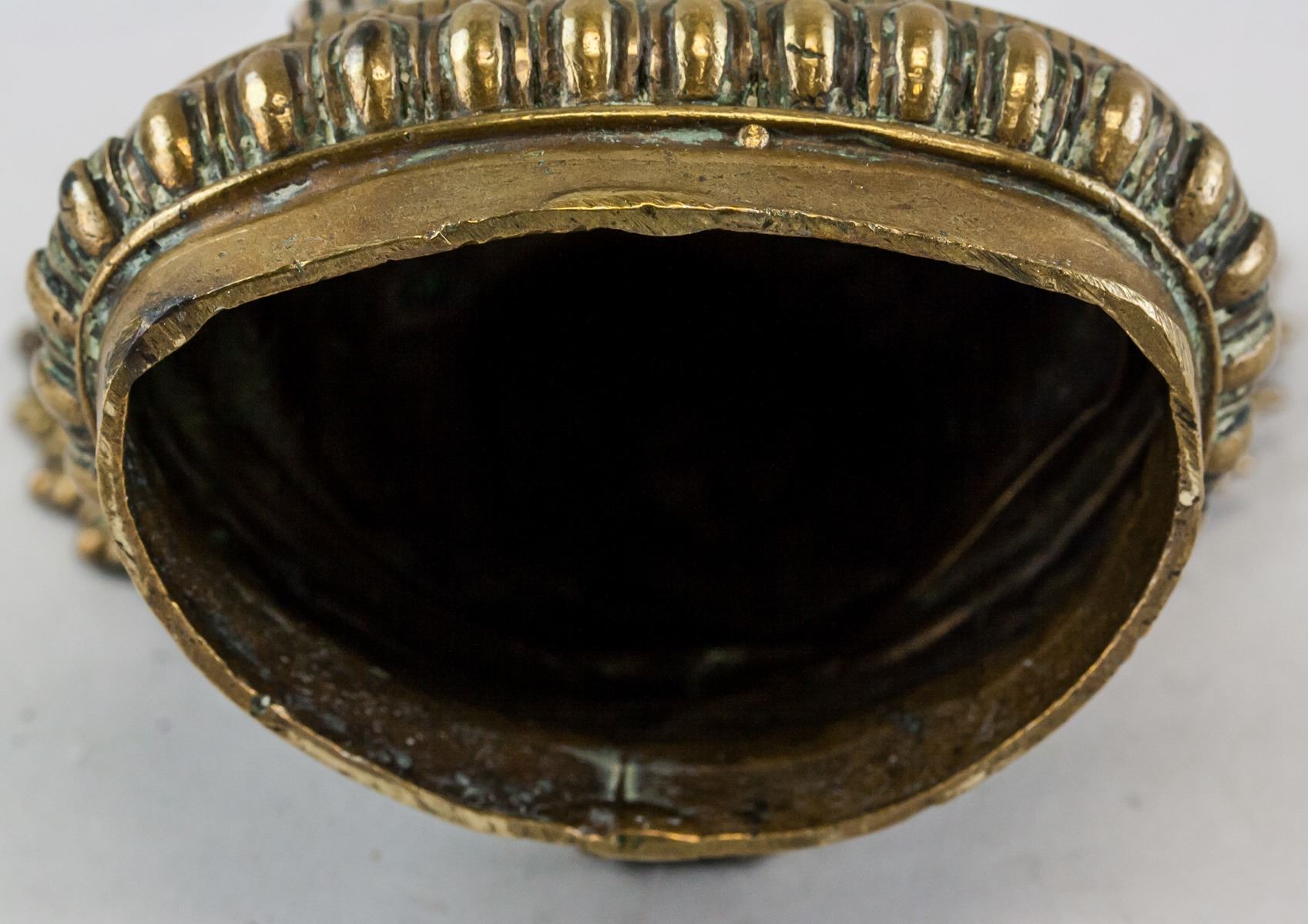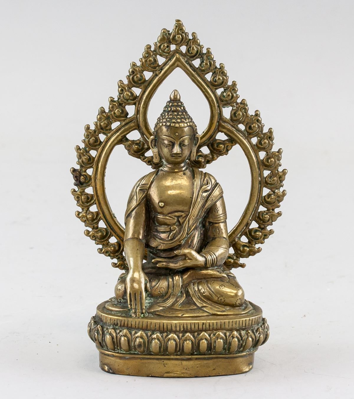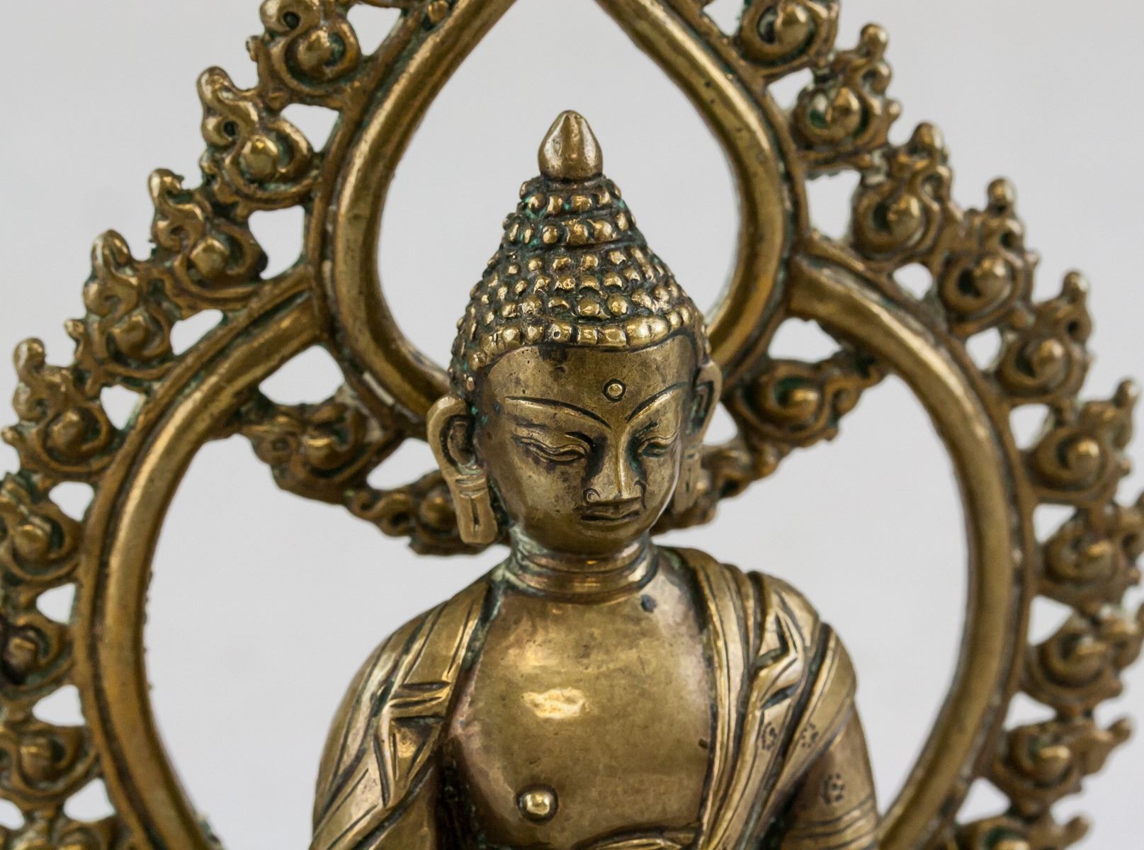 Chinese bronze statue. Featuring seated Shakyamuni Buddha on lotus pedal base. With detachable aura on back. 15 x 11 cm, 403 grams
