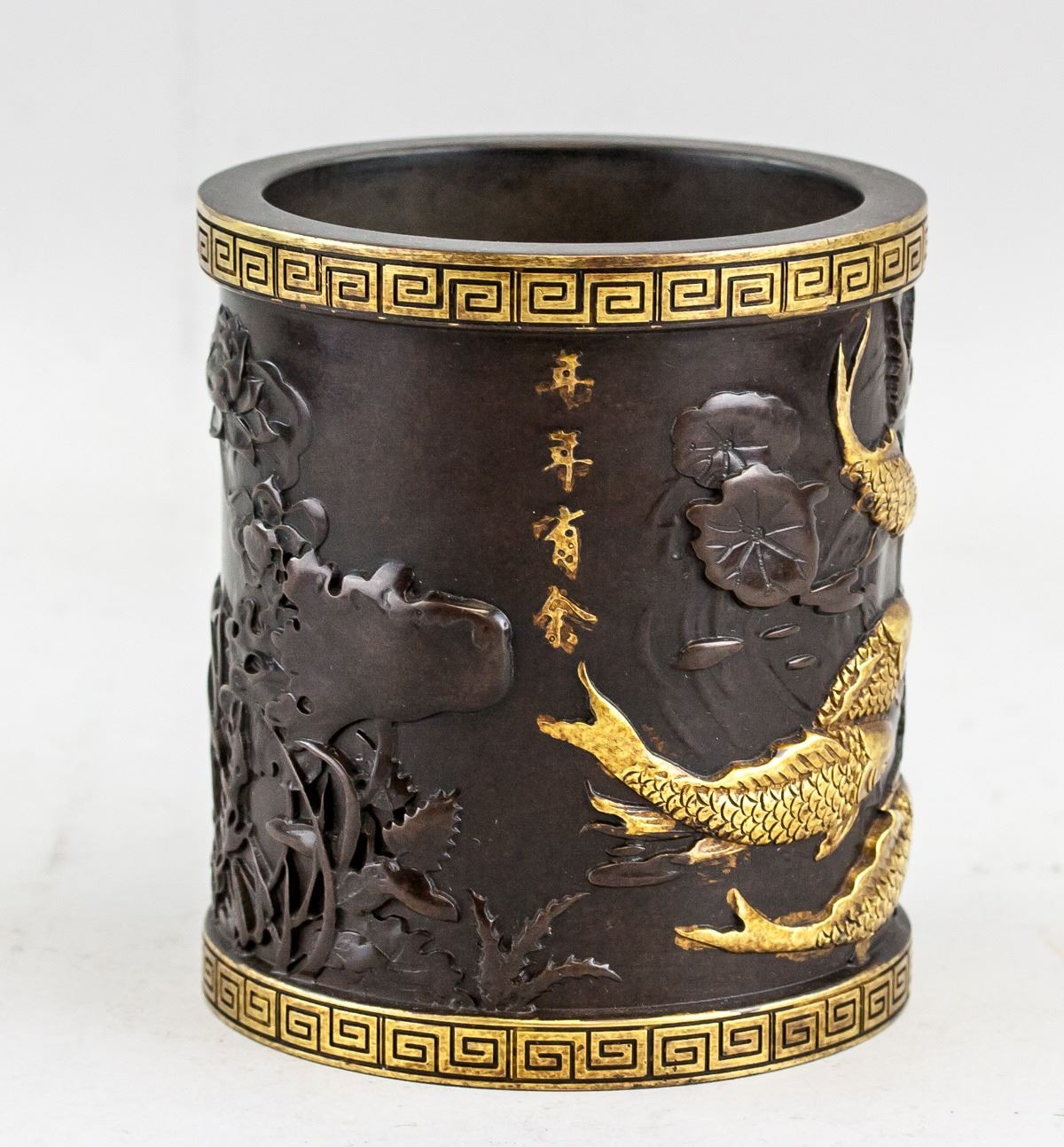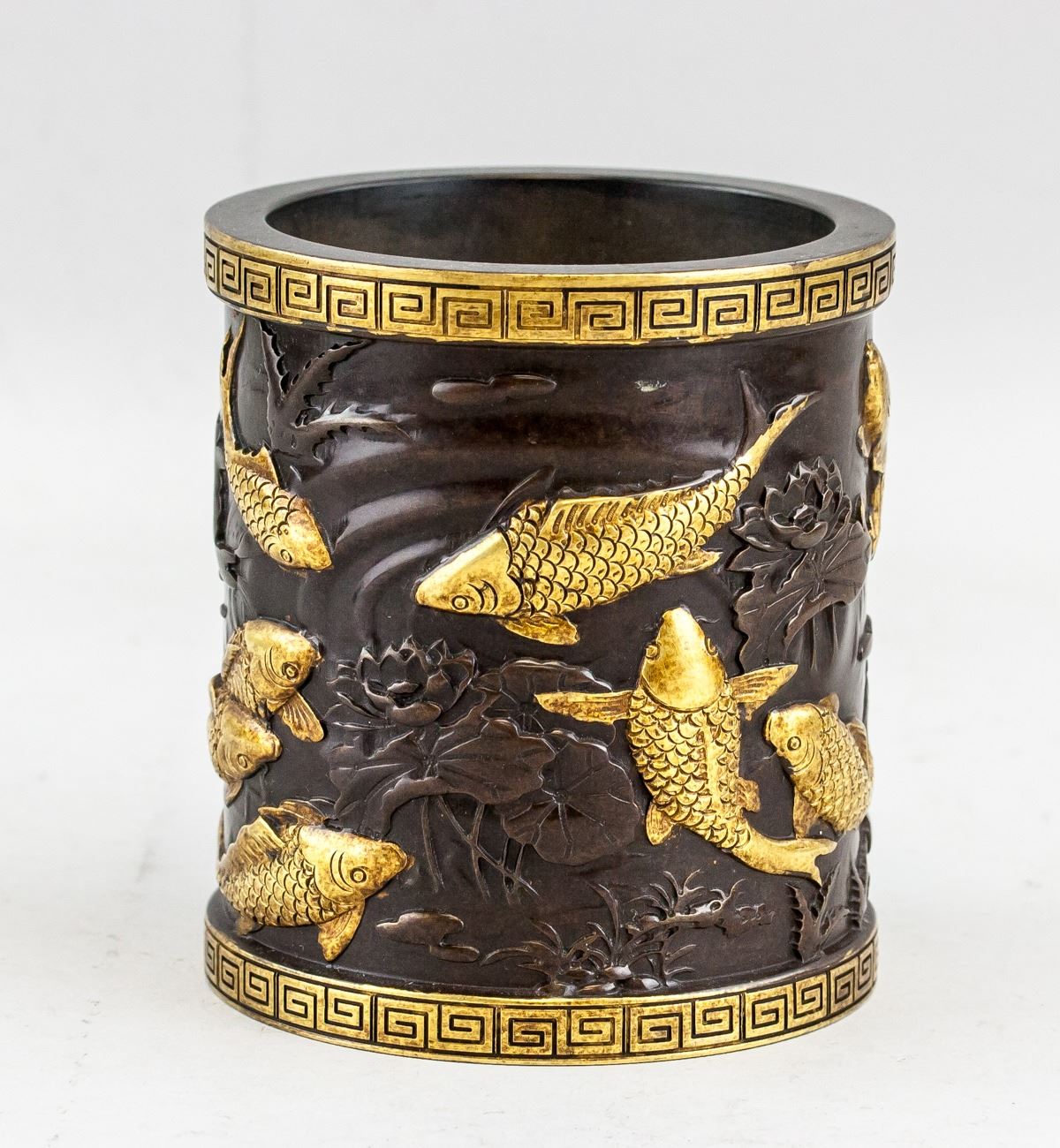 Chinese bronze brush pot. Of cylinder body. Carved with carps and lotus on surface. Four-character mark on base. 11 x 10 cm, 1929 grams