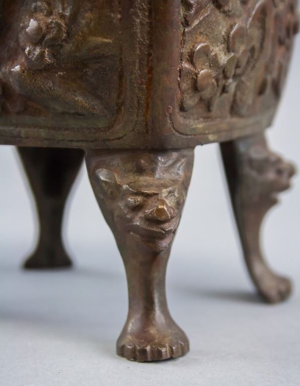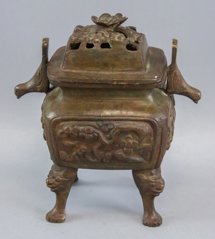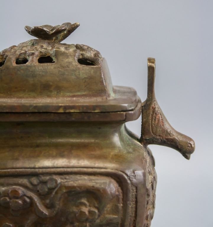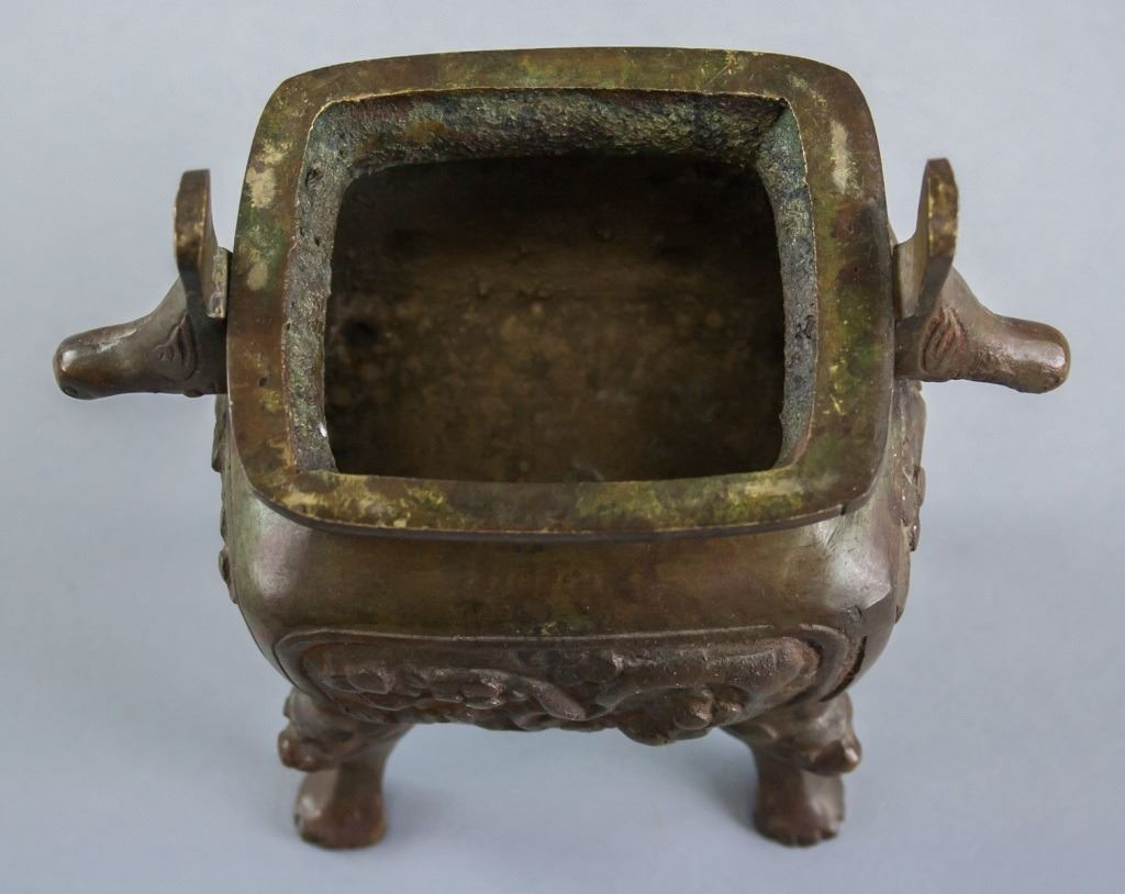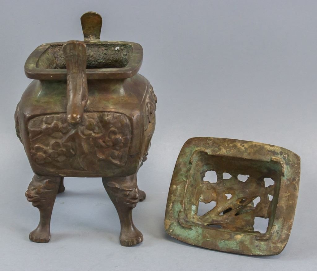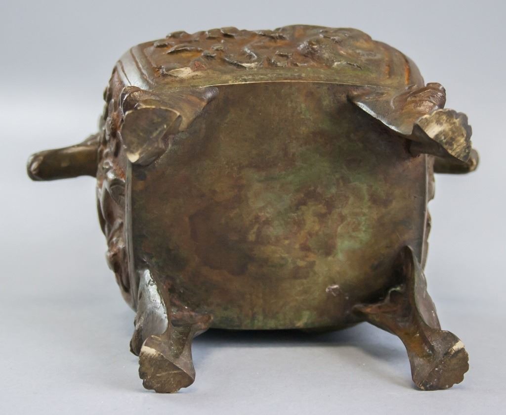 Chinese bronze incense burner. Of square shape with four legs. With lid. Carved all around and on the legs. 16 x 14 cm, 1210 grams.