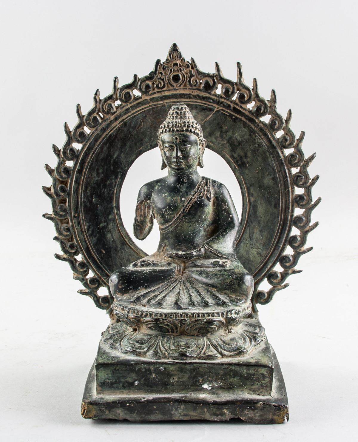 Chinese bronze cast buddha statue, featuring seated Shakyamuni Buddha on lotus pedal base, with aurora, 23 x 19 cm, 981 grams