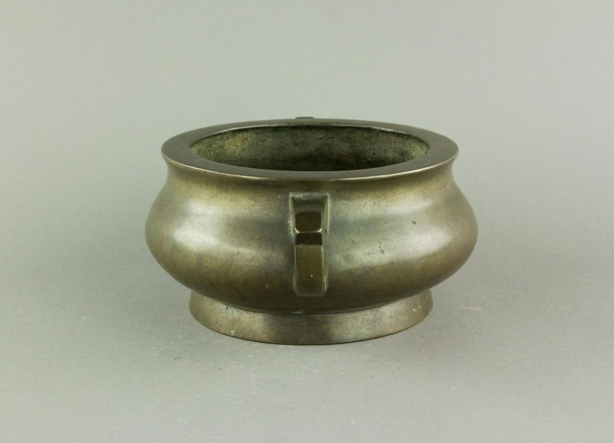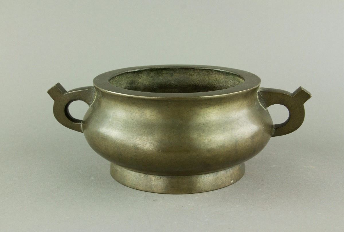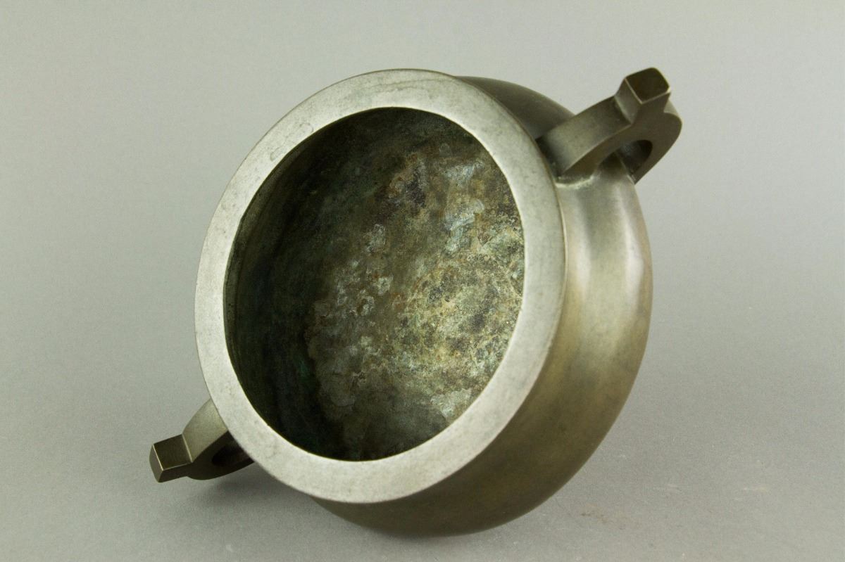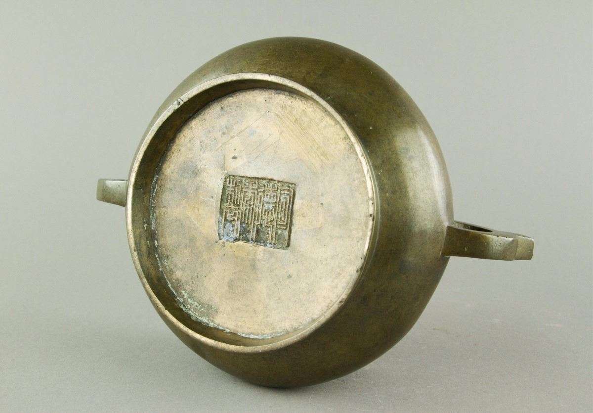Chinese bronze censer; of compressed globular body flanked by double hoop handles; four-character Xuande mark on base; H: 8.5 cm, W: 26 cm. 1371 grams