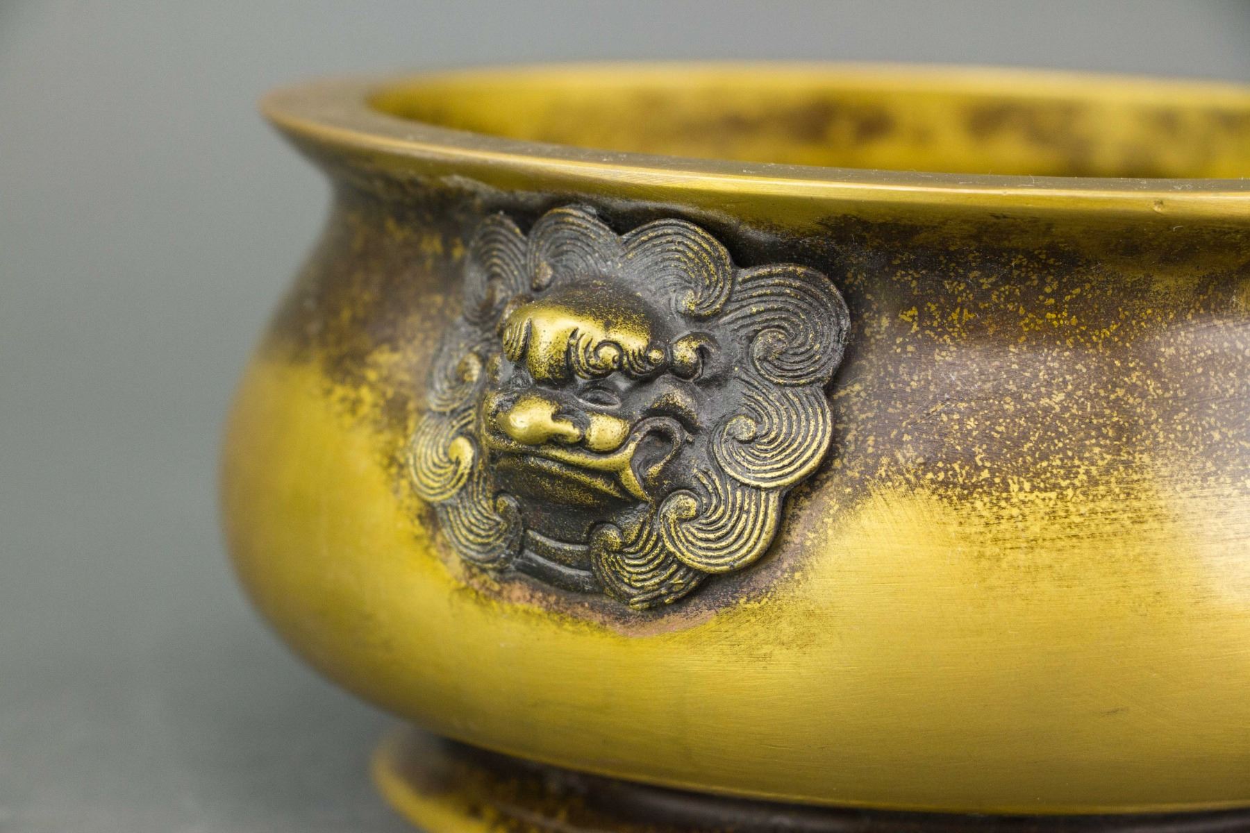 Chinese bronze censer; of compressed globular body with splayed mouth and foot rim; flanked with two lion head handles; four-character Yu Tang Qing Wan mark on base; H: 8 cm, D: 18 cm, 1724 grams
