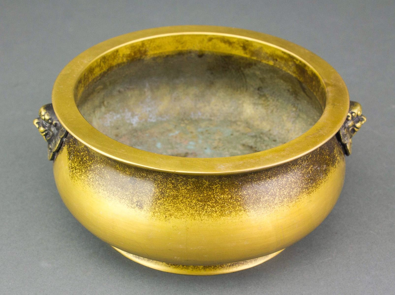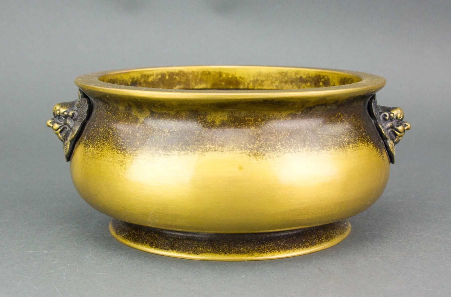 Chinese bronze censer; of compressed globular body with splayed mouth and foot rim; flanked with two lion head handles; four-character Yu Tang Qing Wan mark on base; H: 8 cm, D: 18 cm, 1724 grams