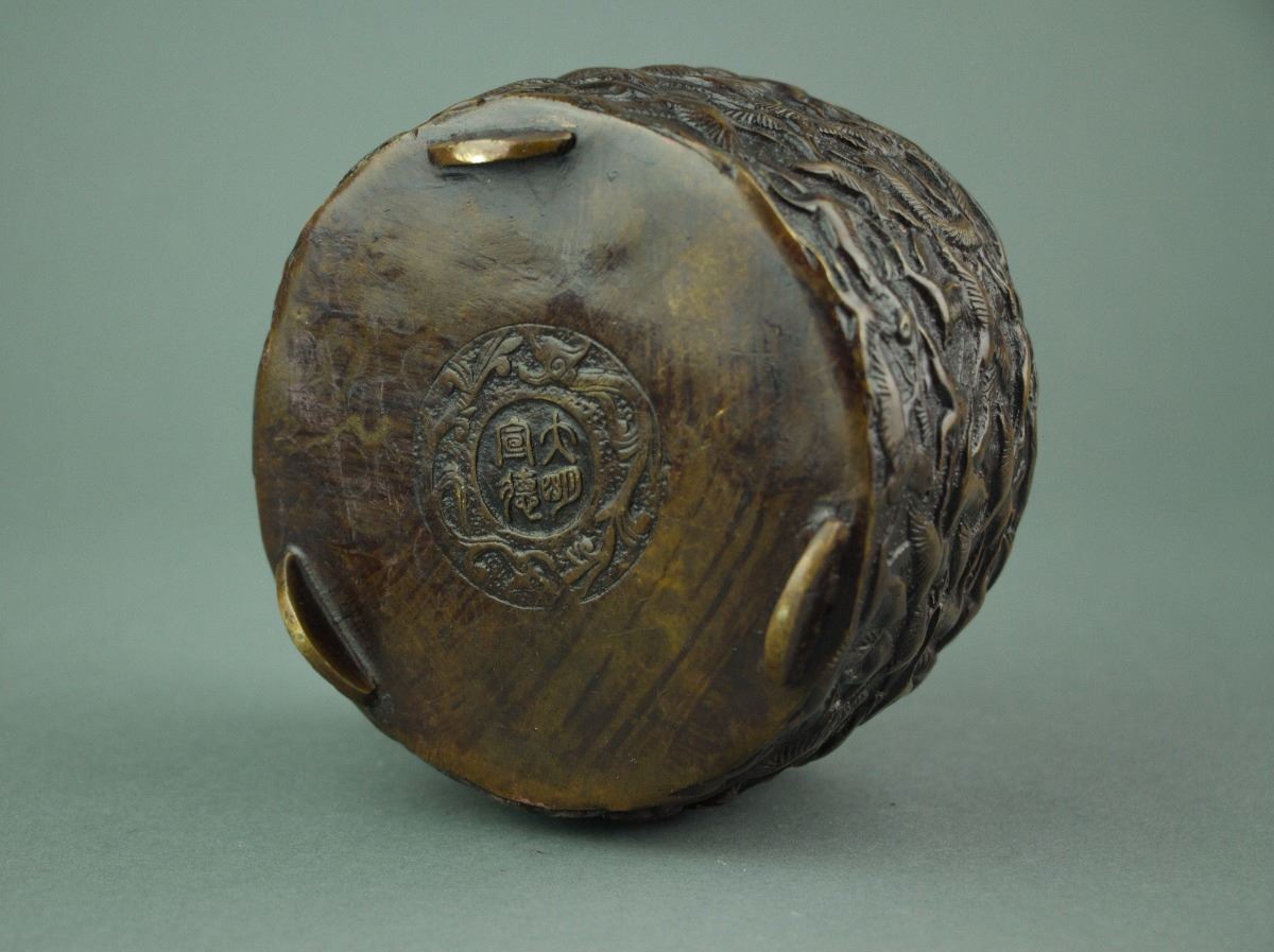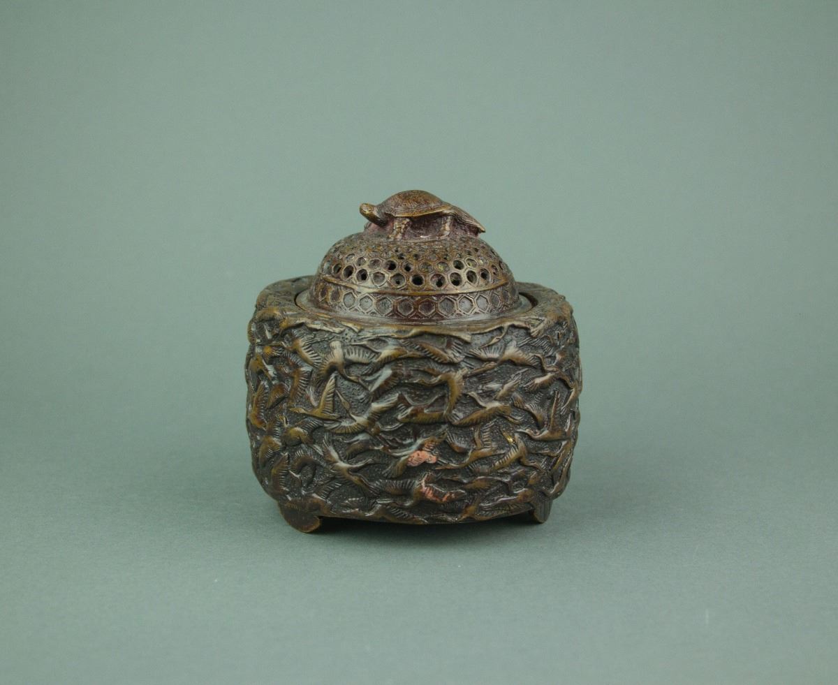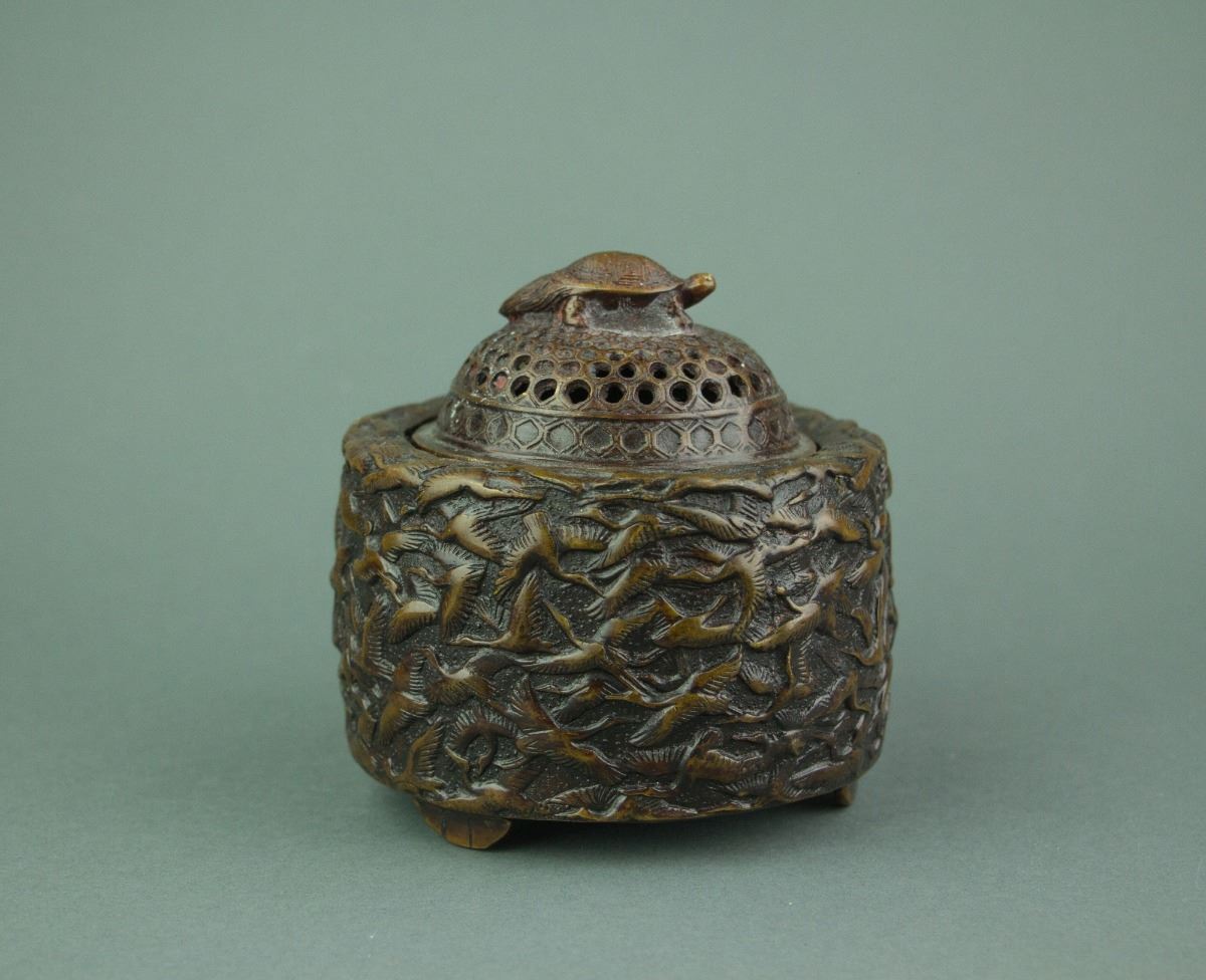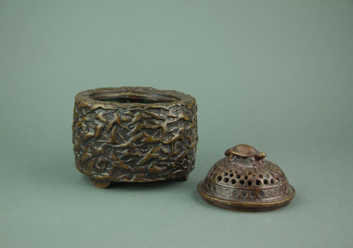 Chinese bronze censer; of cylindrical body with domed openwork cover; supported on three short feet; the body carved in low relief with a hundred of cranes; four-character Ming Xuande mark on base; H: 12 cm, W: 11 cm, 808 grams