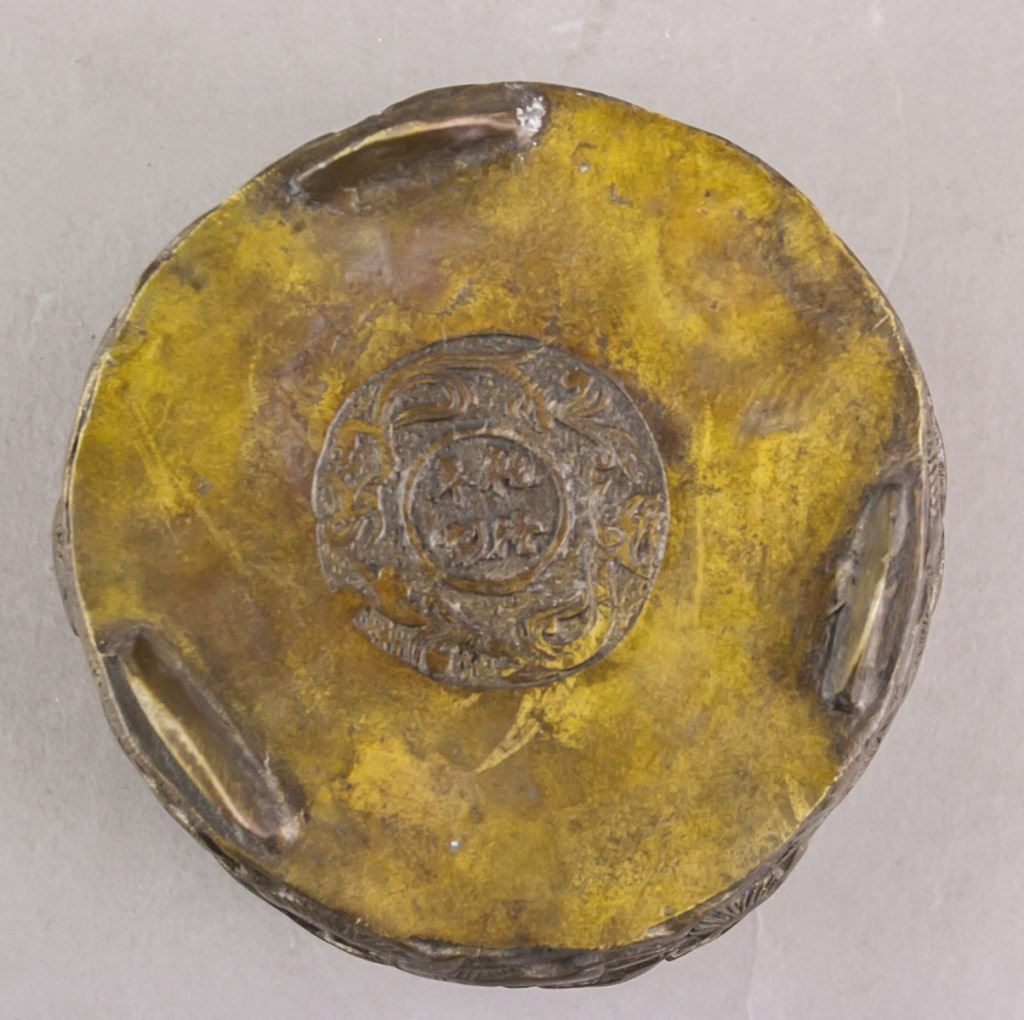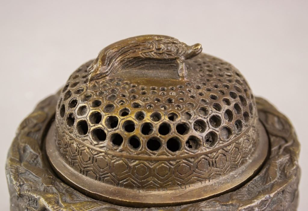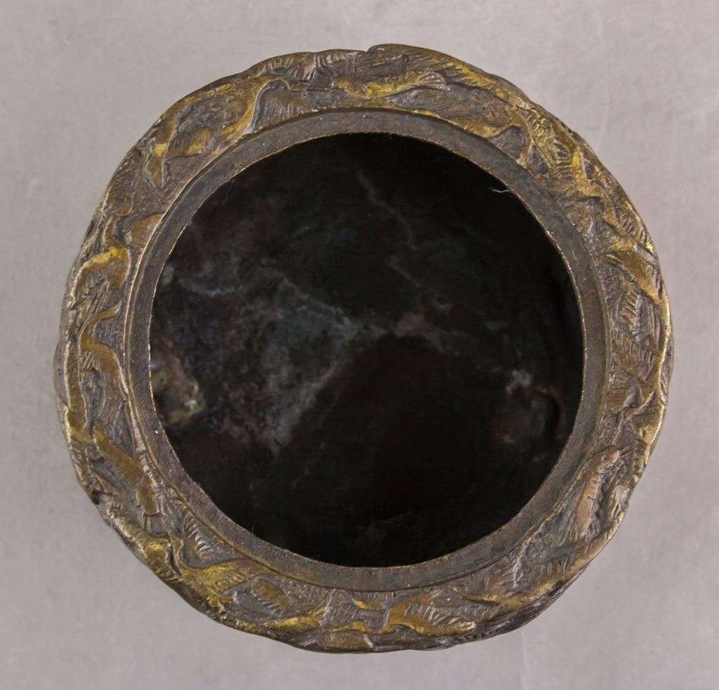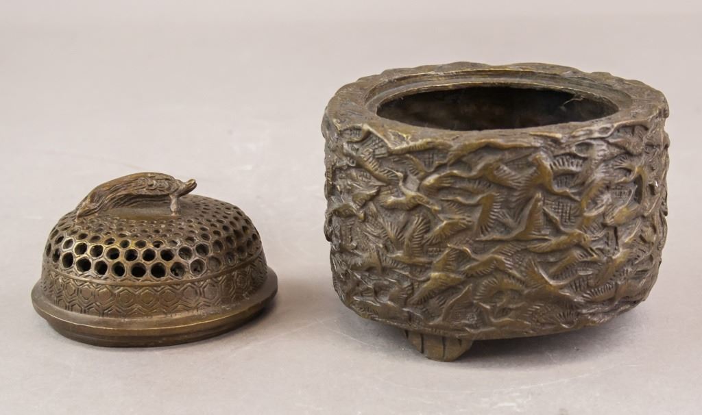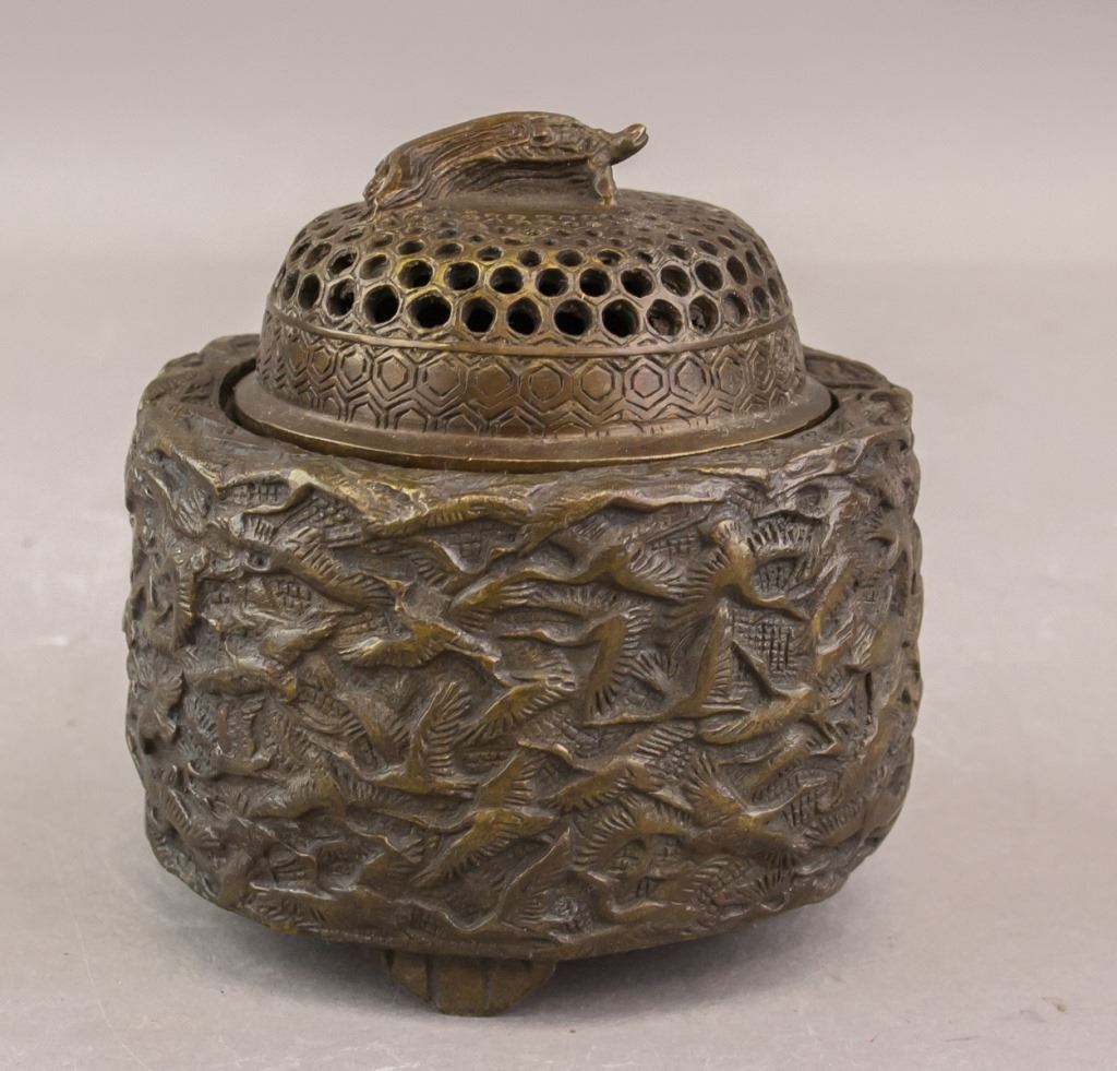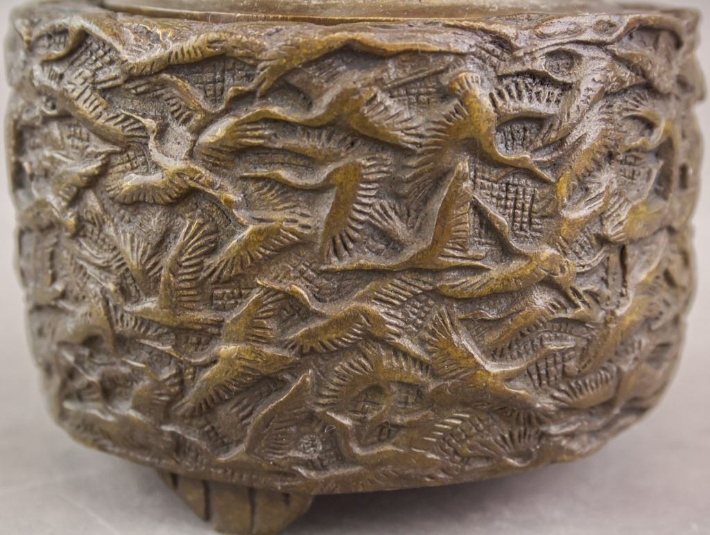 Chinese bronze censer. Of burnished brass tone. With a multitude of flying birds. With turtle on lid. Four character Qianlong mark on base. 11 x 12 cm, 743 grams.