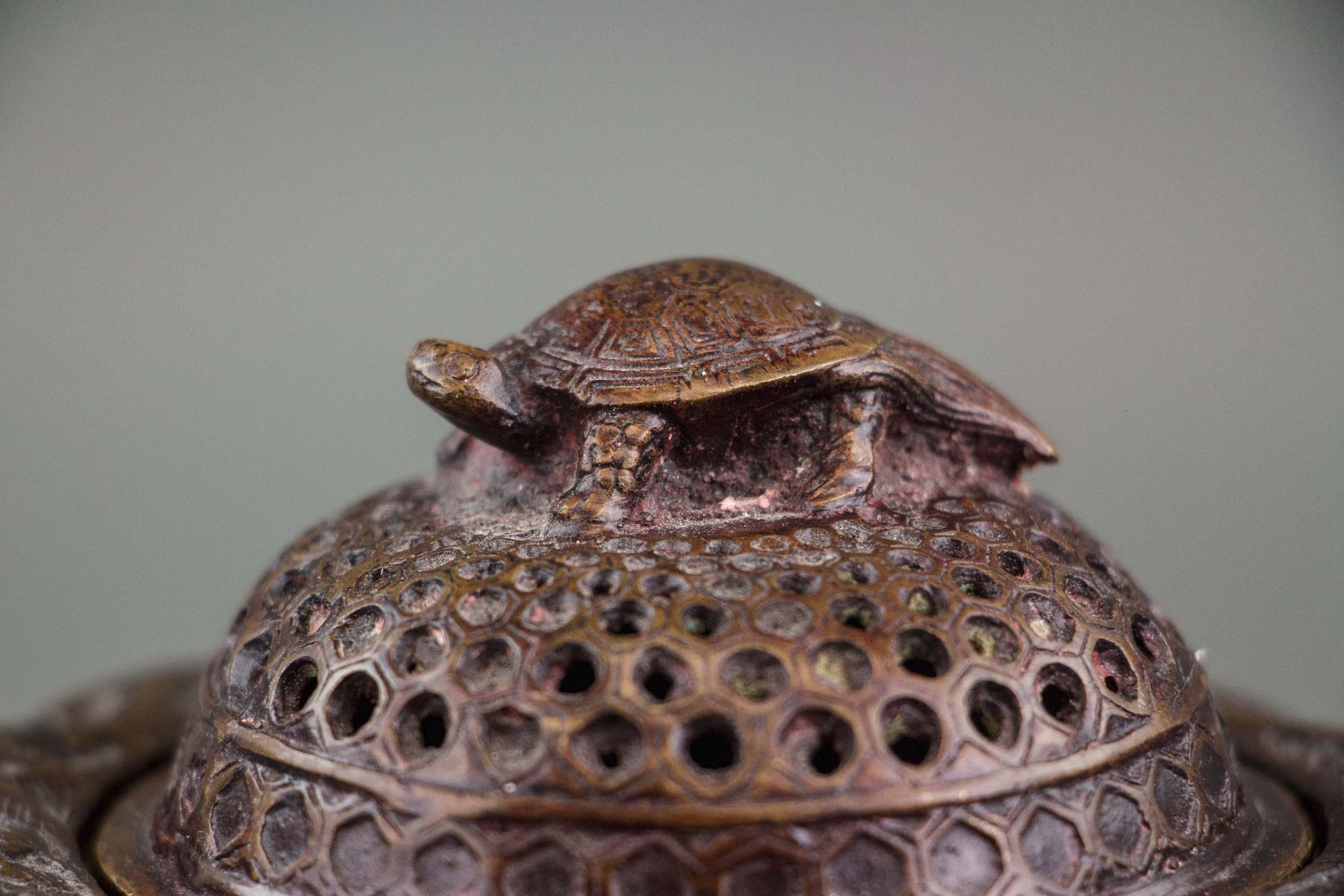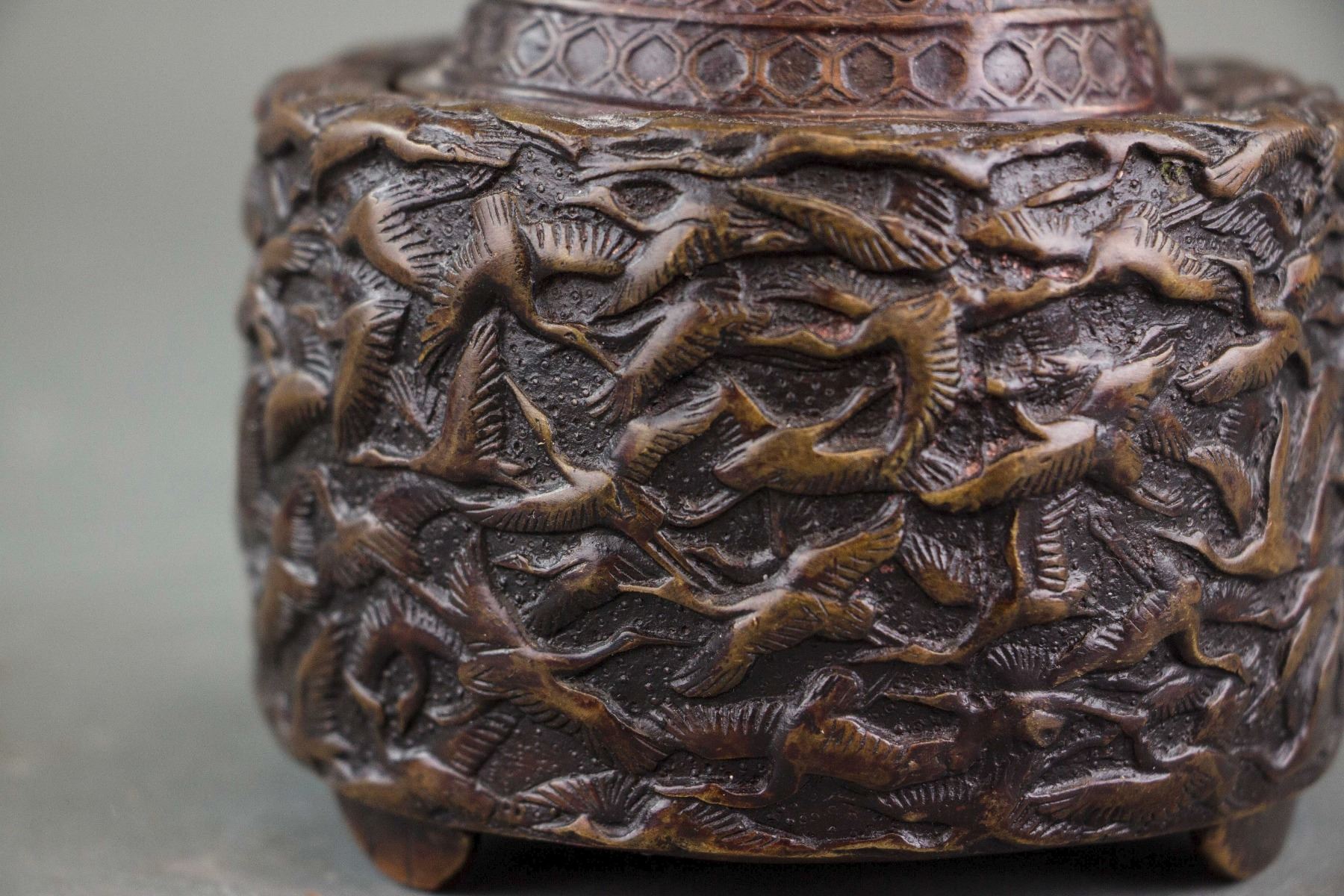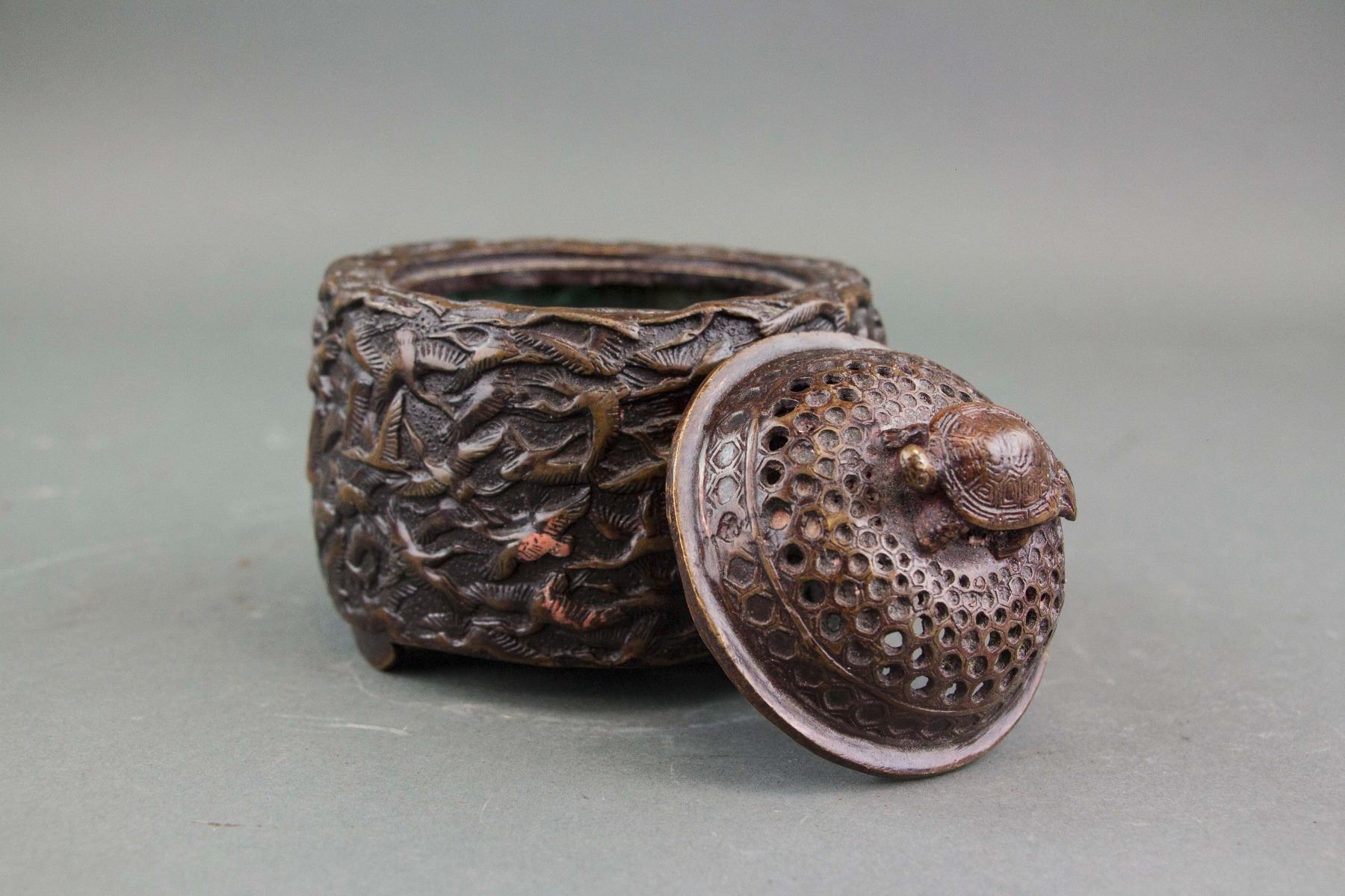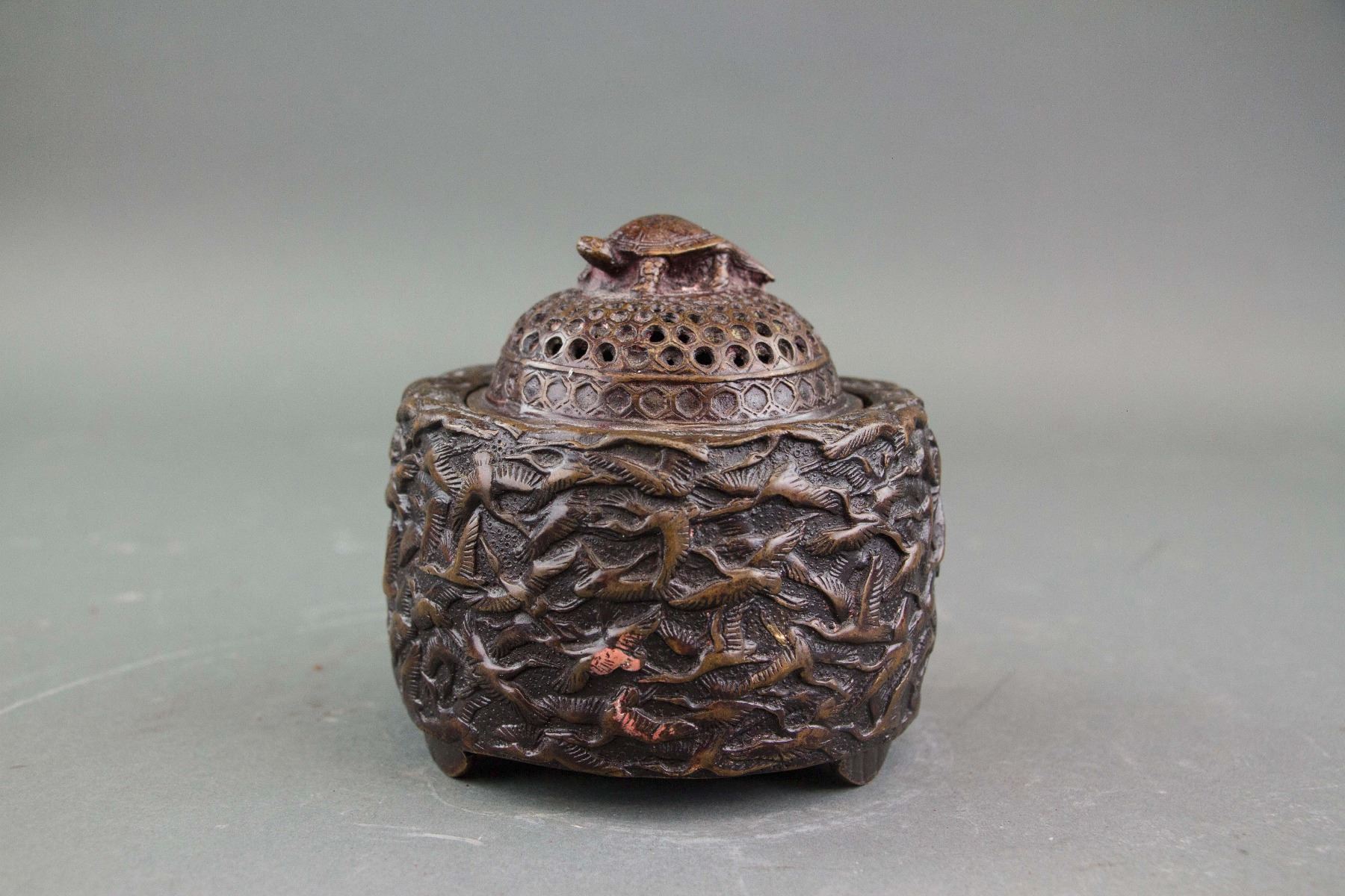 Chinese bronze censer; of cylinder form body; cover with openwork carved holes and turtle form knob; body carved with low relief carved flying cranes; four-character Xuande mark on base; H: 12 cm, D: 11 cm, 807 grams