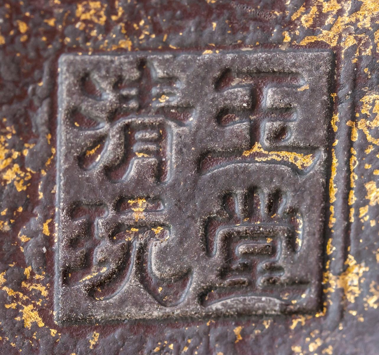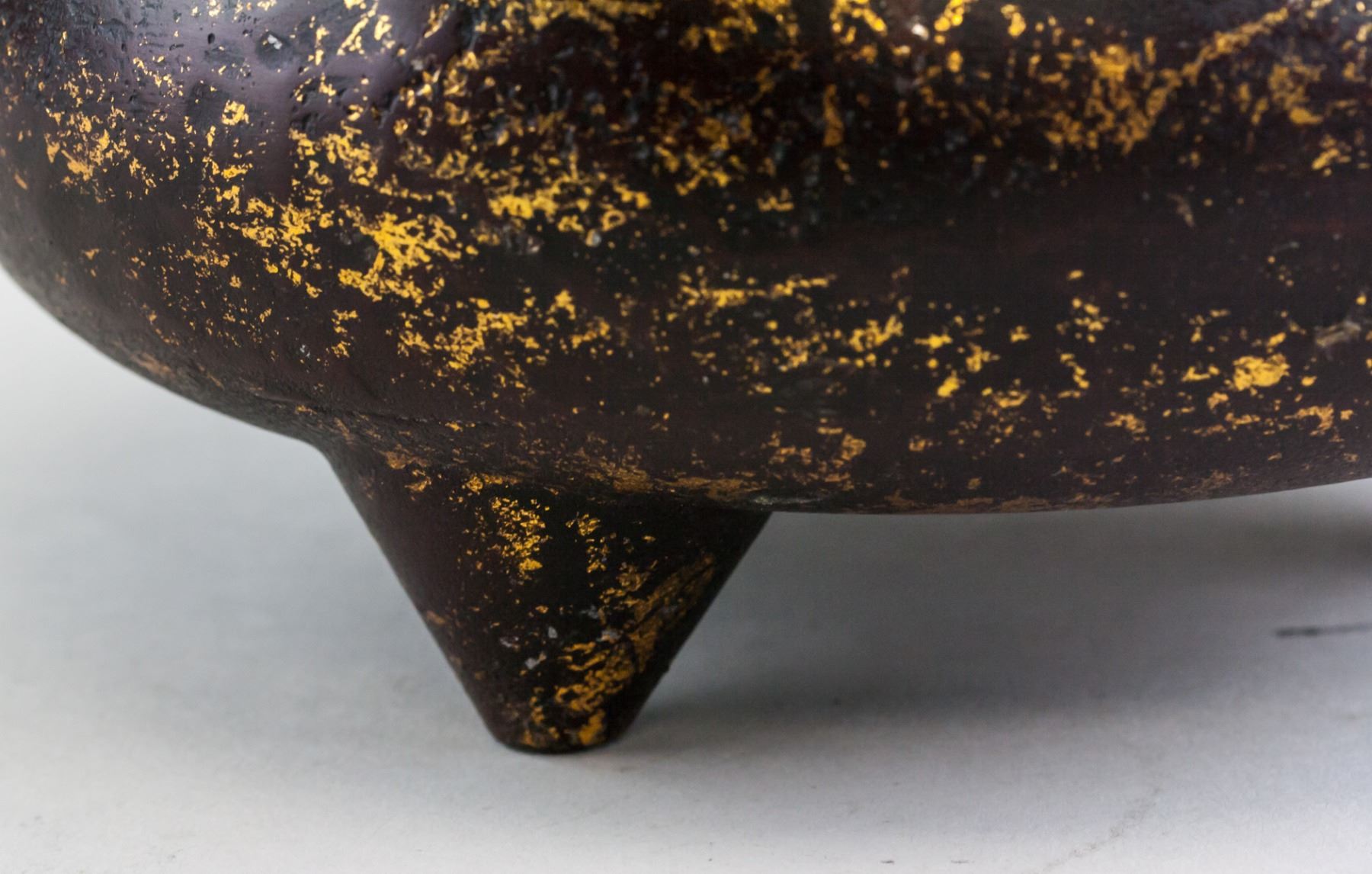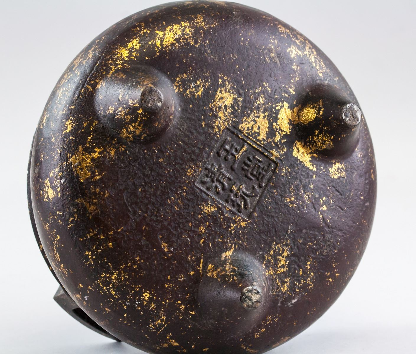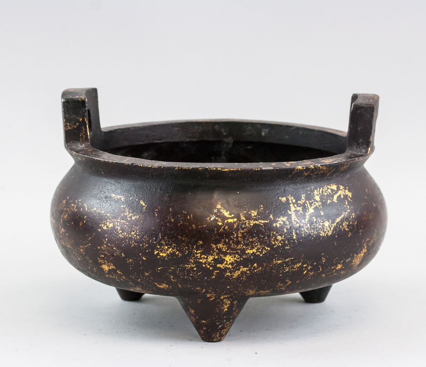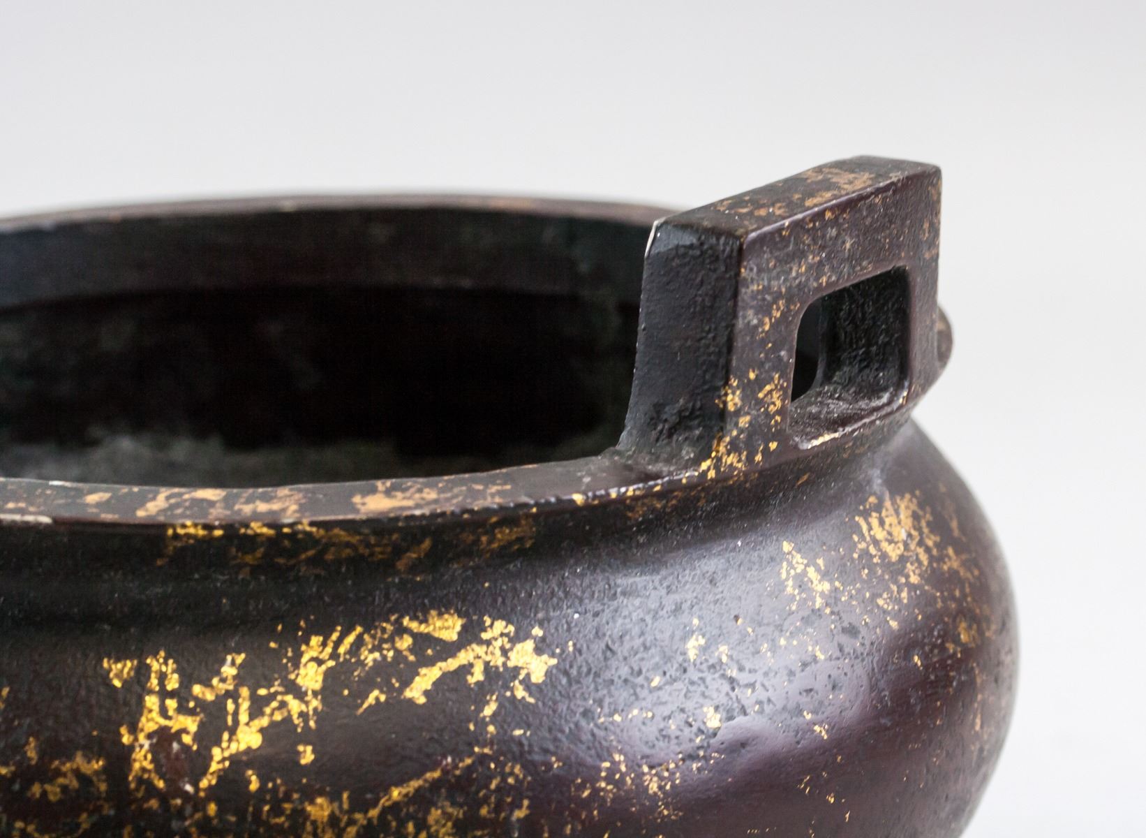 Chinese bronze censer. Of compressed globular body. Flanked with two square handles. Supported on three legs. With gold splash on surface. Four-character Yu Tang Qing Wan mark on base. 12 x 20 cm, 2375 grams