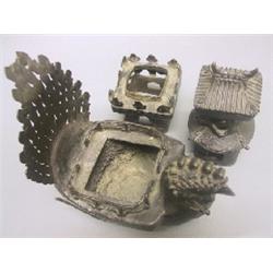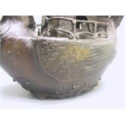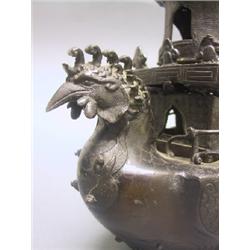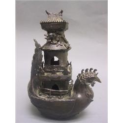 A well used 3 piece cast bronze censer in the form of a Pagoda resting upon a Phoenix shaped boat with a dragon twisted around the upper section. Signed on the bottom with a Chinese six character mark. Fine condition with minor losses to bronze details. China, 18th-19th C. Ching Dynasty 12 1/4" (31 cm) H.
