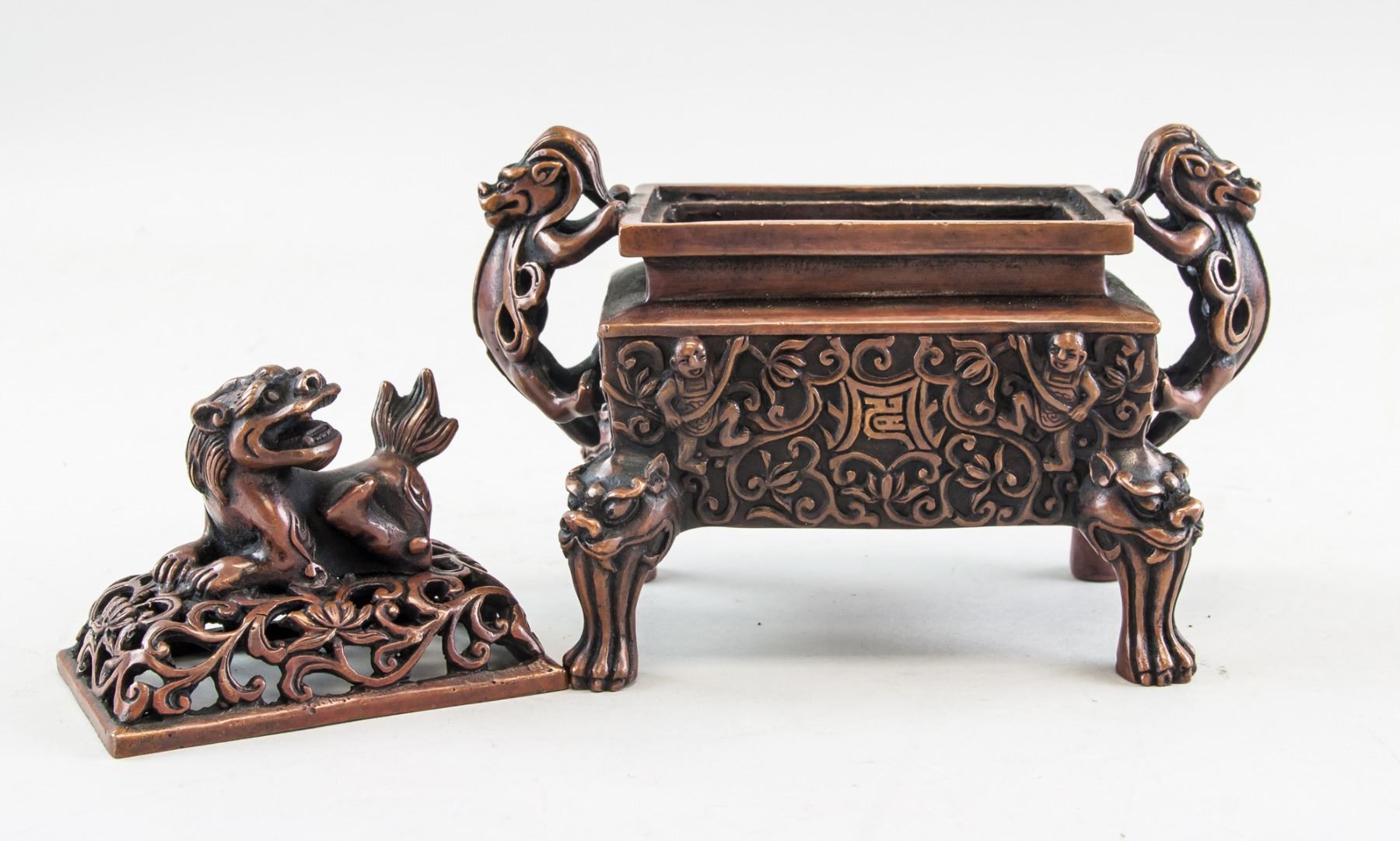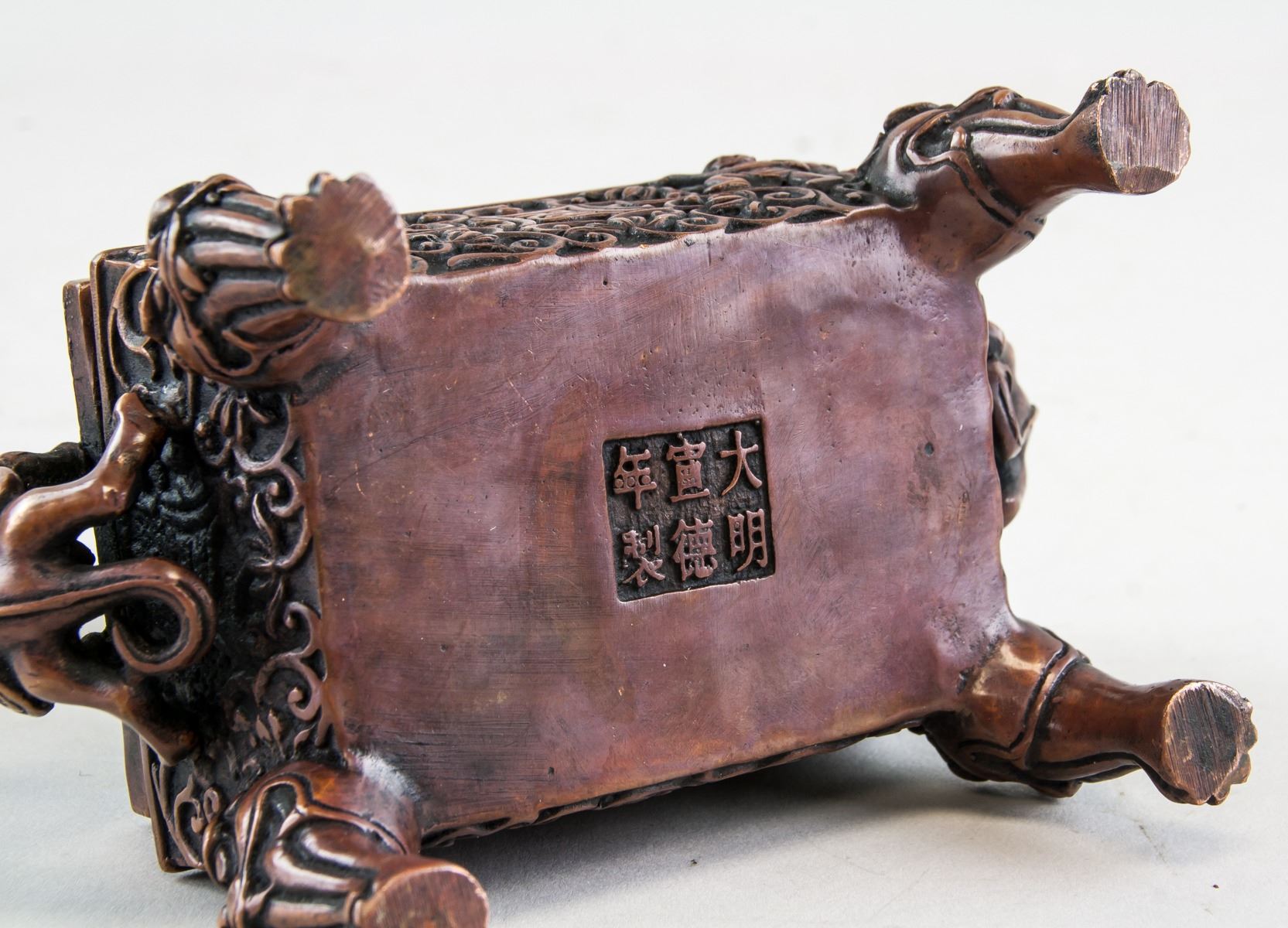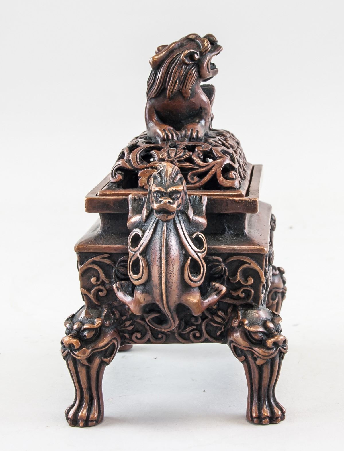 Chinese bronze cast censer, of rectangle shape body, supported on four Suanni form legs, flanked with 2 beast form handles, six-character Ming Xuande mark on base, 12 x 16 cm, 854 grams