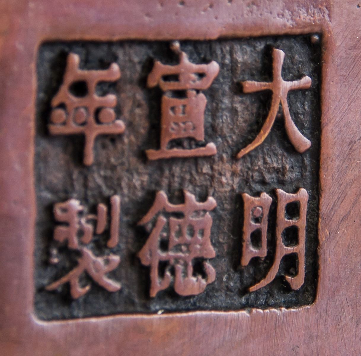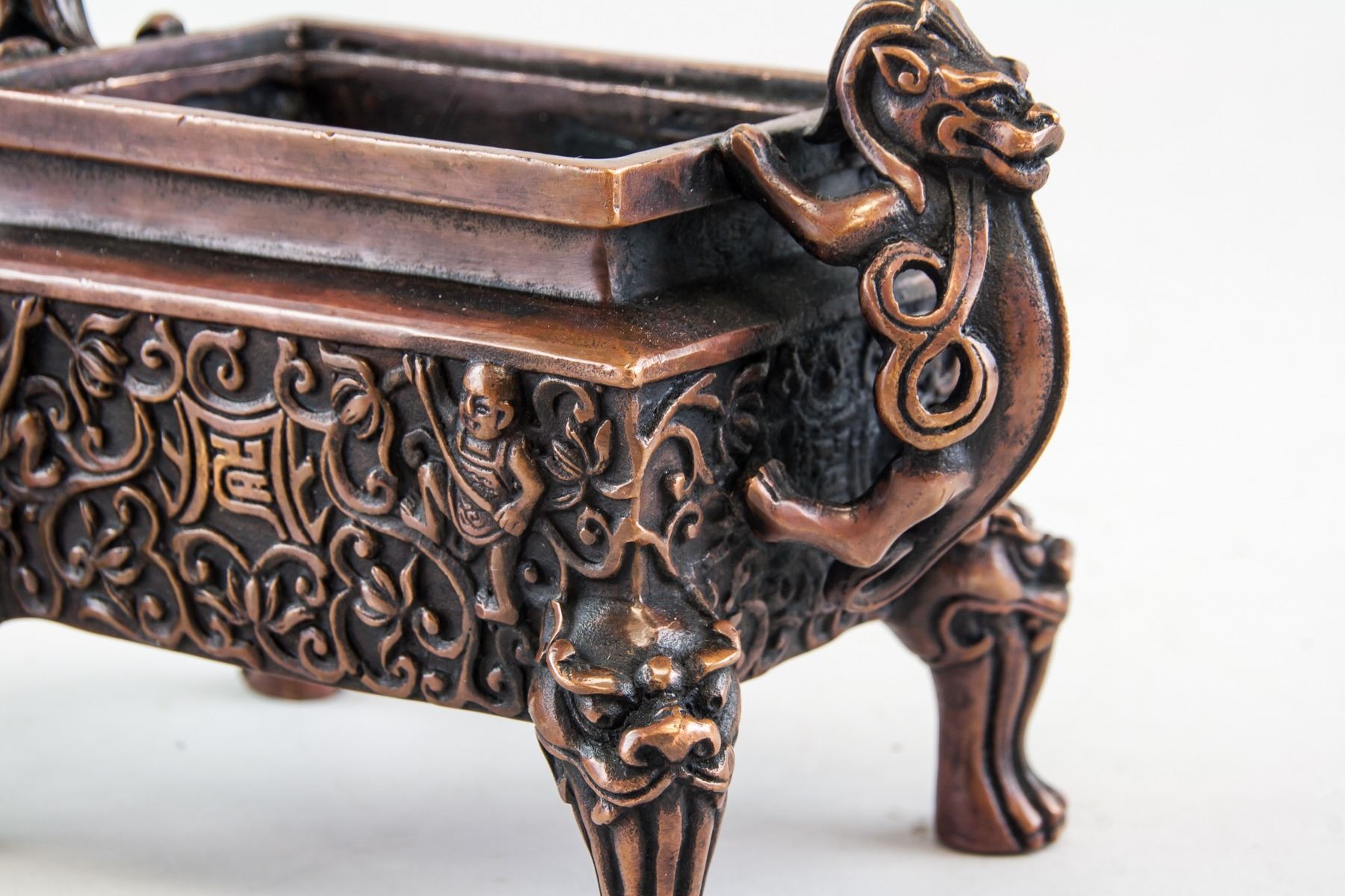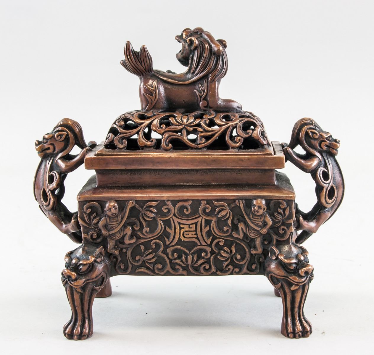 Chinese bronze cast censer, of rectangle shape body, supported on four Suanni form legs, flanked with 2 beast form handles, six-character Ming Xuande mark on base, 12 x 16 cm, 854 grams