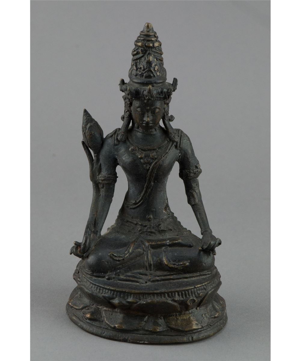 Chinese bronze figure of Buddha; seated on lotus plinth with hands in mudra and holding a scepter; serene expression adorned with tiered crowned; H: 17 cm, W: 9 cm, 479 grams