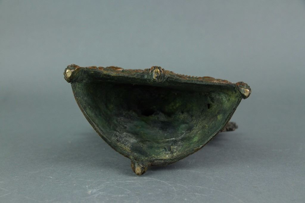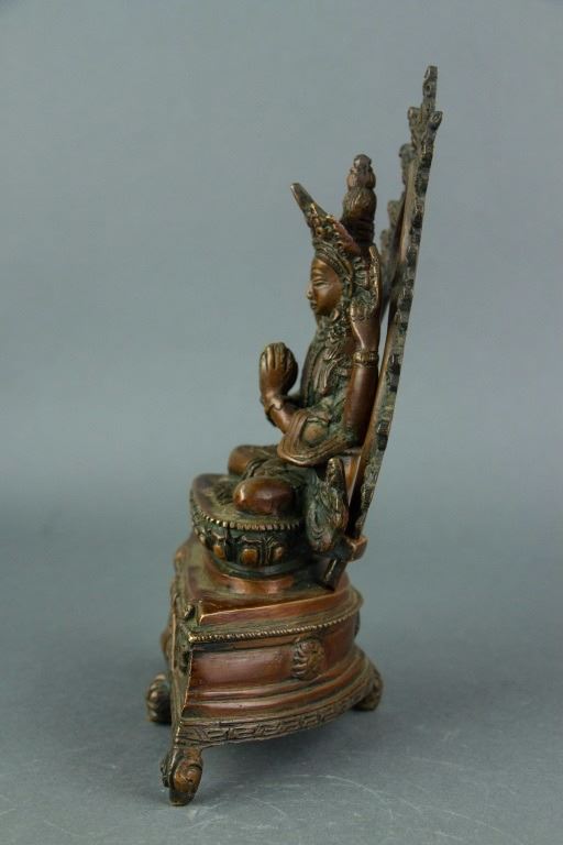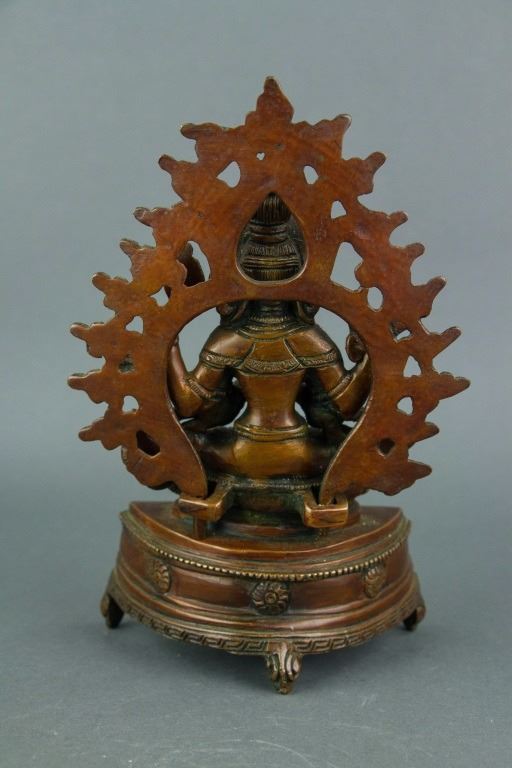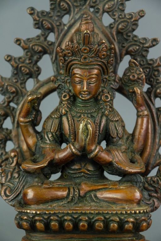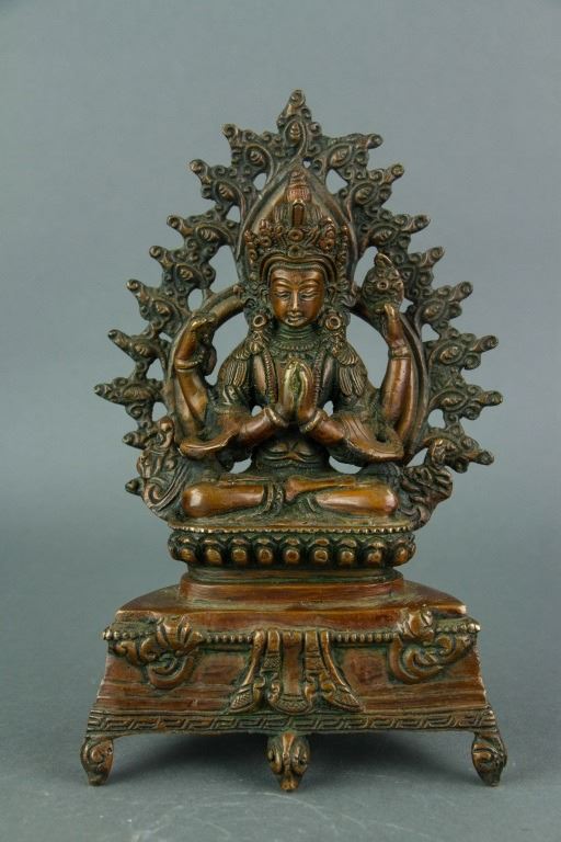 Chinese bronze cast Guanyin; of four arm Guanyin with anjali mudra; sitting on lotus throne with aurora; H: 21 cm, W: 6 cm, L: 12.5 cm, 1615 grams