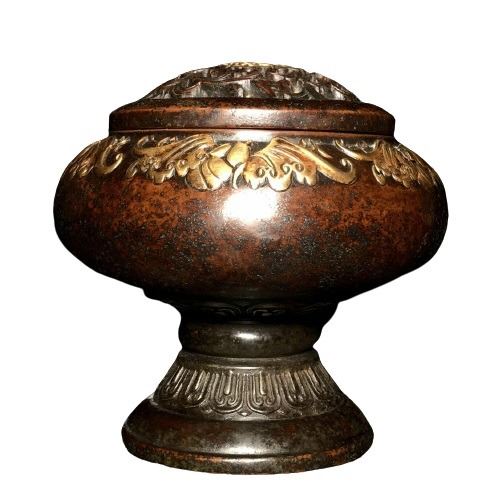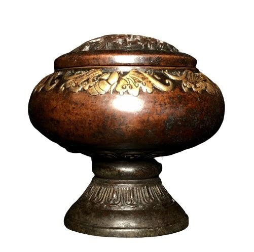 Chinese Bronze Gilt Incense Burner Censer, decorated with flowers pattren. It was created by skilled craftsmen in traditional style with fine handcrafts. the handwork is very fine with incredible detailling. This is a great piece of valuable collection, a valuable personal alter or a very good present. Don't miss out this chance to get it .Good luck to you!W 15.2 cm + H 14.7 cmProvenance: A Private Collector Collection From "London"