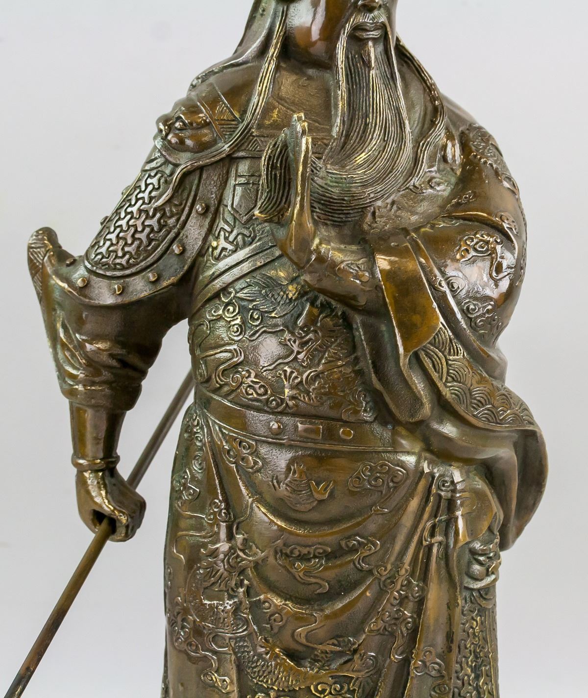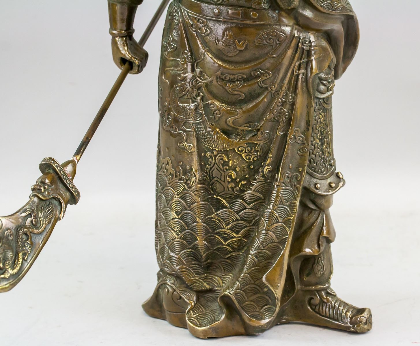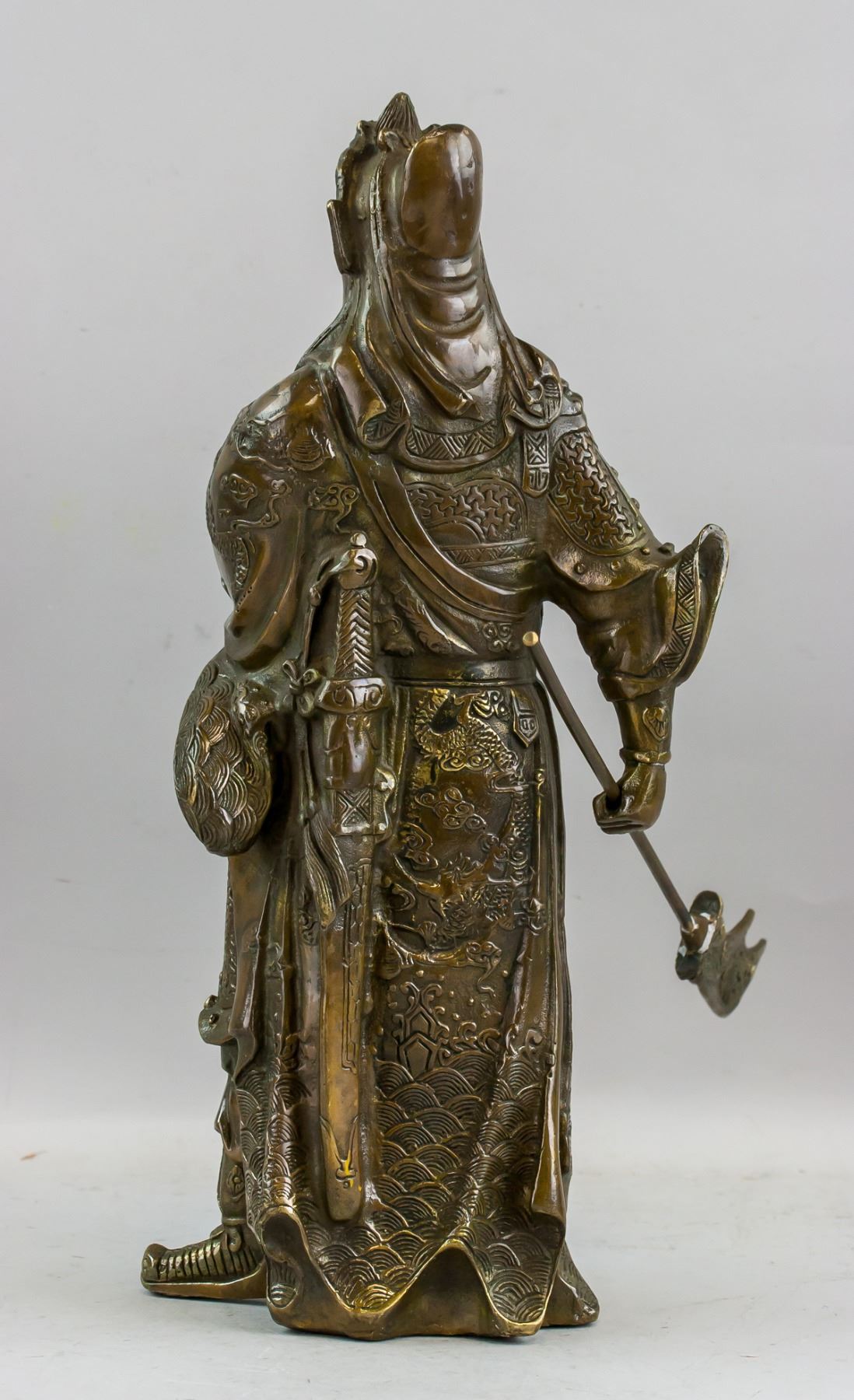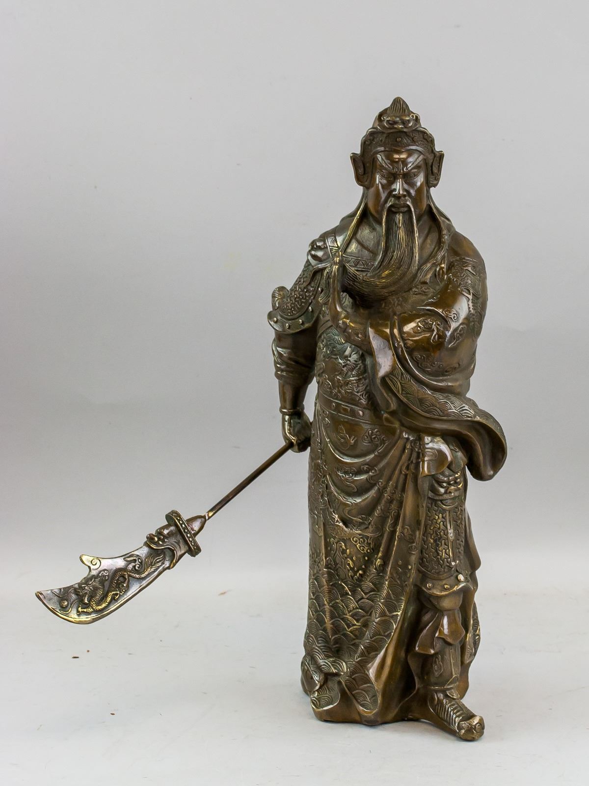 Chinese bronze cast statue. Featuring standing Guanyu holding the Green Dragon Crescent Blade. Four-character Qing dynasty Qianlong mark on base. 39 x 16 cm, 3902 grams
