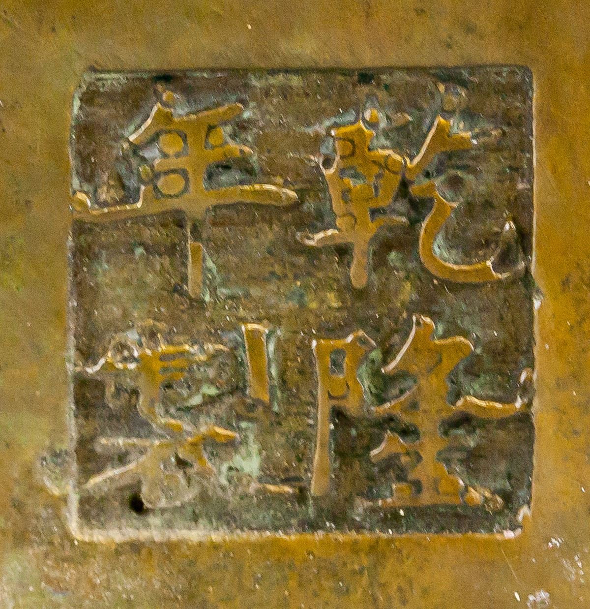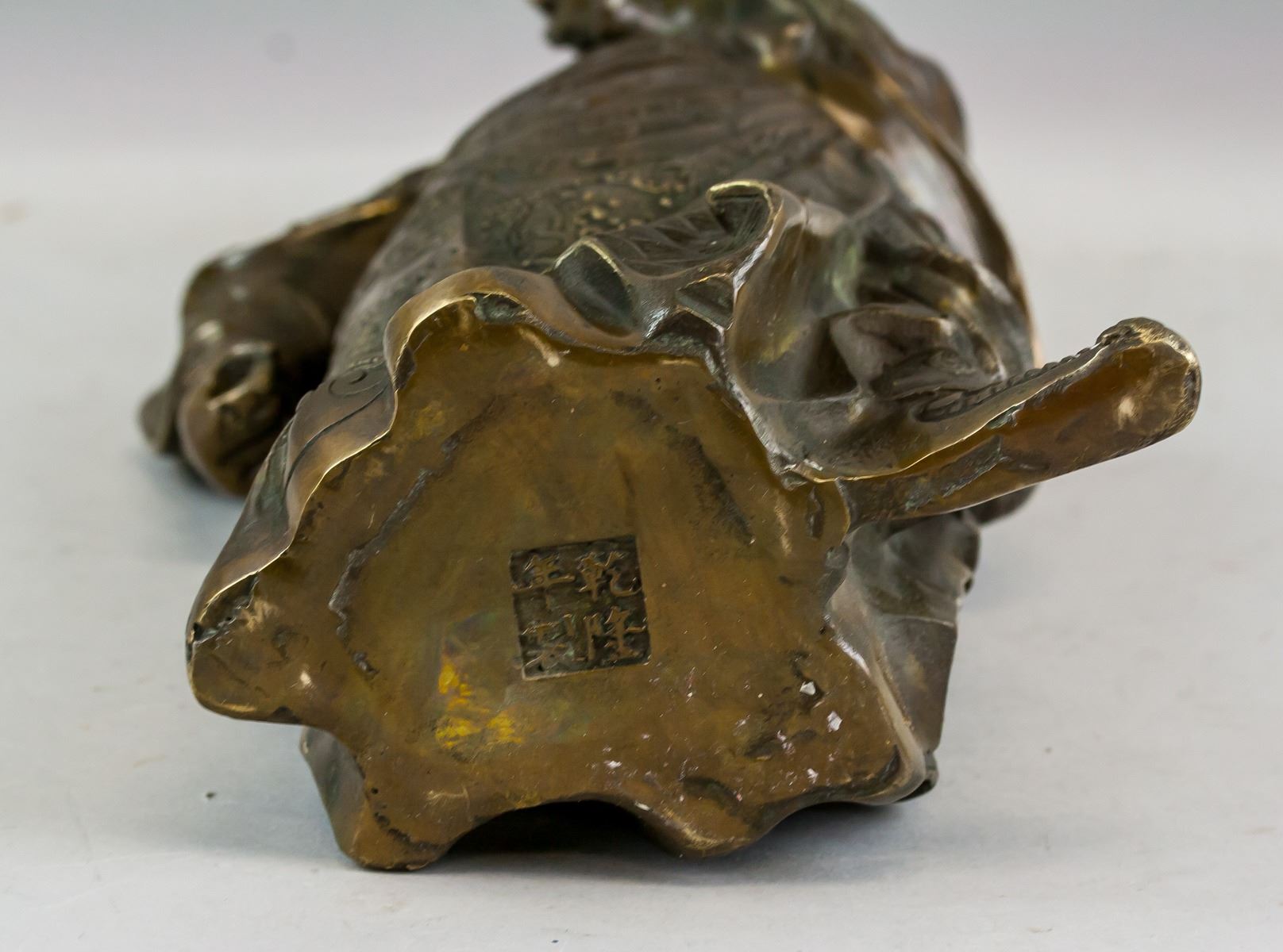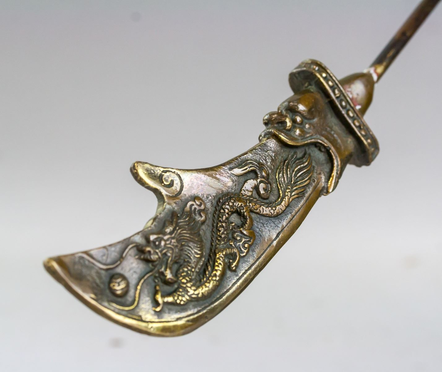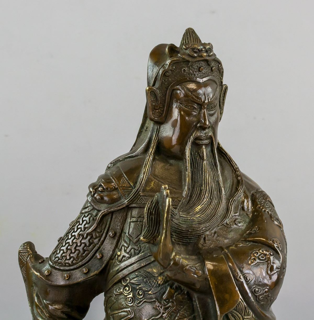 Chinese bronze cast statue. Featuring standing Guanyu holding the Green Dragon Crescent Blade. Four-character Qing dynasty Qianlong mark on base. 39 x 16 cm, 3902 grams