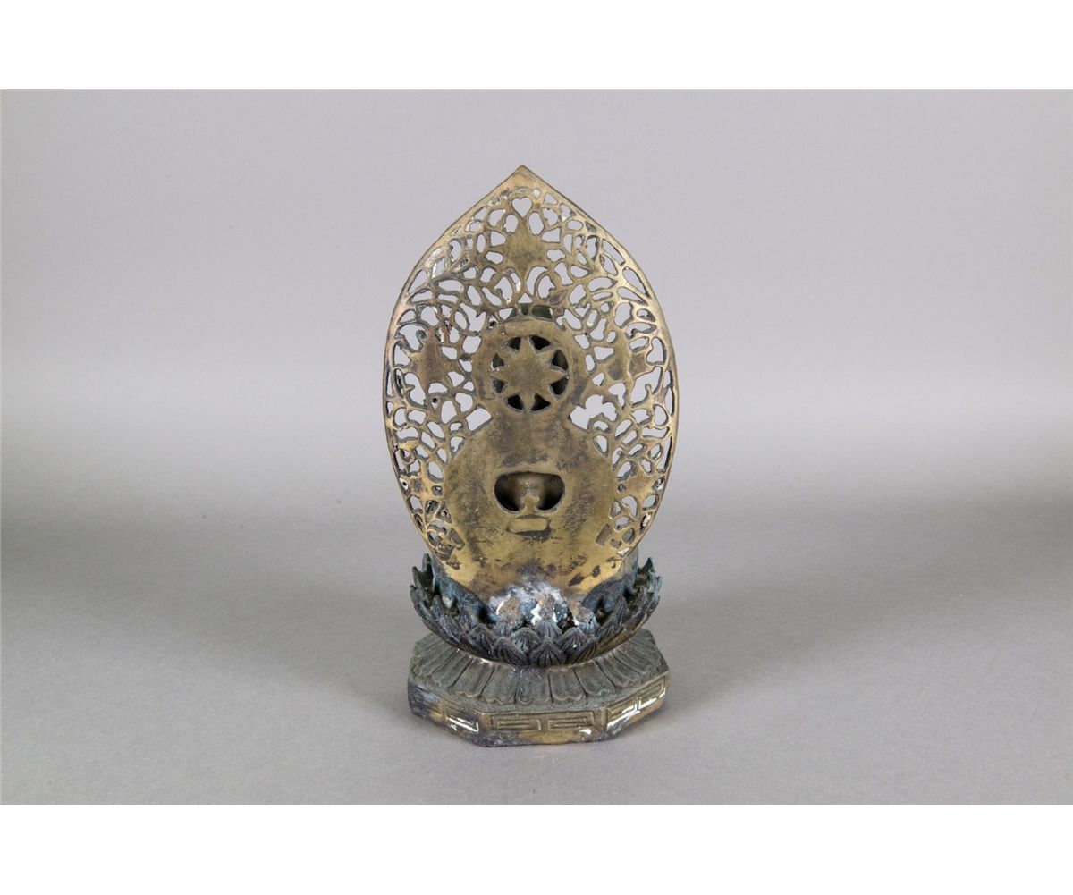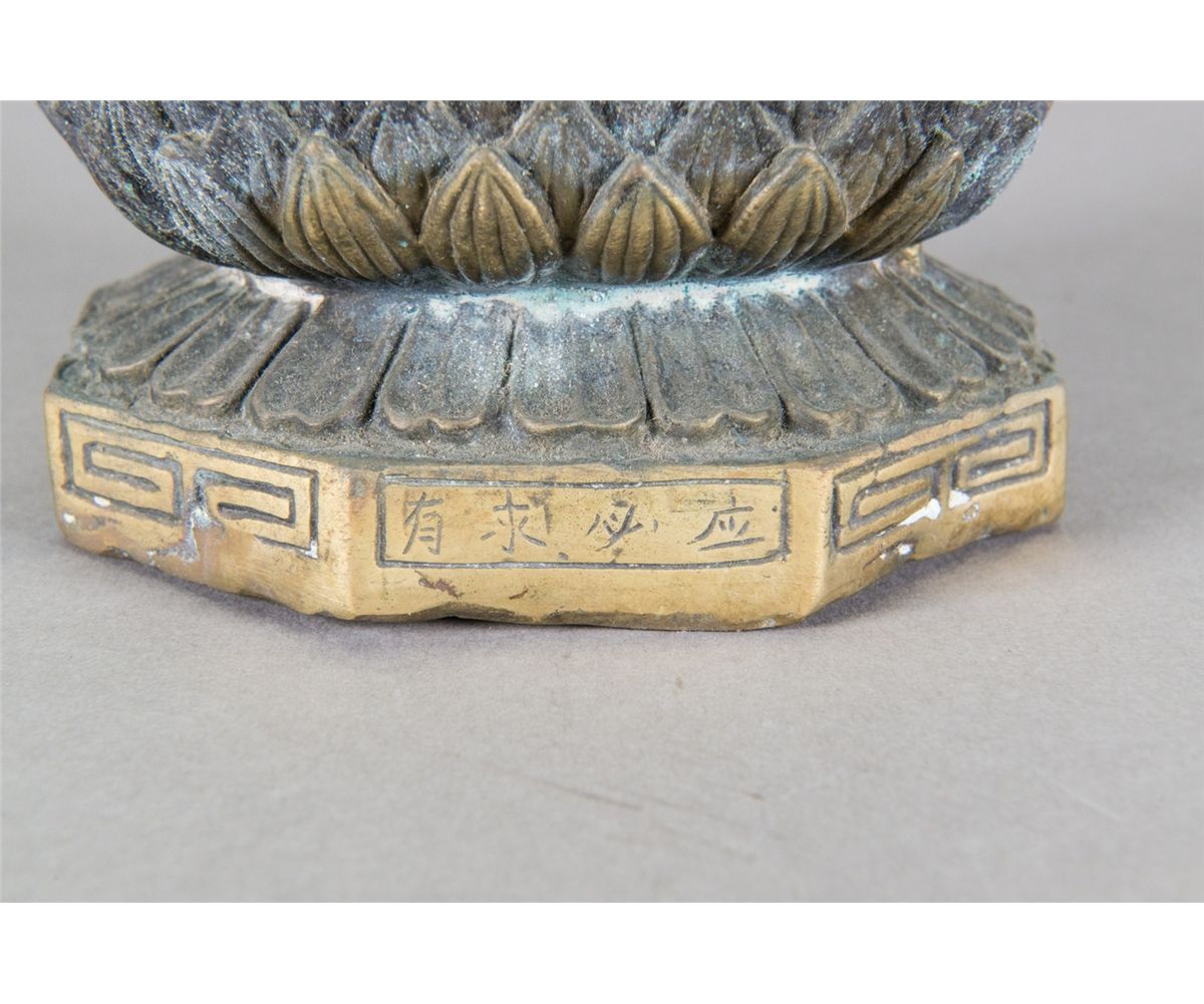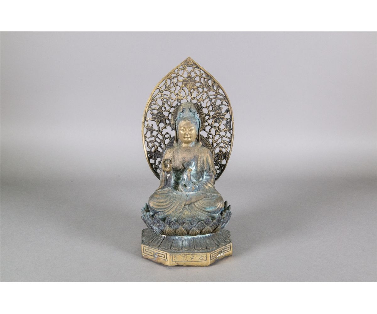 Chinese bronze Guanyin figure; featuring Guanyin with peaceful expression sitting on lotus plinth; H: 26 cm, W: 13 cm, 1631 grams