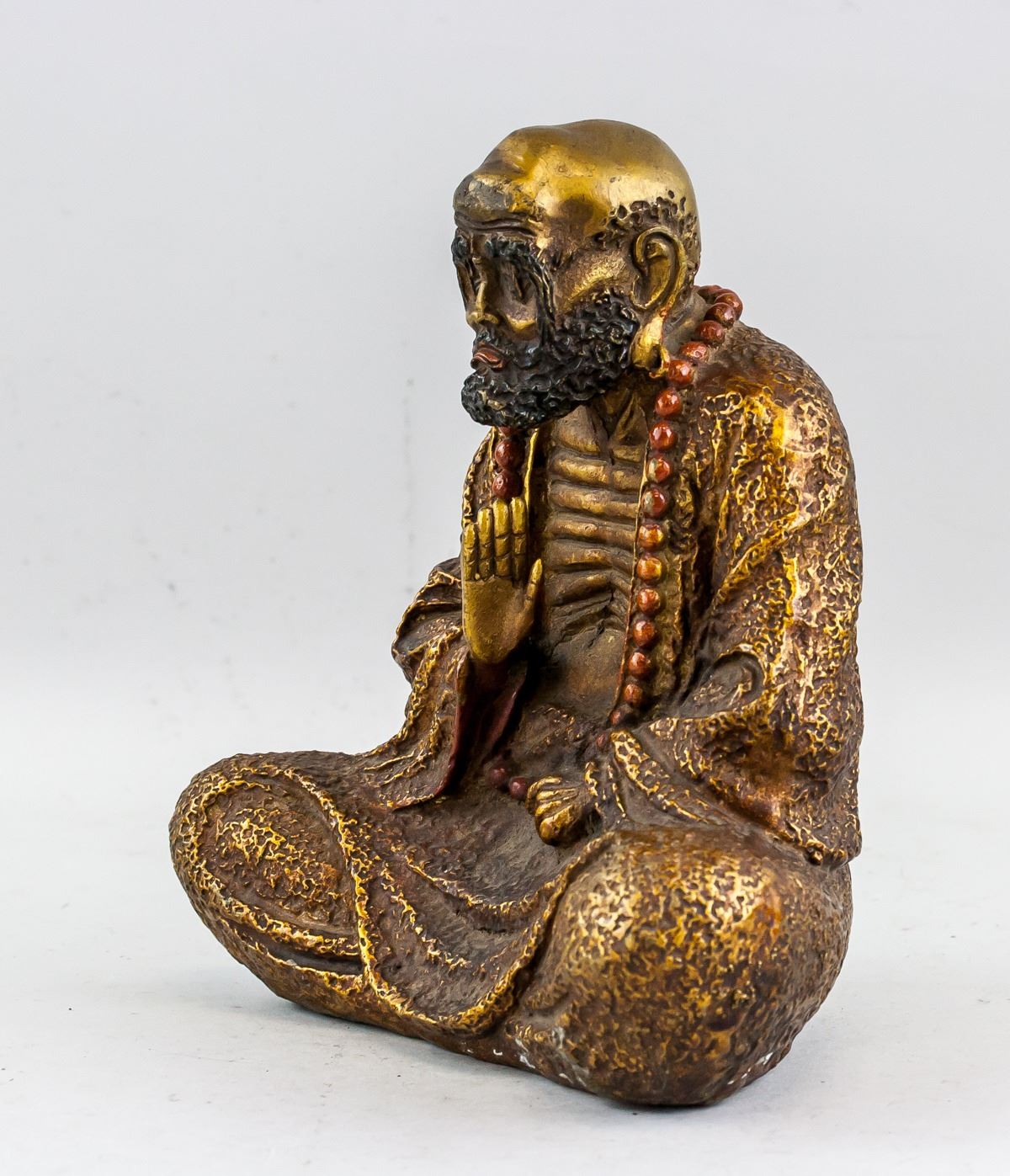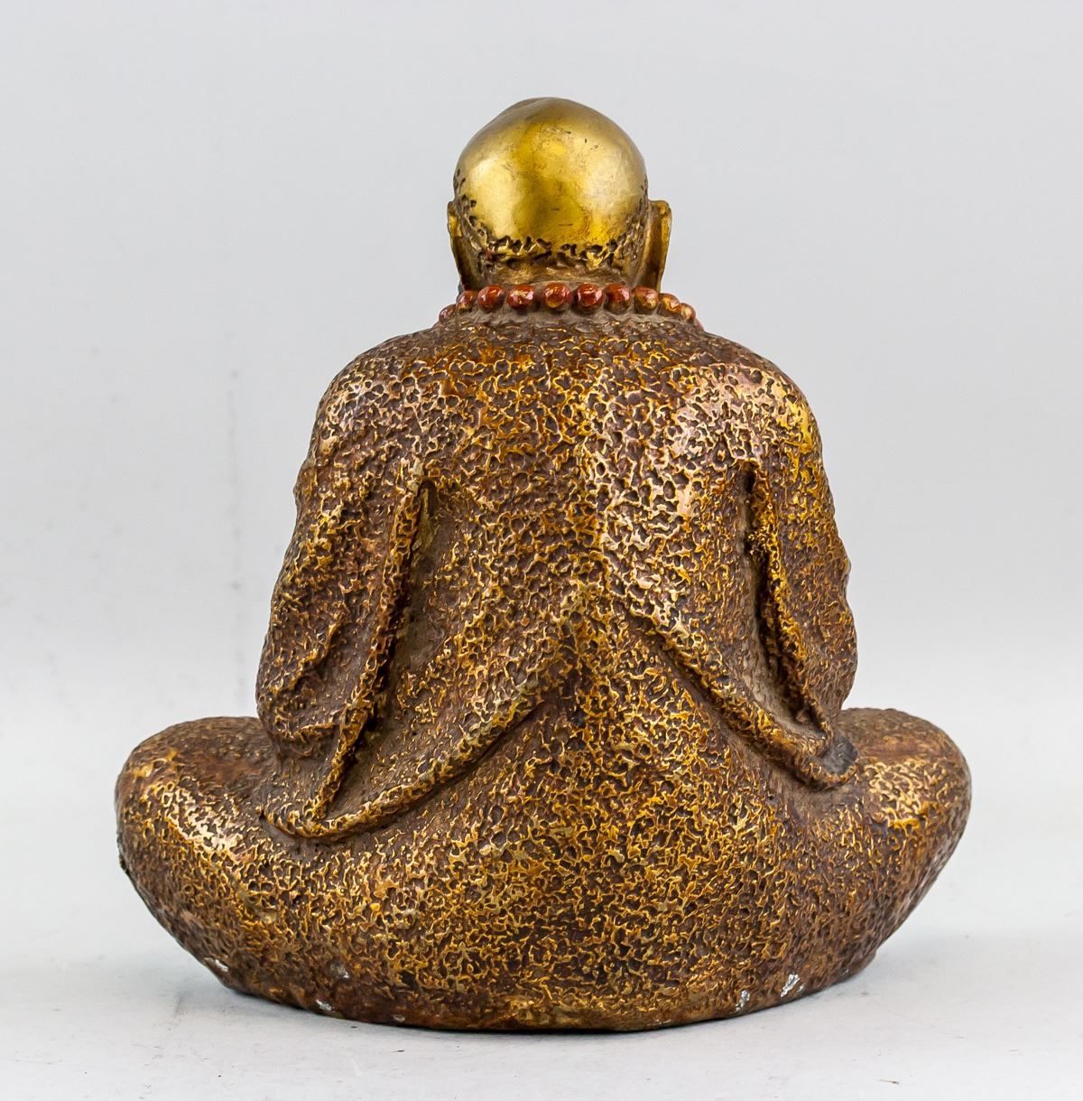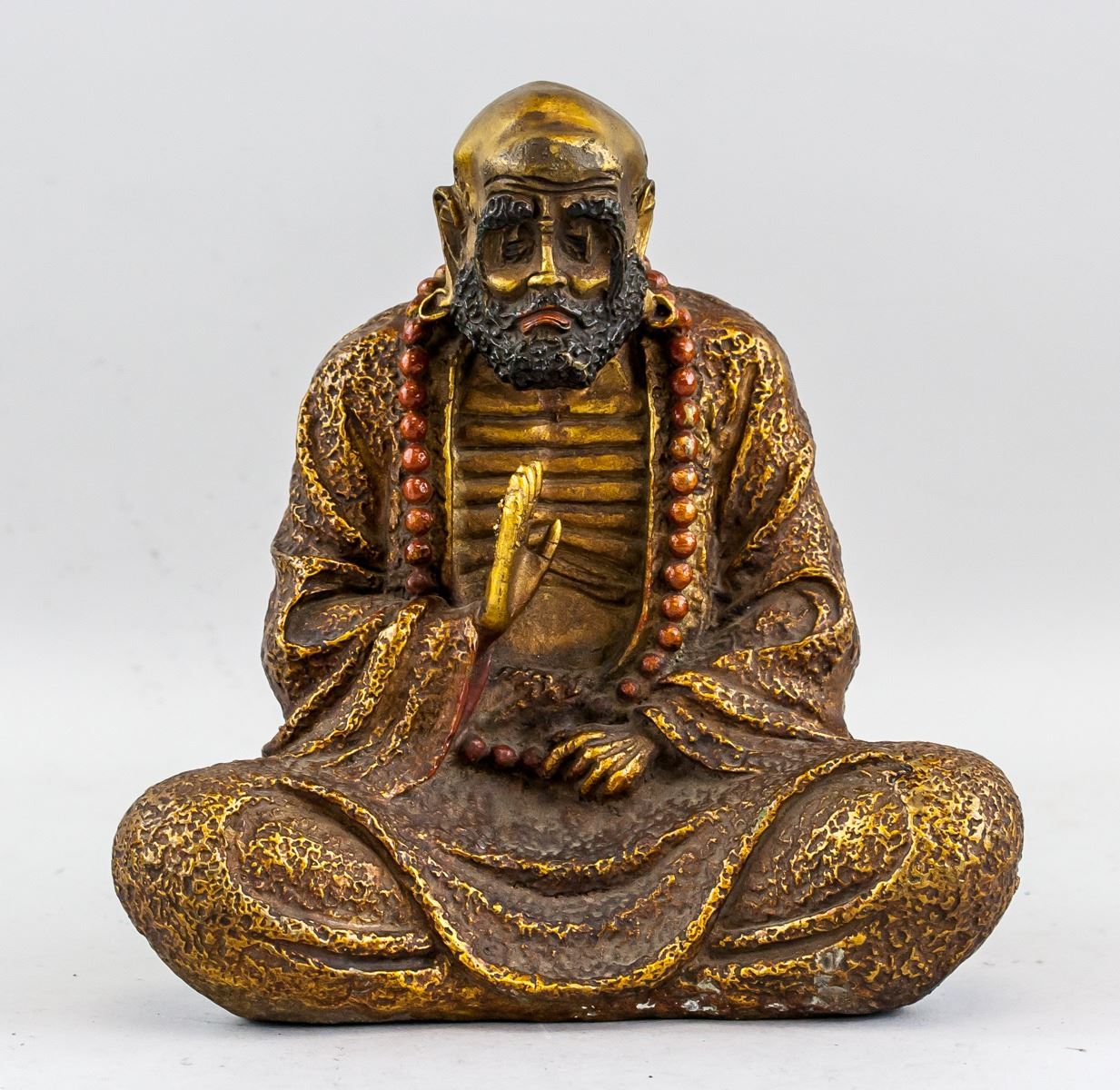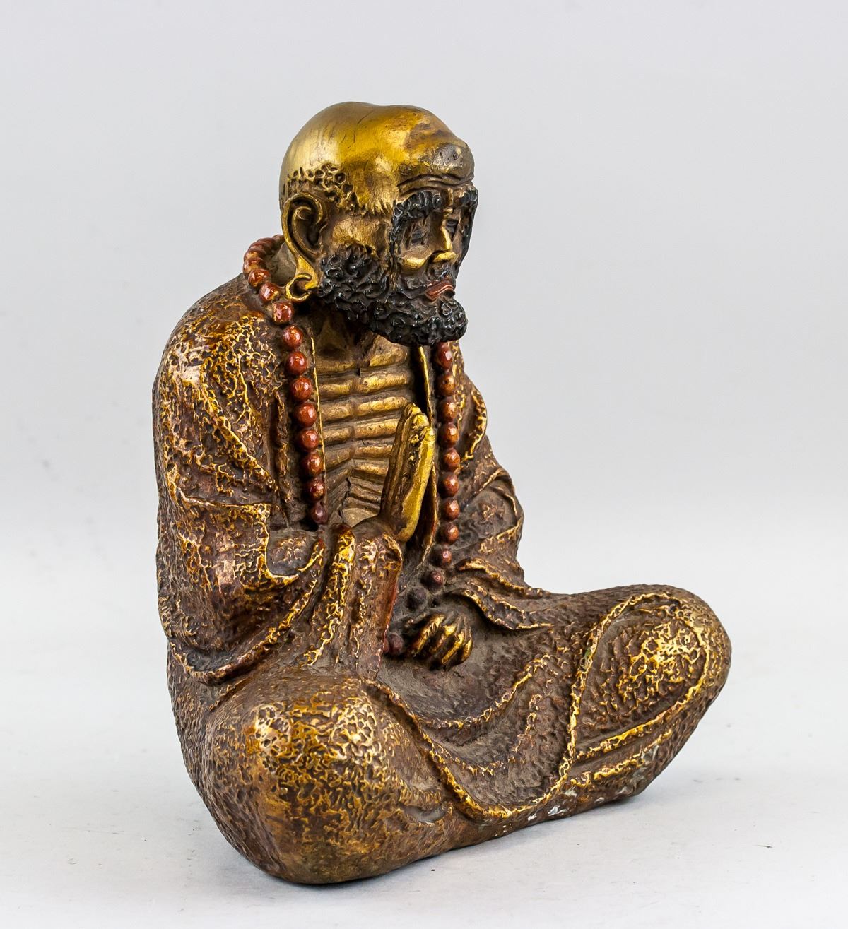 Chinese bronze statue. Featuring a seated Lohan. 19.5 x 19 cm, 2796 grams