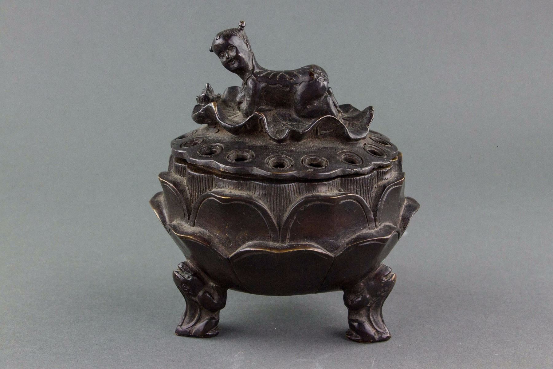 Chinese bronze censer; of lotus form body; supported on three beast form legs; with a body figure on top of cover; H: 15 cm, D:12 cm, 944 grams
