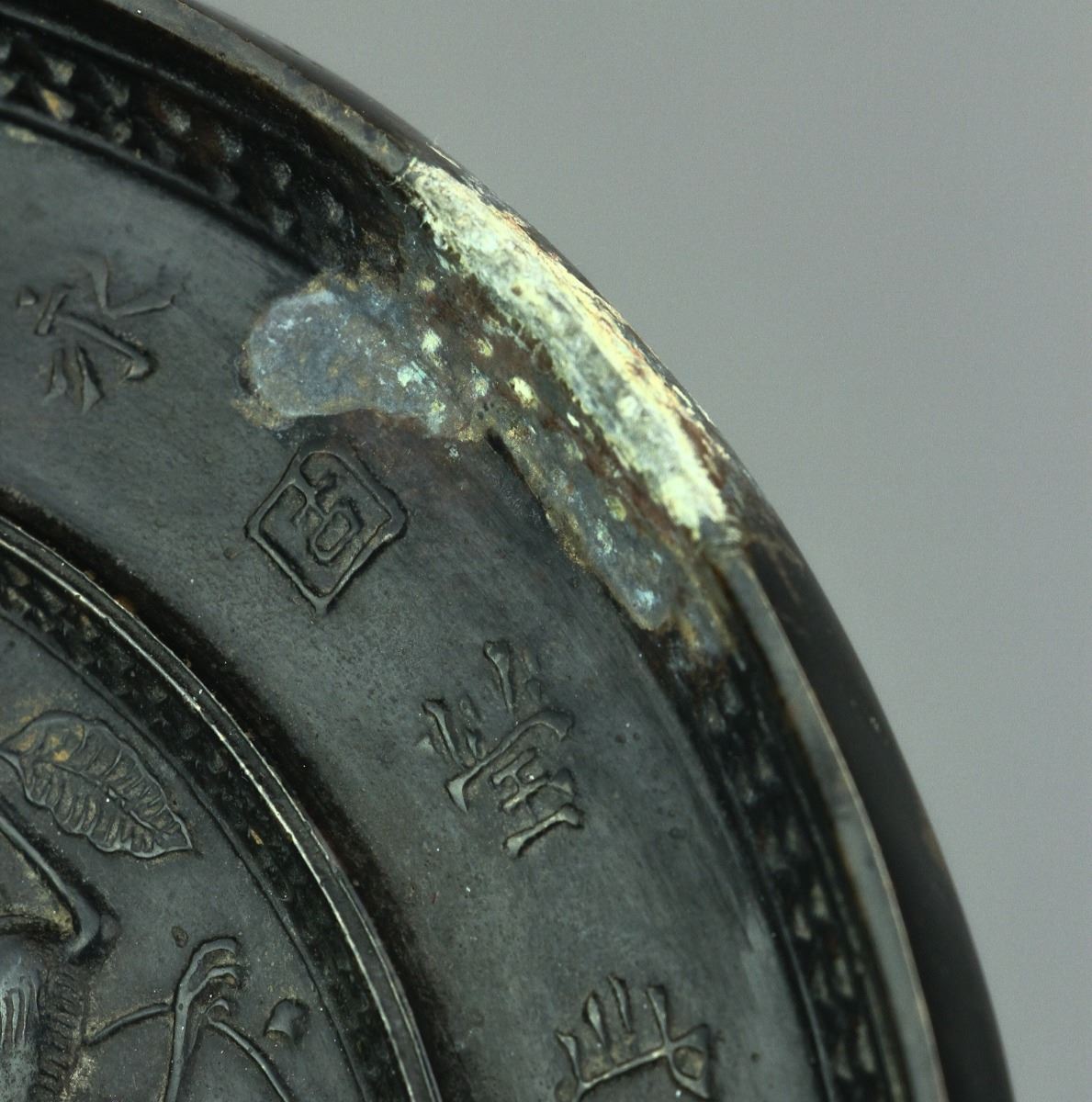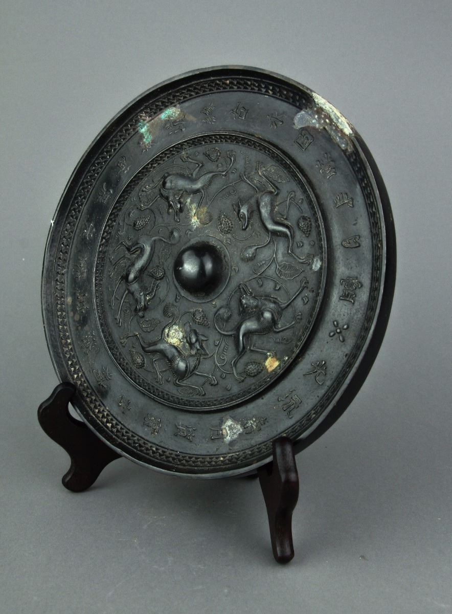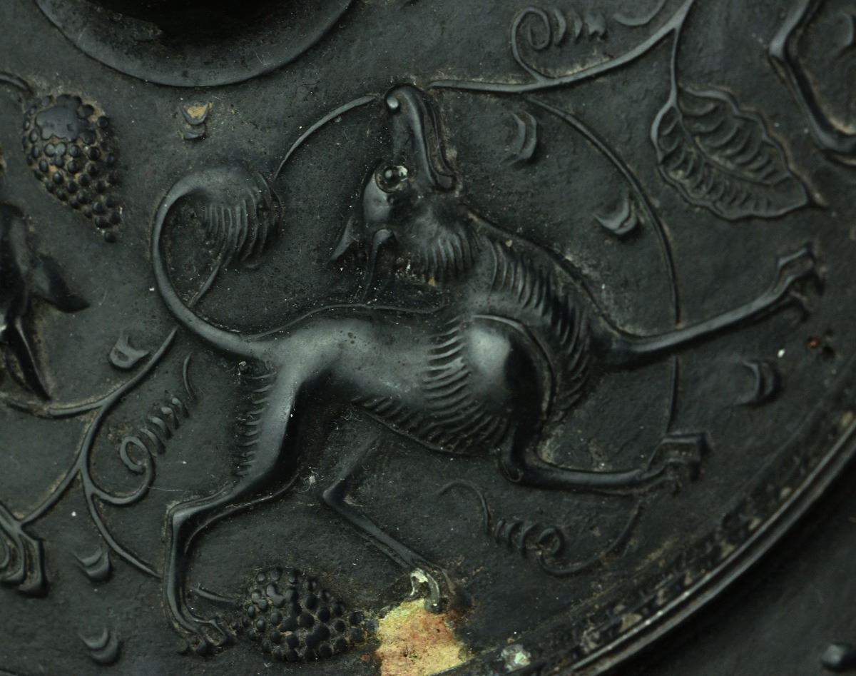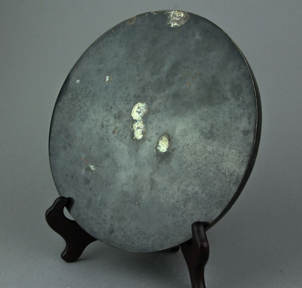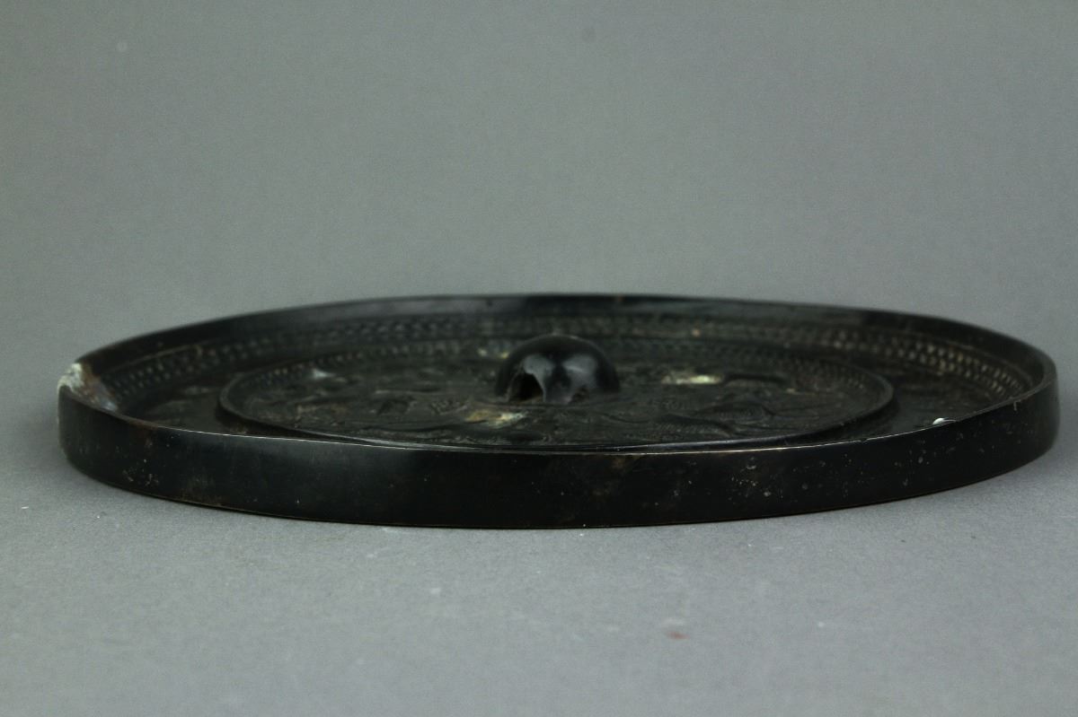 Chinese bronze mirror; with a lustrous black patina; the knobbed side cast with ferocious beasts enclosed by an inscription band; H: 1 cm, D: 20.5 cm, 1400 grams