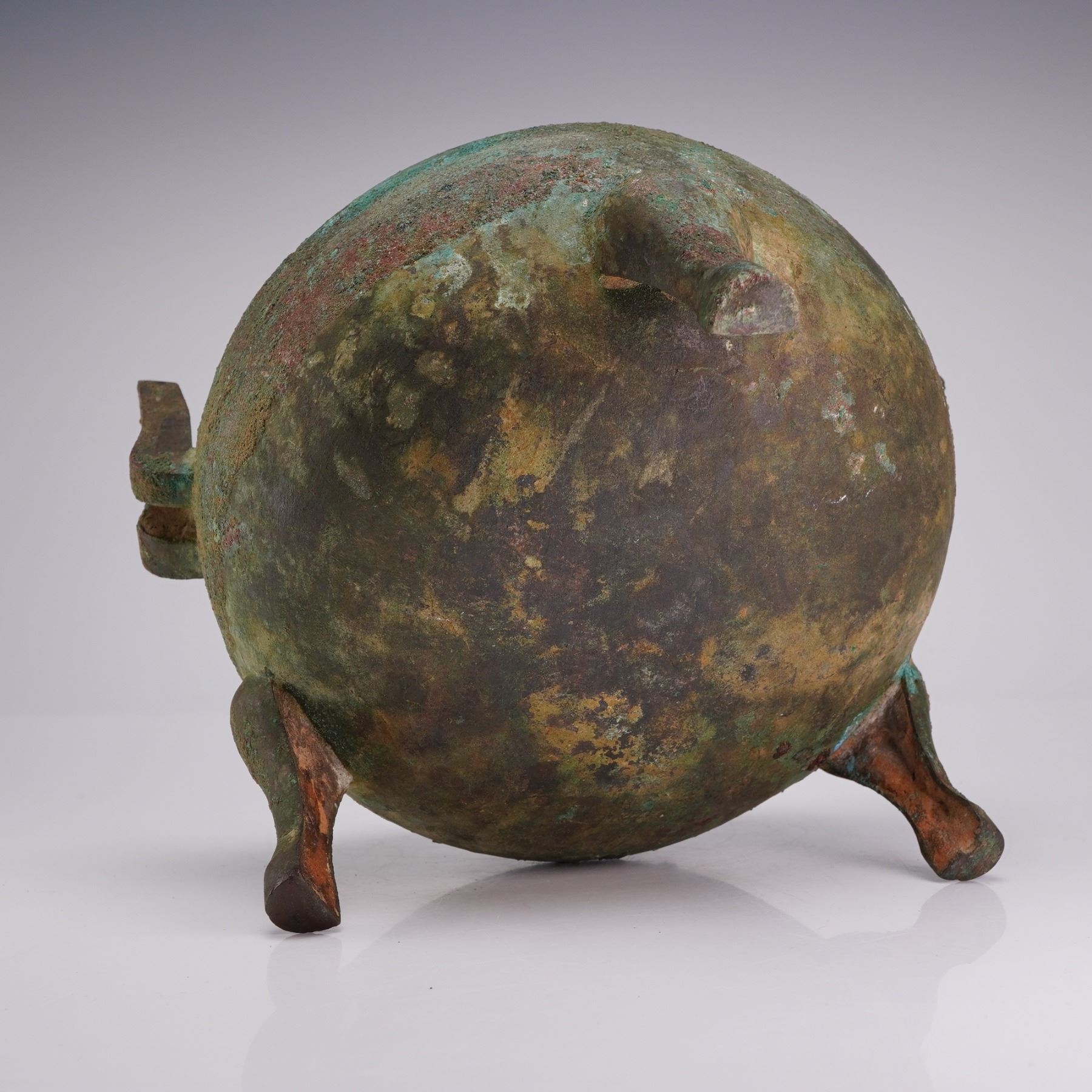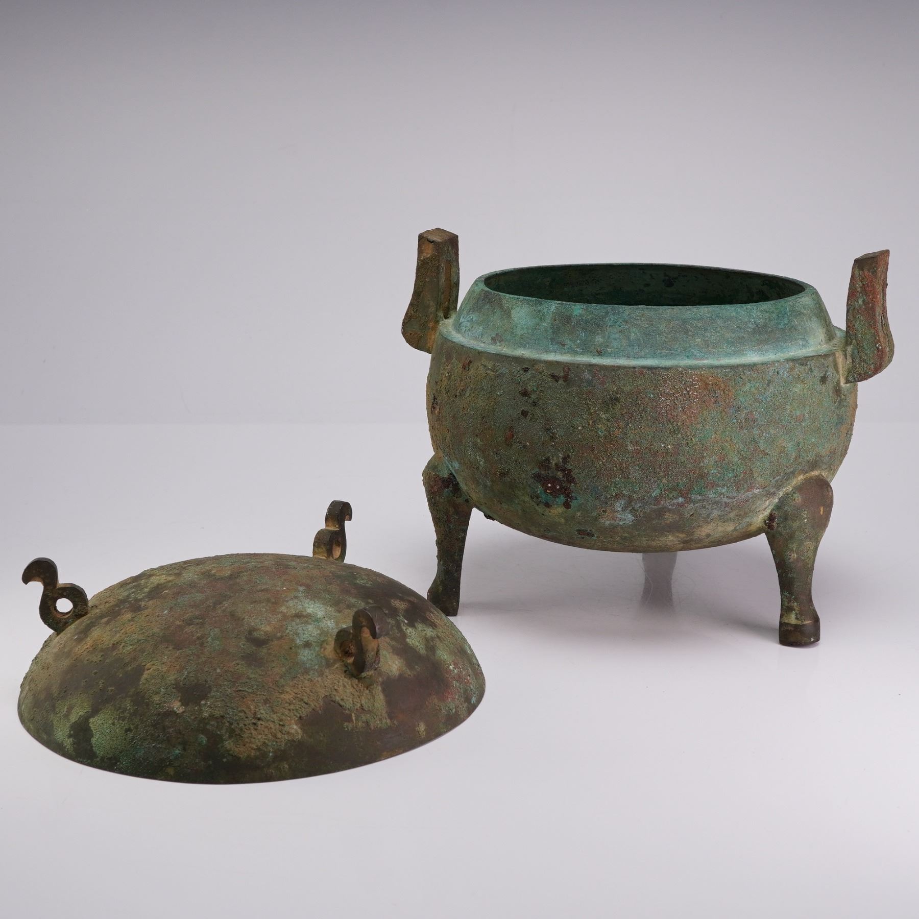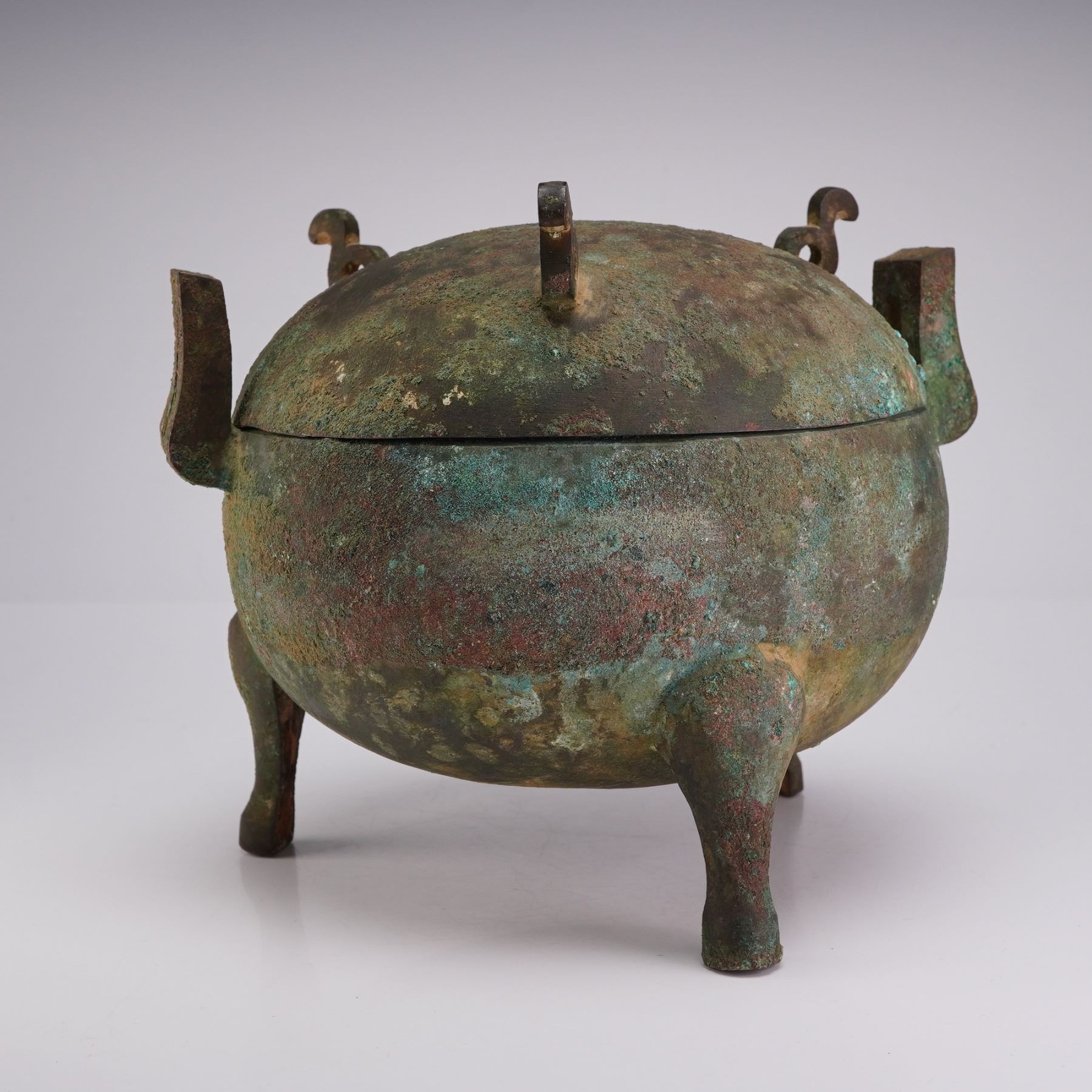 This antique Chinese bronze ritual food vessel is cast in a globular form constructed in two primary sections: a deep, rounded body and a conforming domed lid. The body is supported by three cabriole-style tripod legs and features two upright, flared rectangular handles at the shoulders. The lid is surmounted by three scroll-form finials which serve as a stable base when the lid is inverted for use as a bowl. The cast bronze surface is covered in a dense, multi-colored patina with heavy mineral encrustation present throughout the exterior and interior surfaces.
