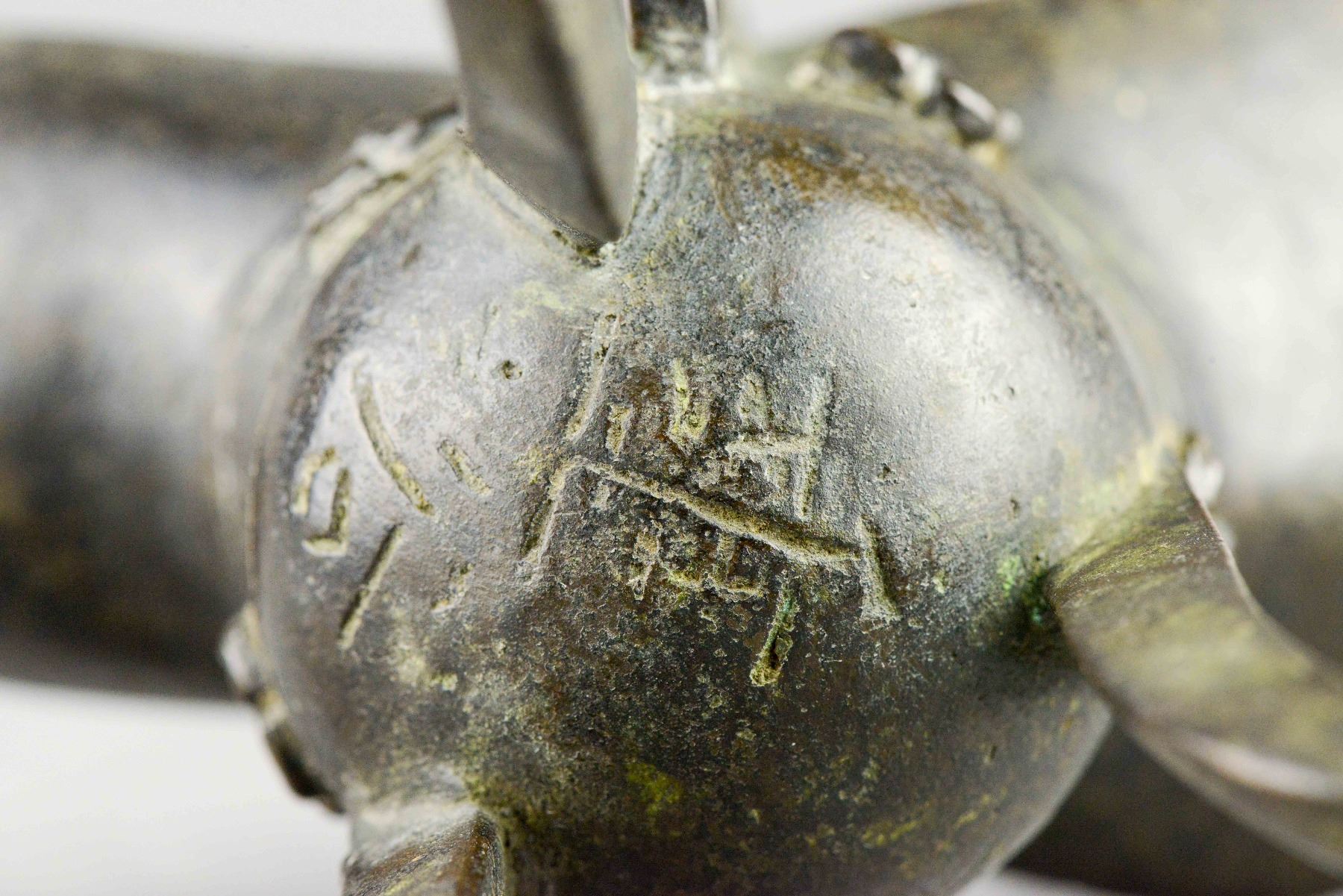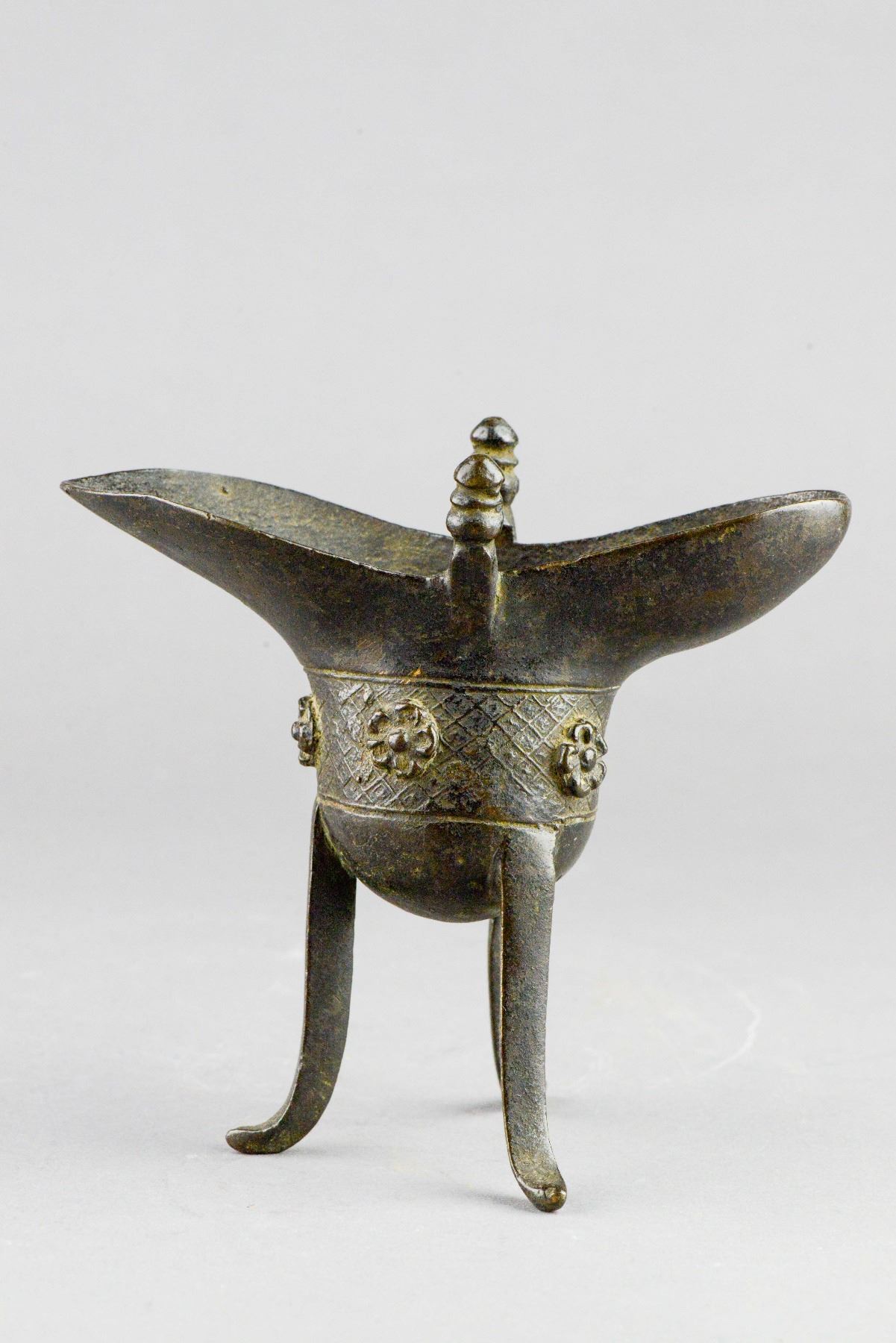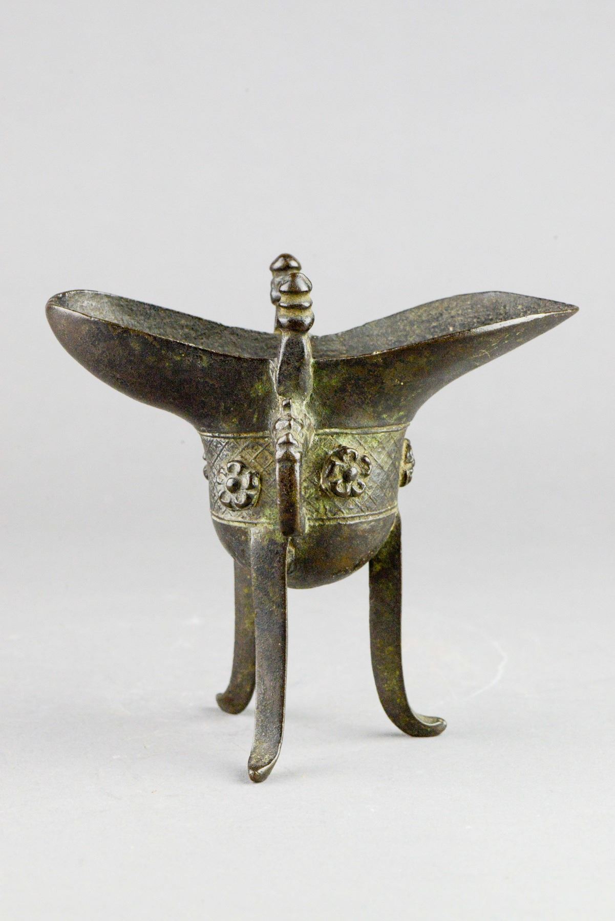 Chinese ritual bronze jue wine vessel; flaring mouth with rounded base; supported by tripod feet; decorated with frieze of prunus flowers; bottom marked two Chinese characters `Chui Gu`; H: 14 cm, L: 14 cm, W: 8 cm, 338 grams