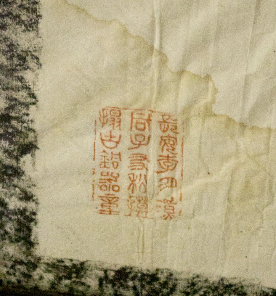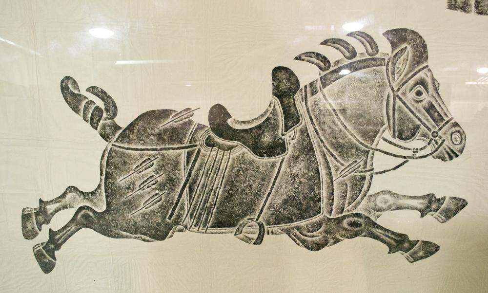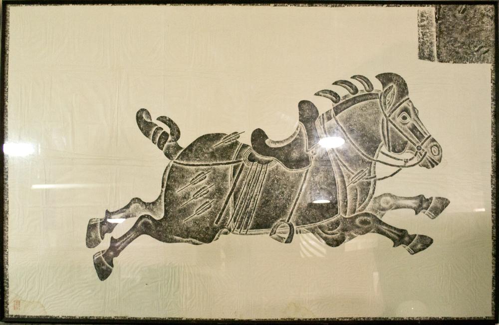 Depicting a horse sealed Chag'an Li Yue Xi with his son rubbing bronze. 77" W x 49.5" H. Circa early 20th century.