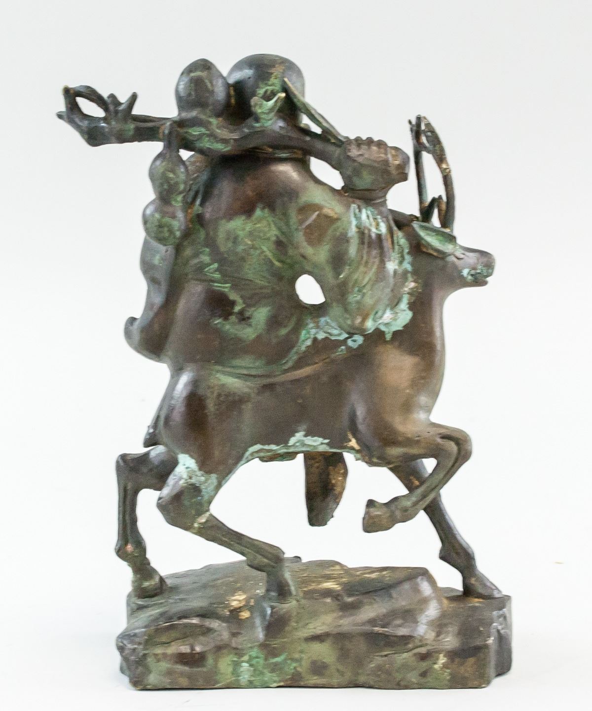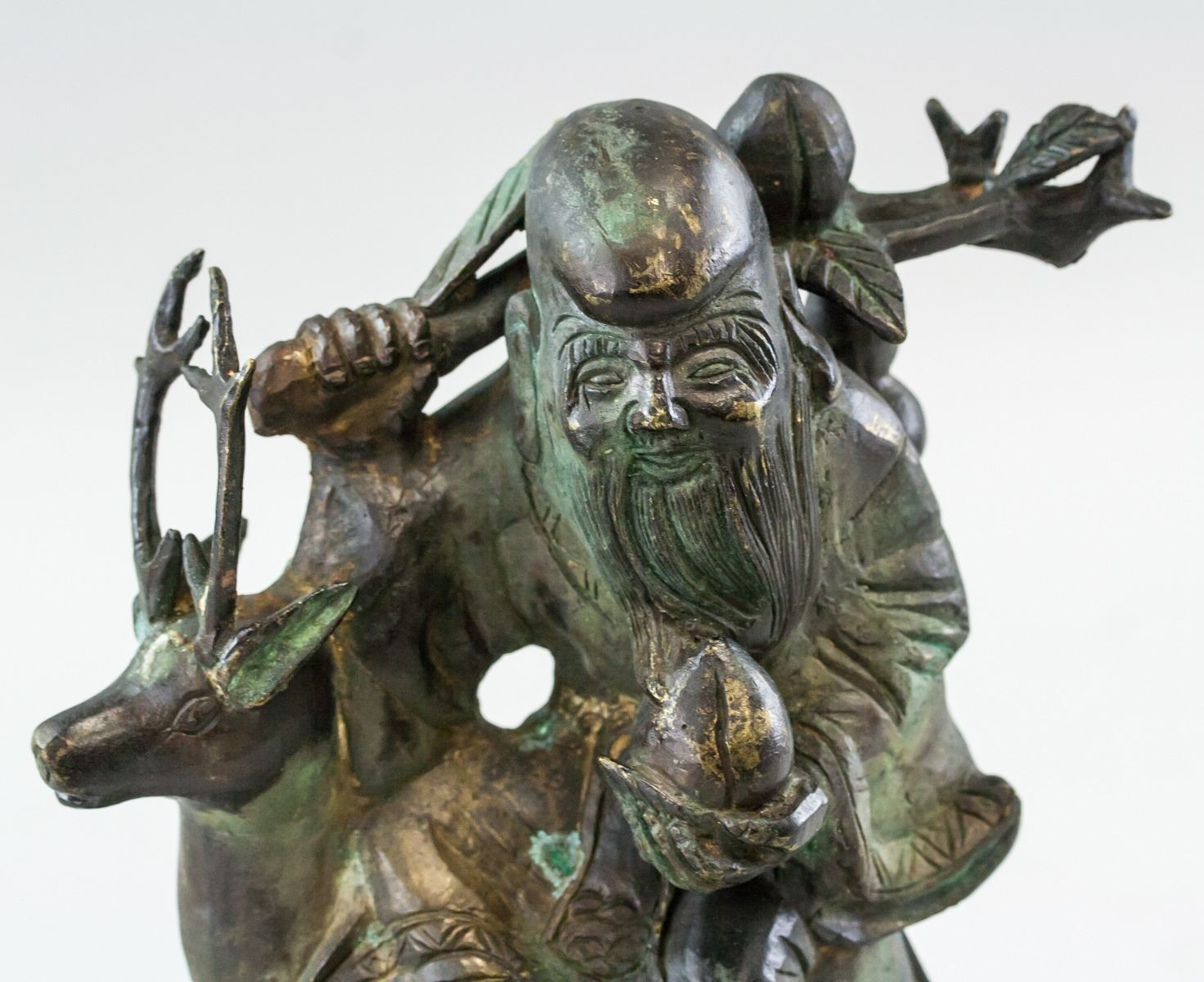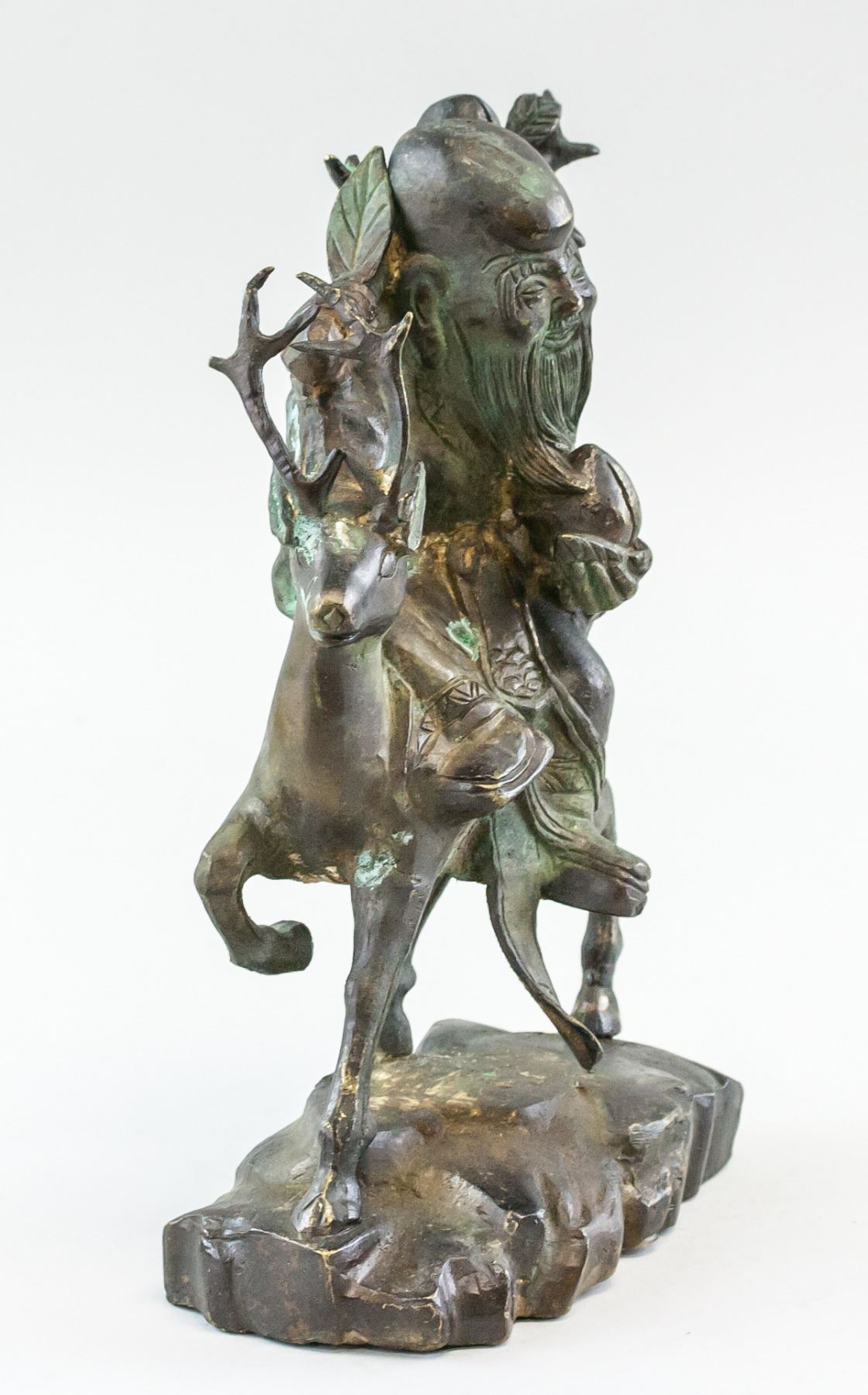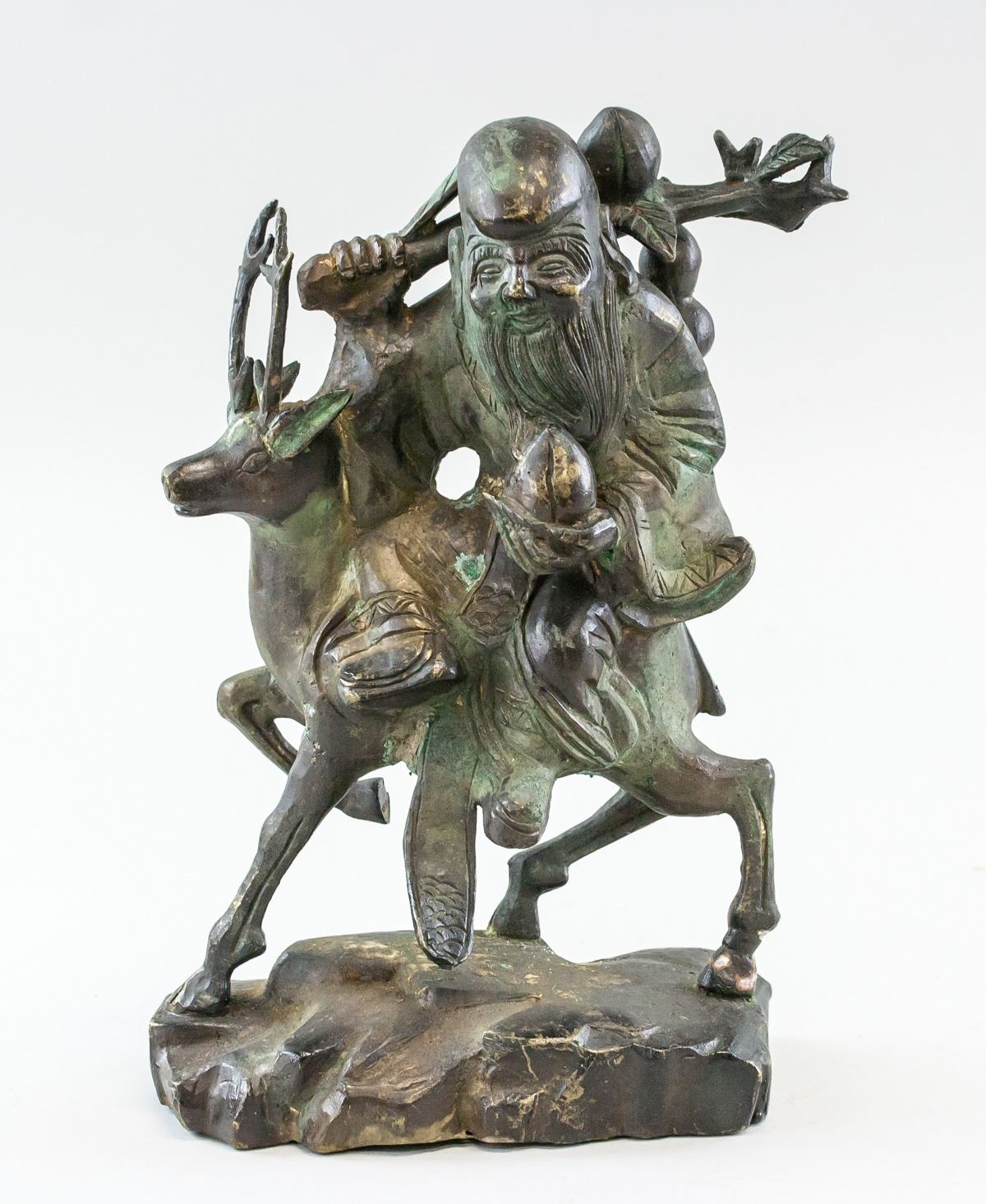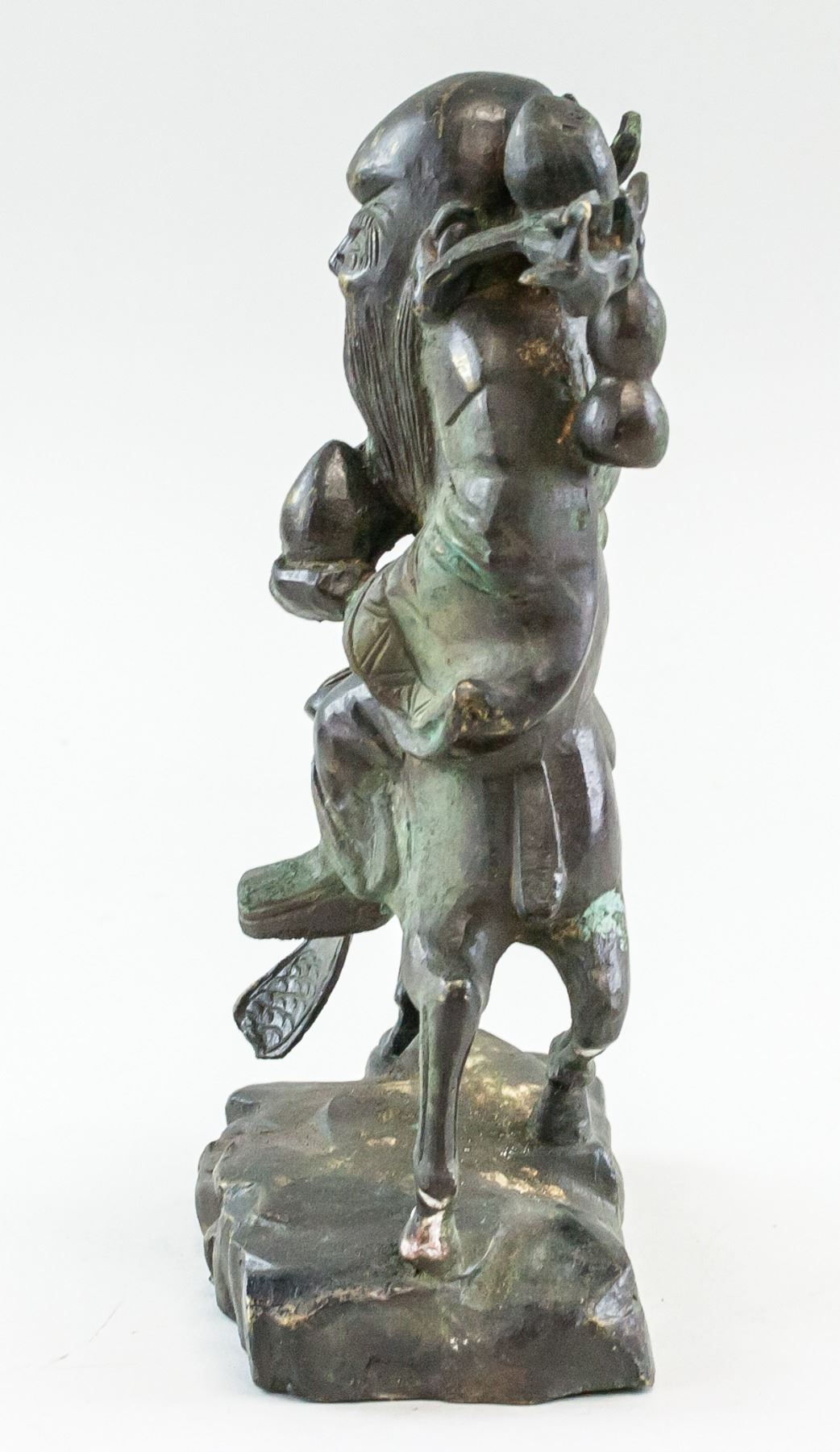 Chinese bronze statue. Featuring Shou Xing seated on his deer mount. 26 x 16 cm, 2071 grams