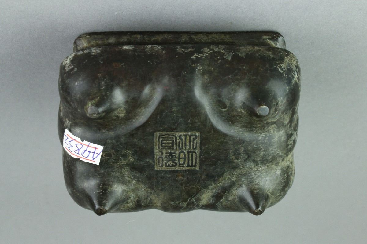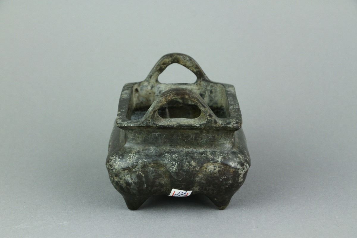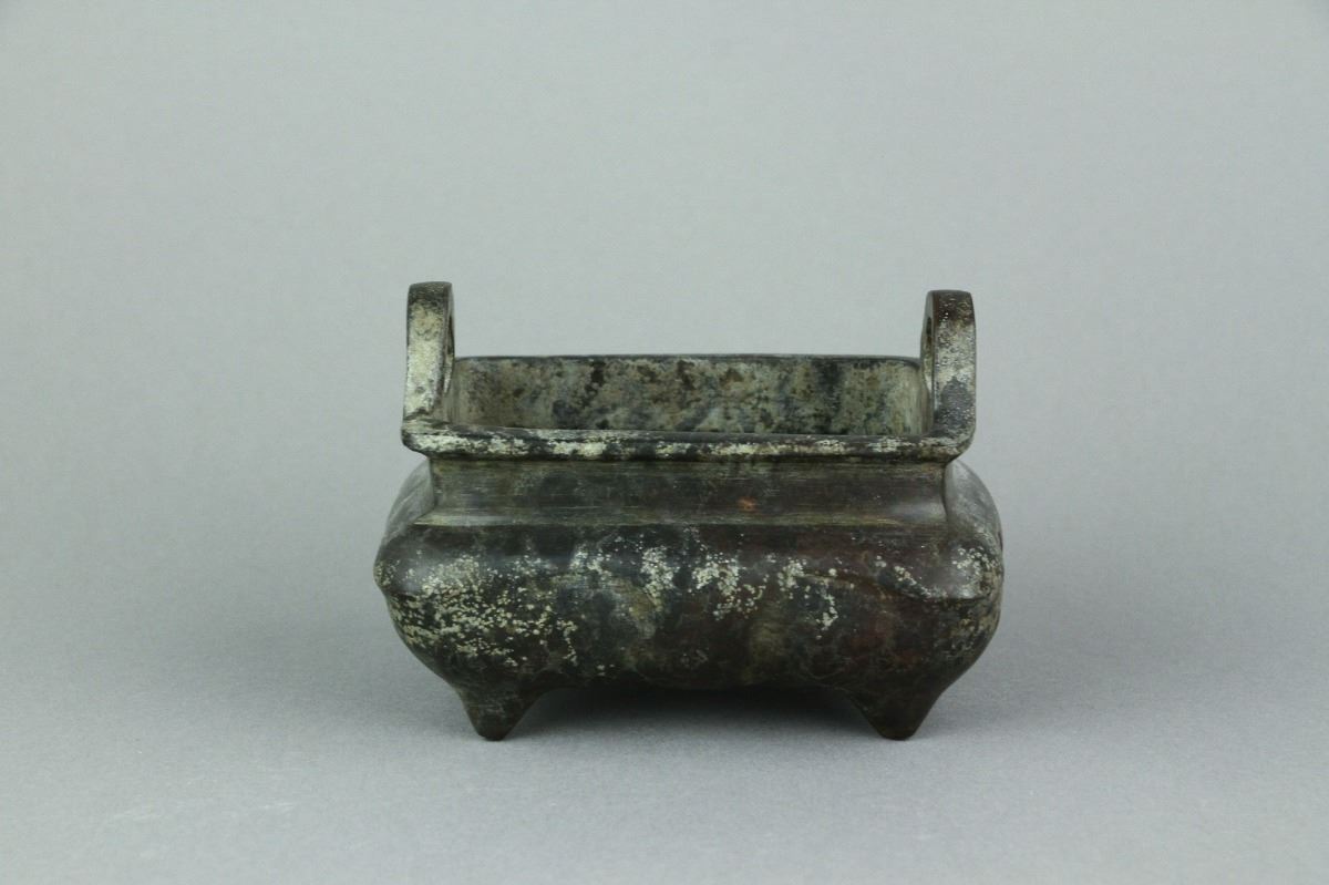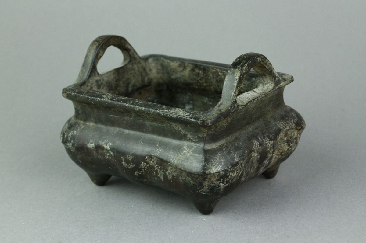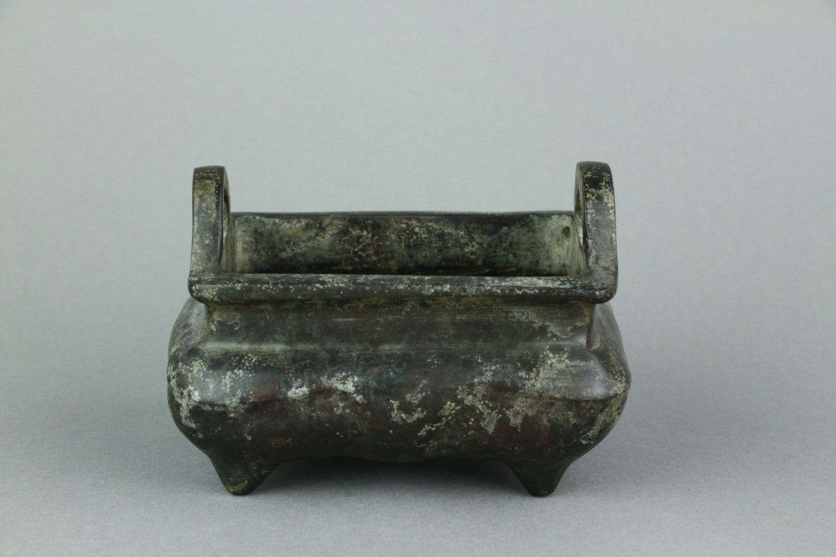 Chinese bronze censer; of square body supported on four feet; flanked by double ears on the galleried rim; four-character Xuande mark on base; H 6 cm x W 8 cm x L 11.5 cm, 785 grams