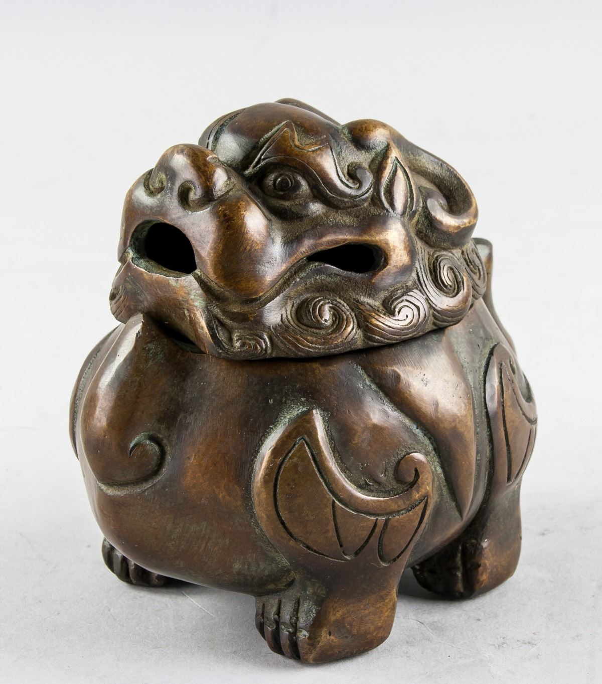 Chinese bronze censer, featuring a Suanni (Chinese mythical beast) form, with mark on base, 13 x 13 cm, 857 gram