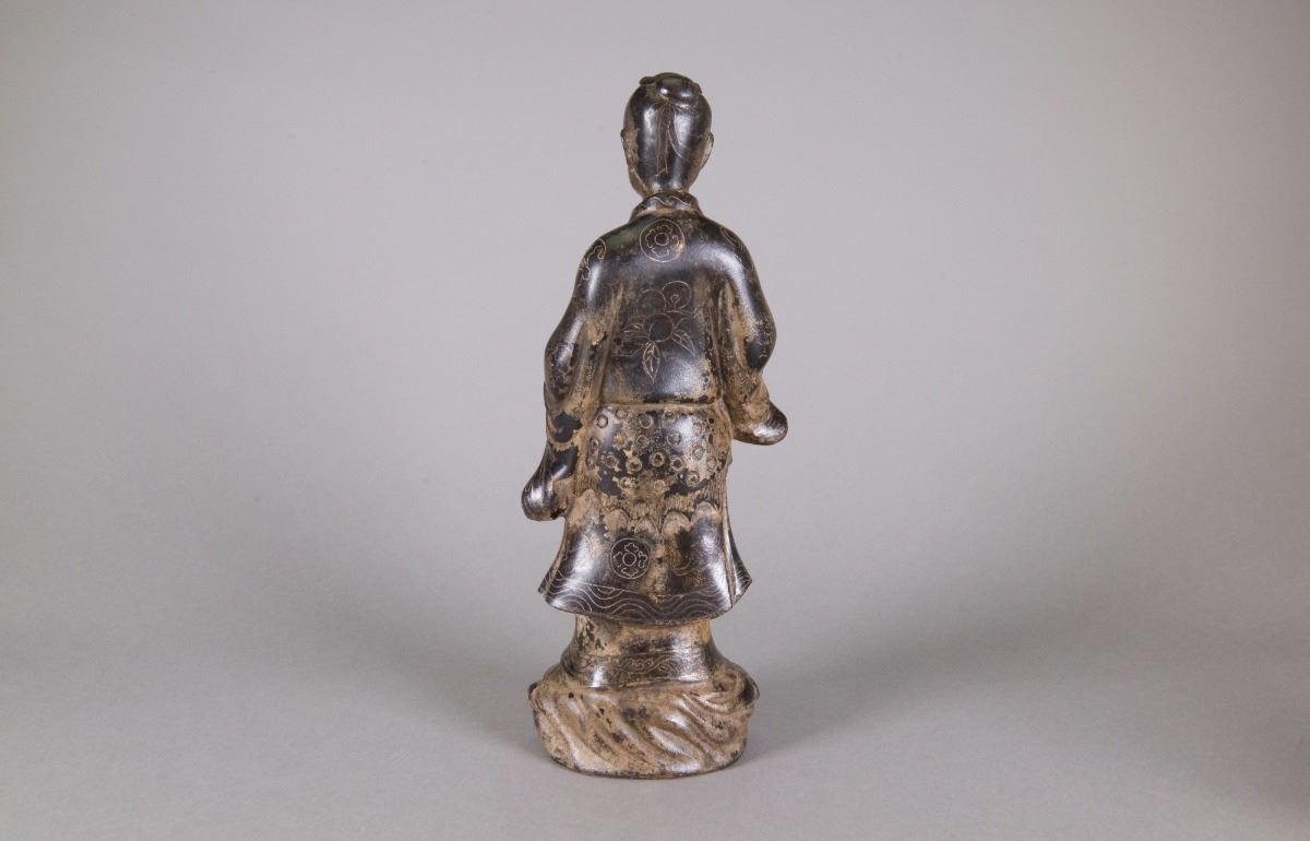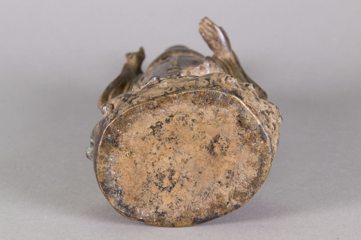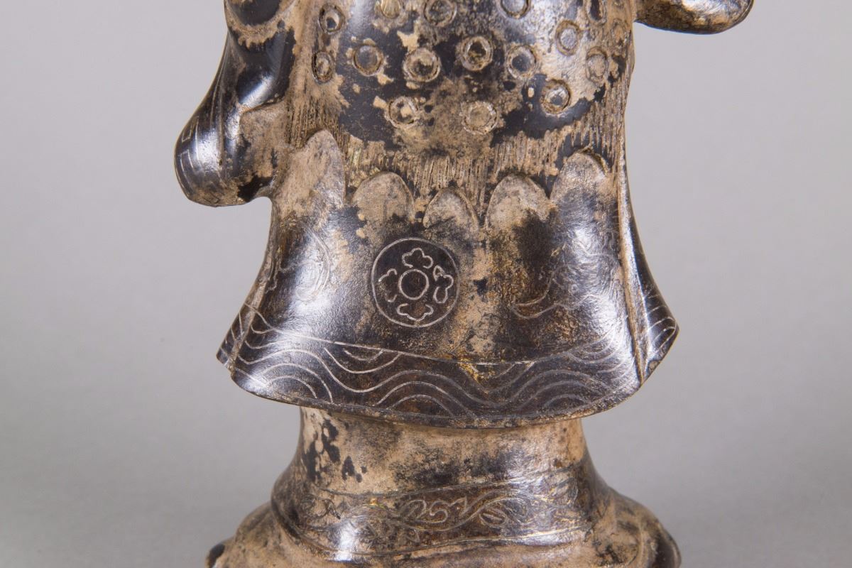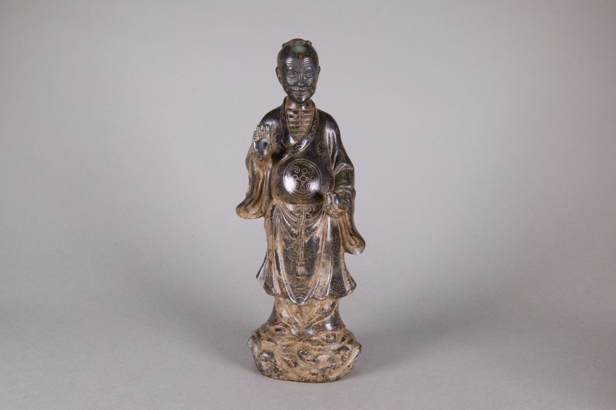 Chinese bronze Taoist priest figure; featuring a standing Taoist priest holding a peach; Qing period; H: 34 cm, W: 15 cm, 2187 grams