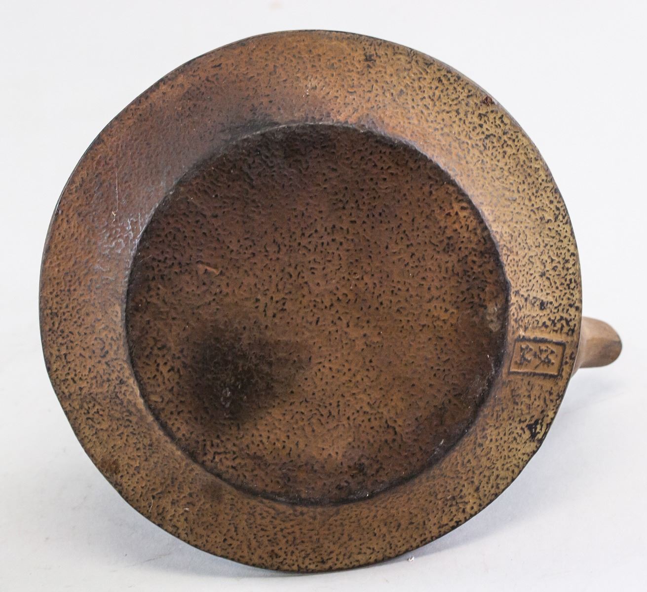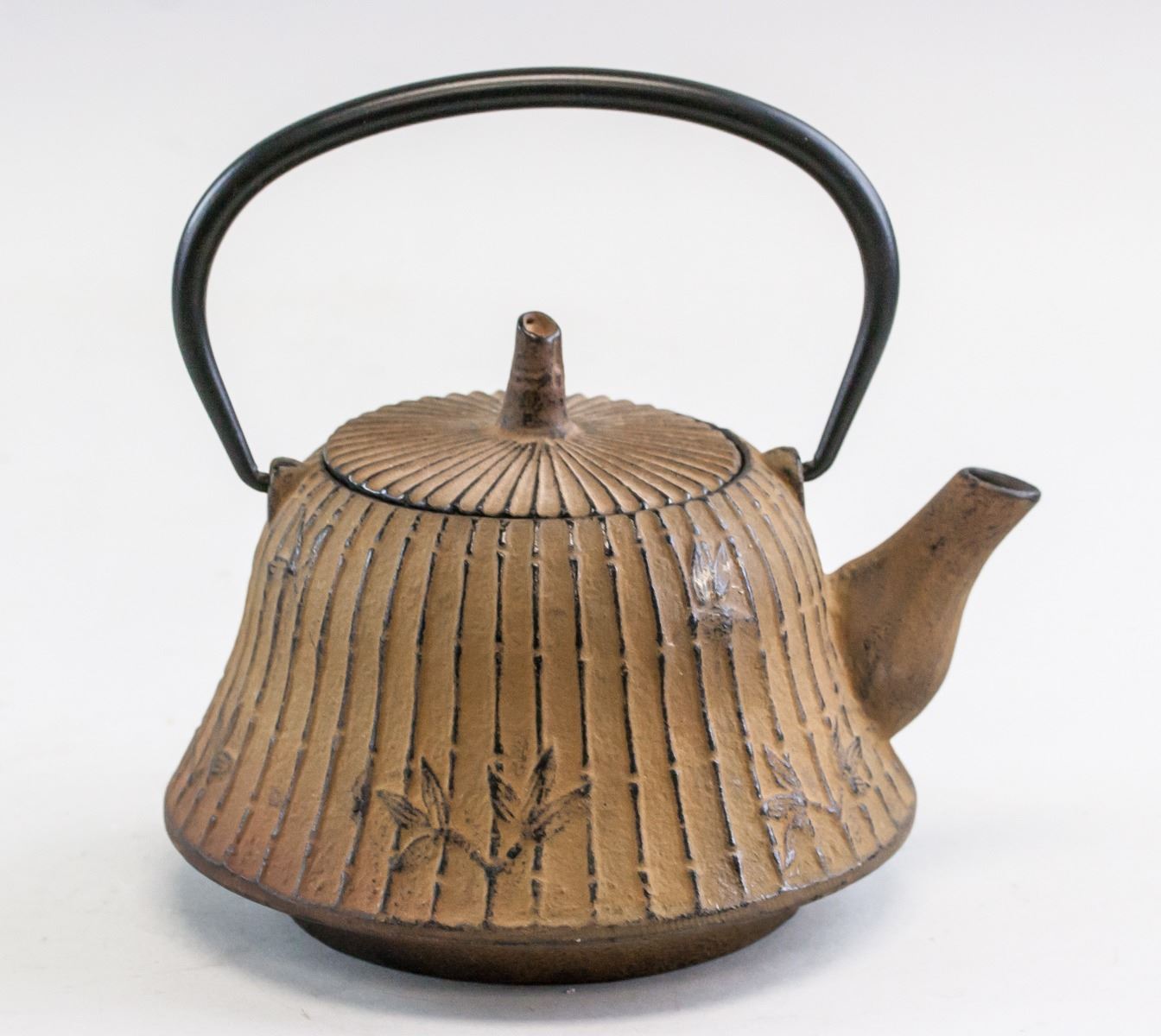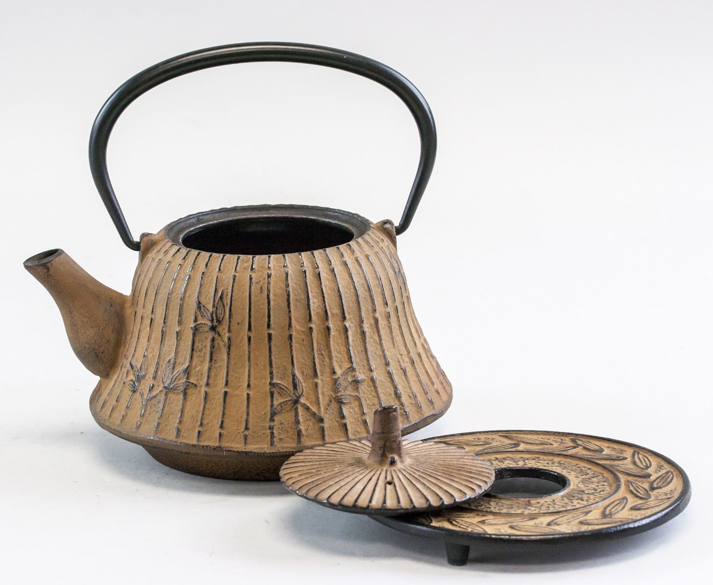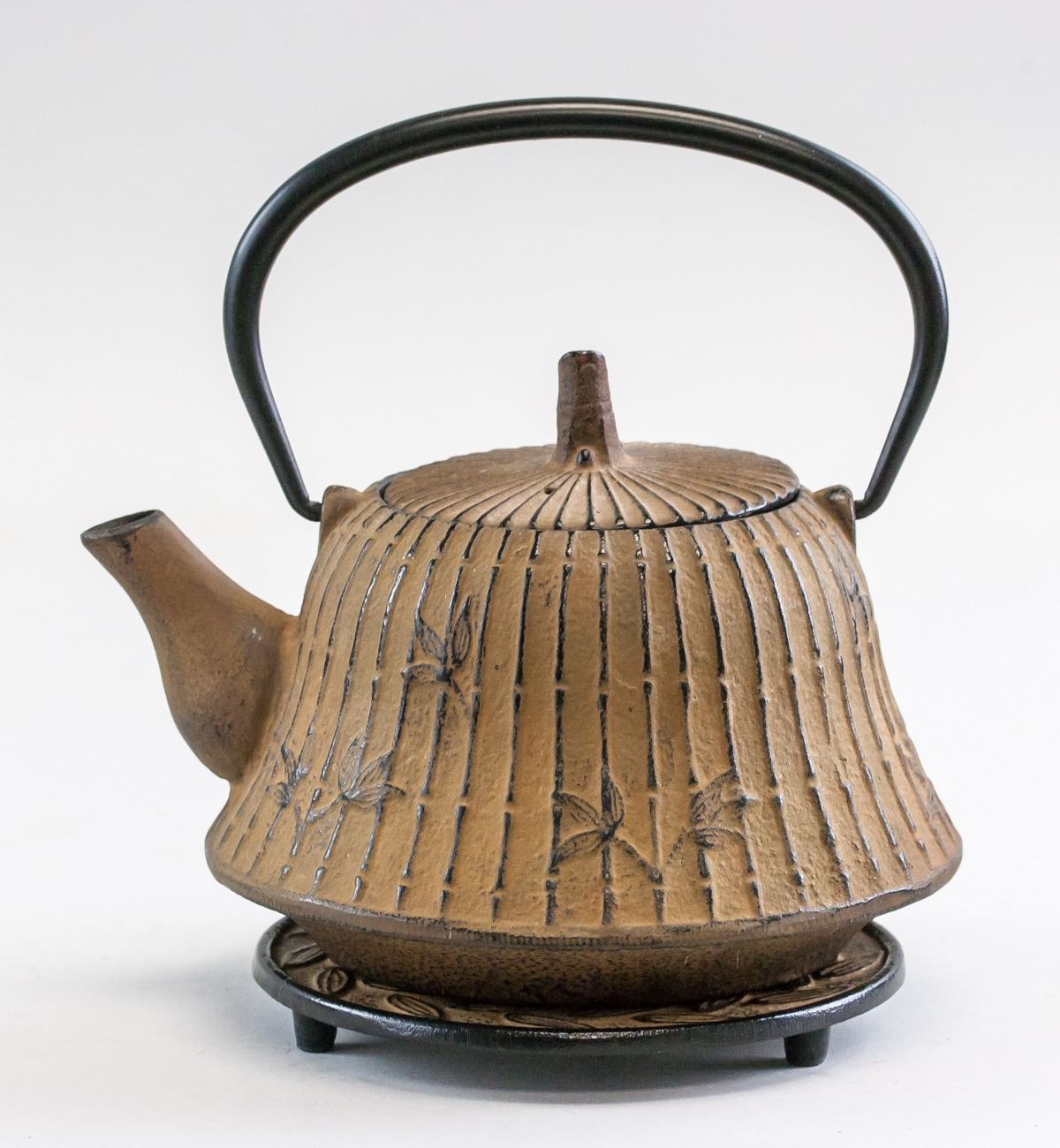 Chinese bronze teapot with stand. With large curved handle. Teapot decorated with bamboo designs. With short spout. Resting on stand. Makers mark on base of stand and teapot. 15.5 x 18 cm, 2341 grams (total).