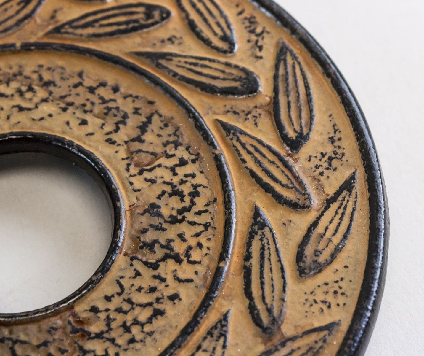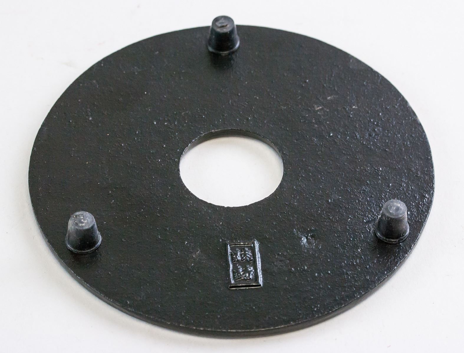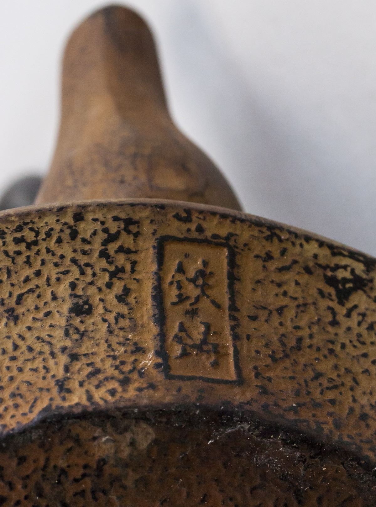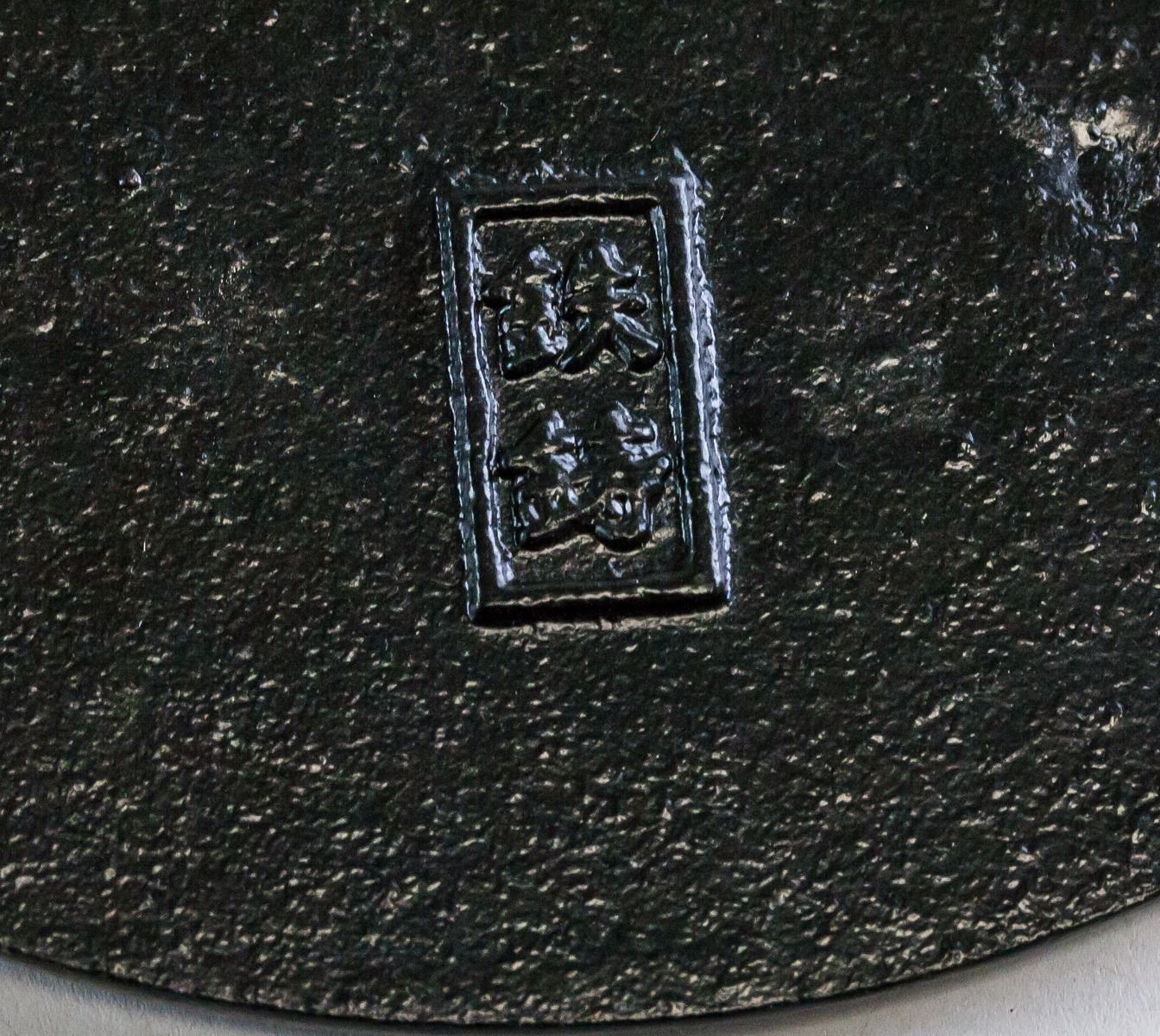 Chinese bronze teapot with stand. With large curved handle. Teapot decorated with bamboo designs. With short spout. Resting on stand. Makers mark on base of stand and teapot. 15.5 x 18 cm, 2341 grams (total).