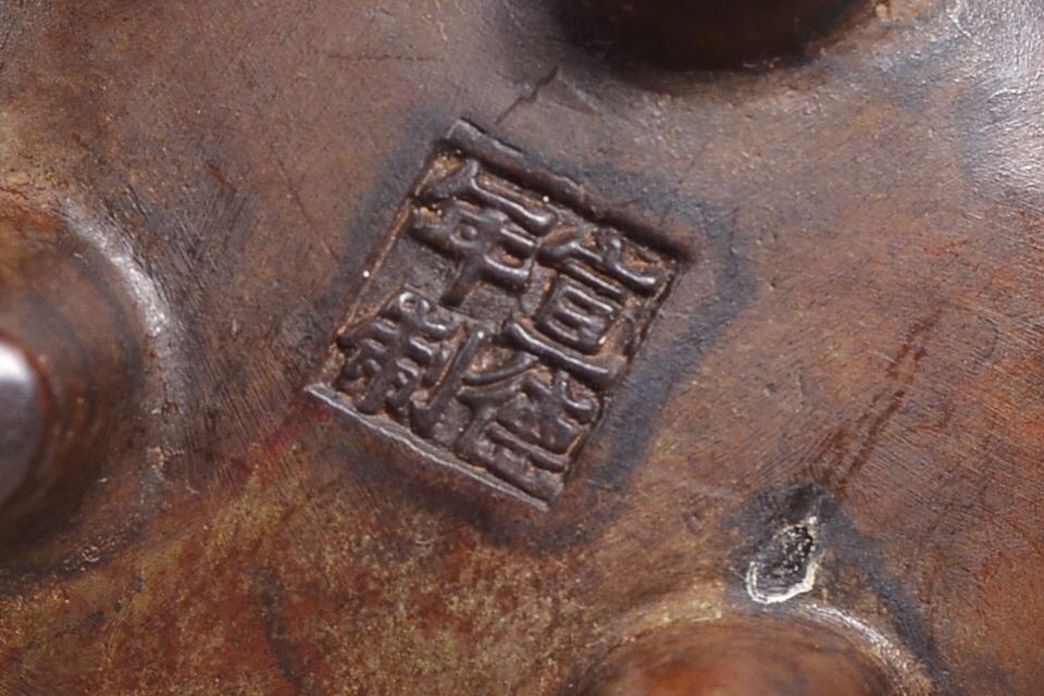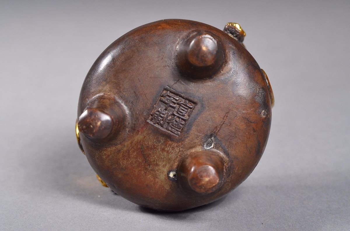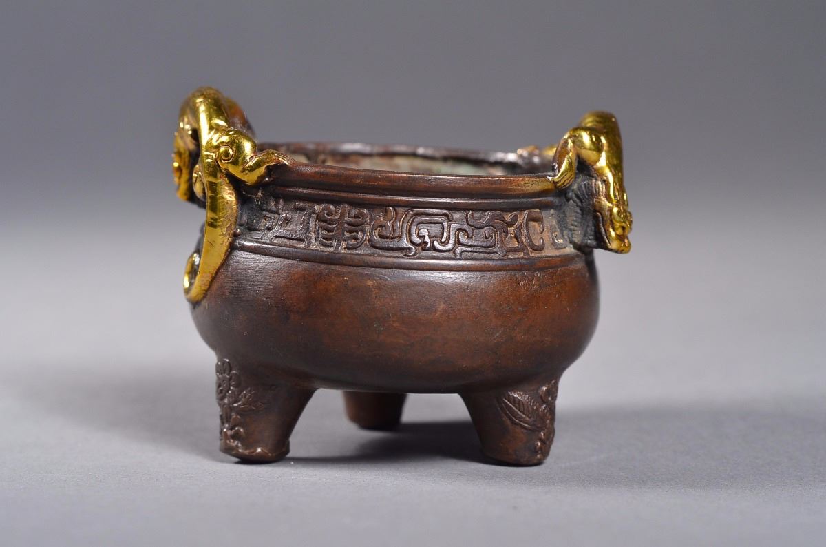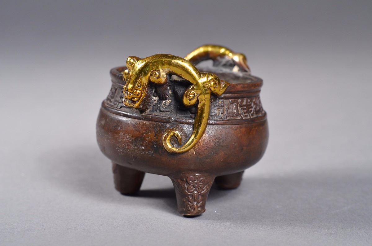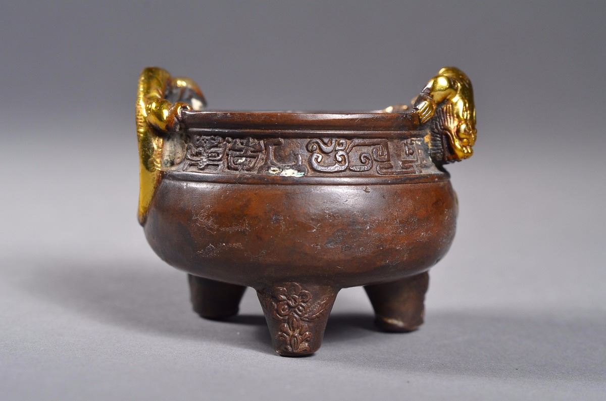 Chinese bronze tripod censer; beneath rim featuring border of characters with gilt gold carved Chilong on rim; four-character Ming Mark on base; D: 5 cm, H: 3.75 cm