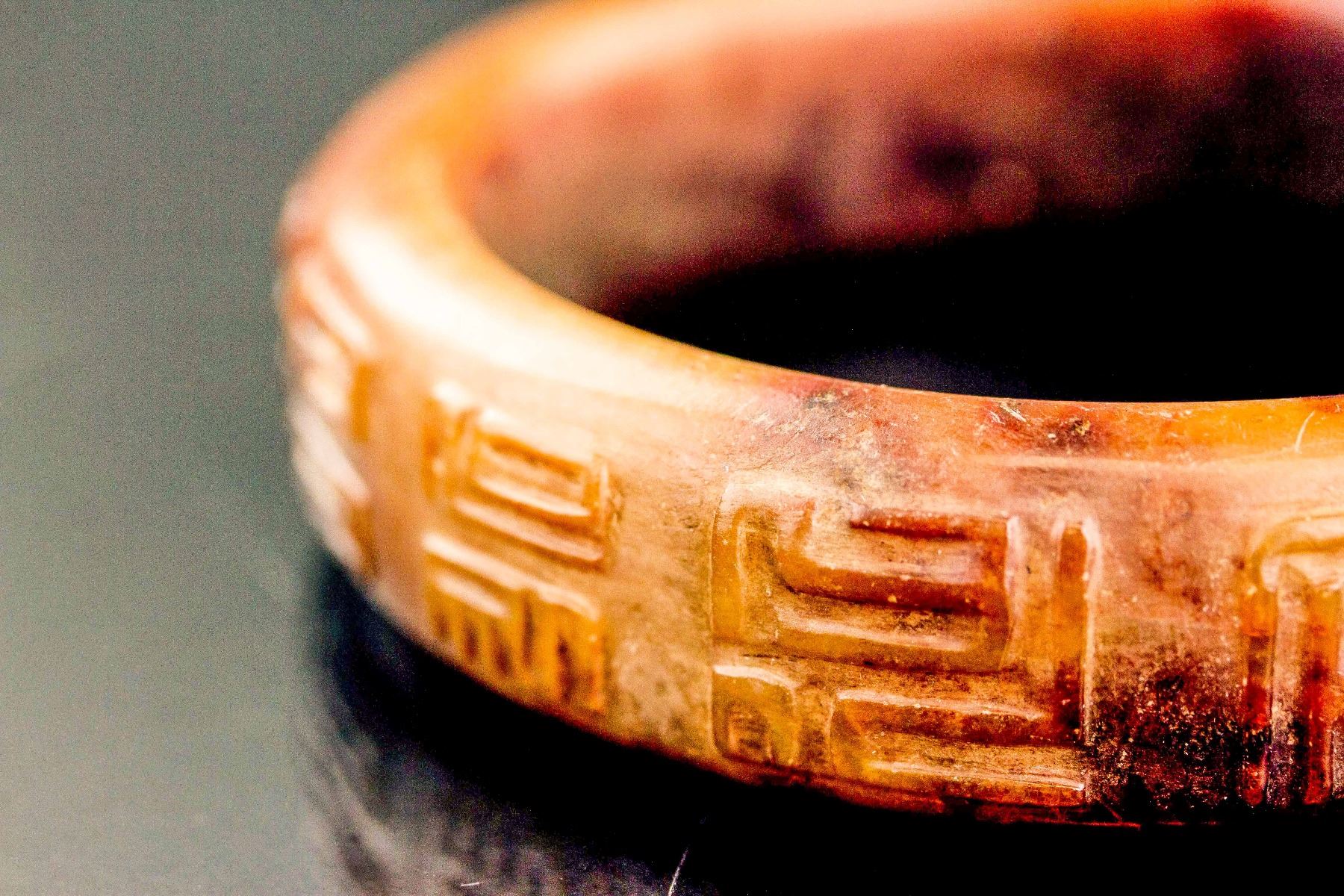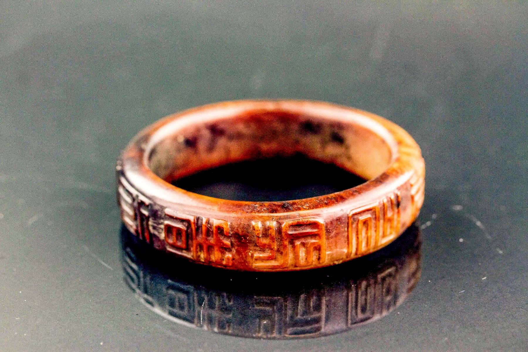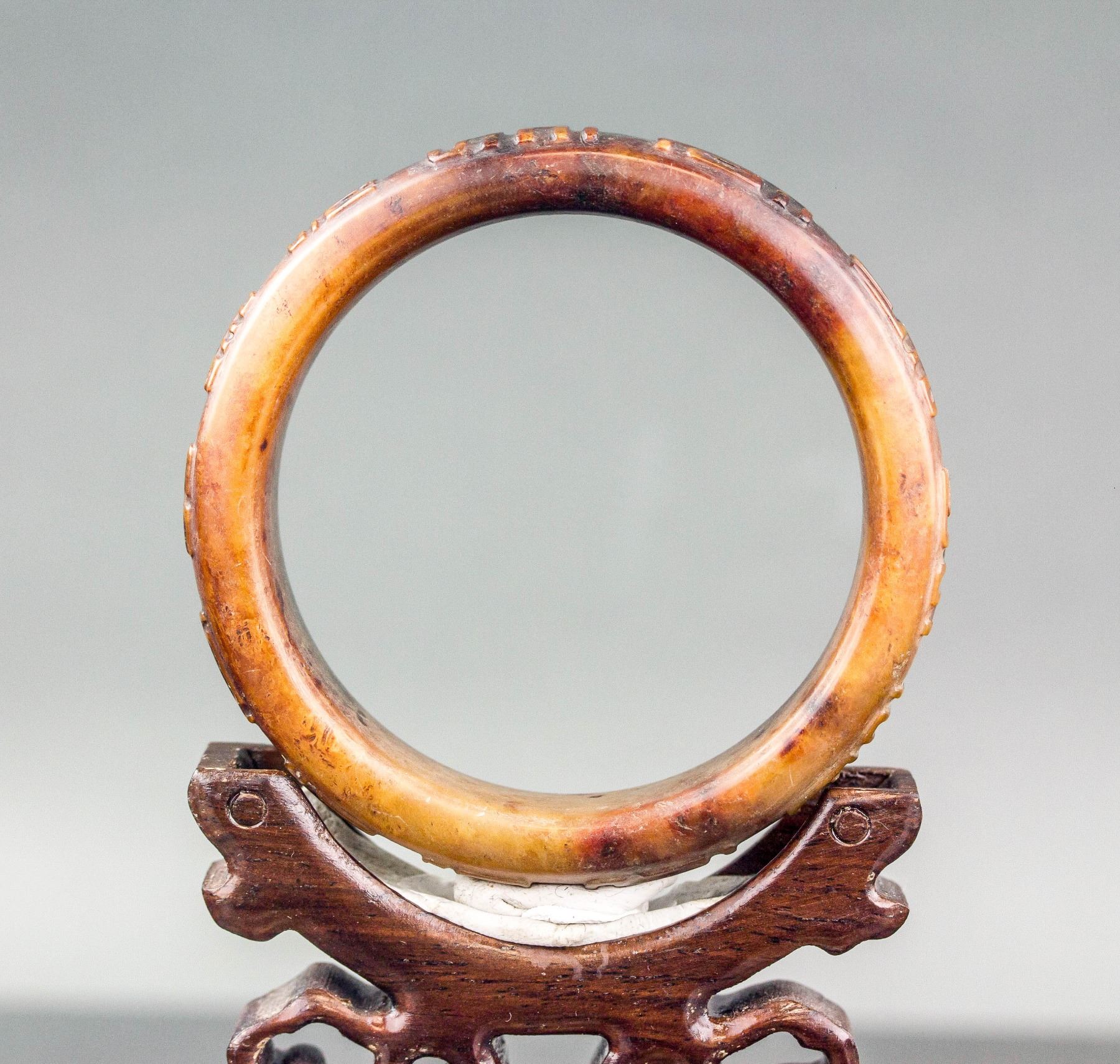 Chinese brown hardstone carved bangle; of rounded outside and flatten inside; carved with Chinese characters in seal script on outside; D: 7 cm, 83 grams, Density: 2.57
