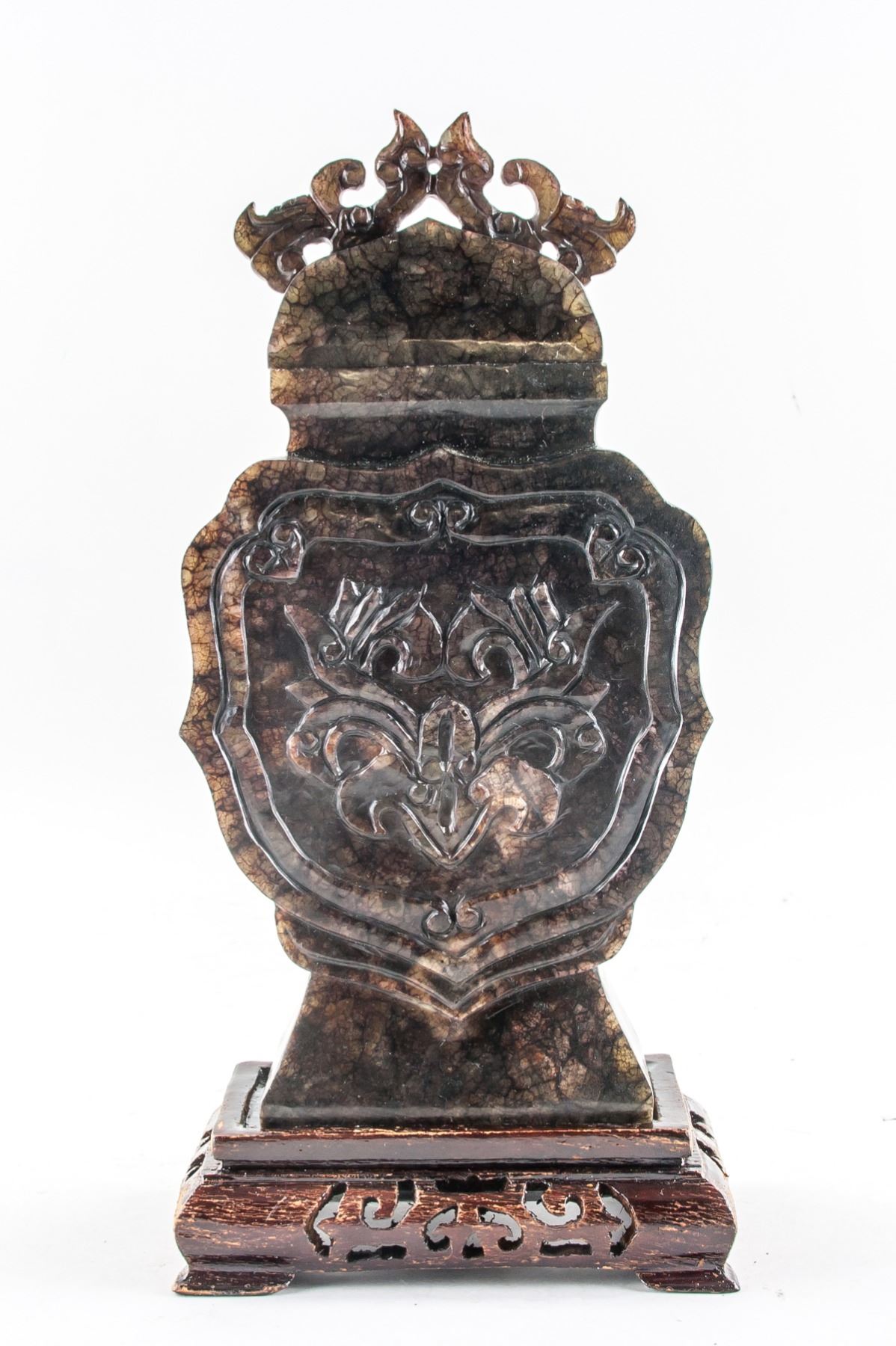 Chinese dark brown hardstone carved vase, lid surmounted by double phoenix, carved with floral pattern on surface, with customized wood stand, 24.5 x 12.5 cm, 2215 grams