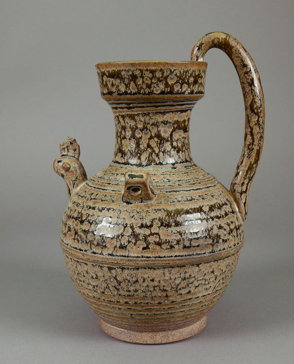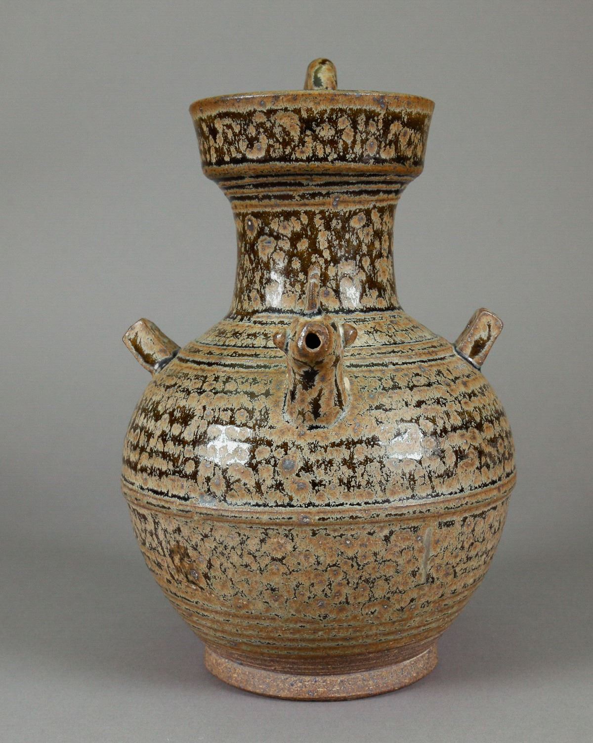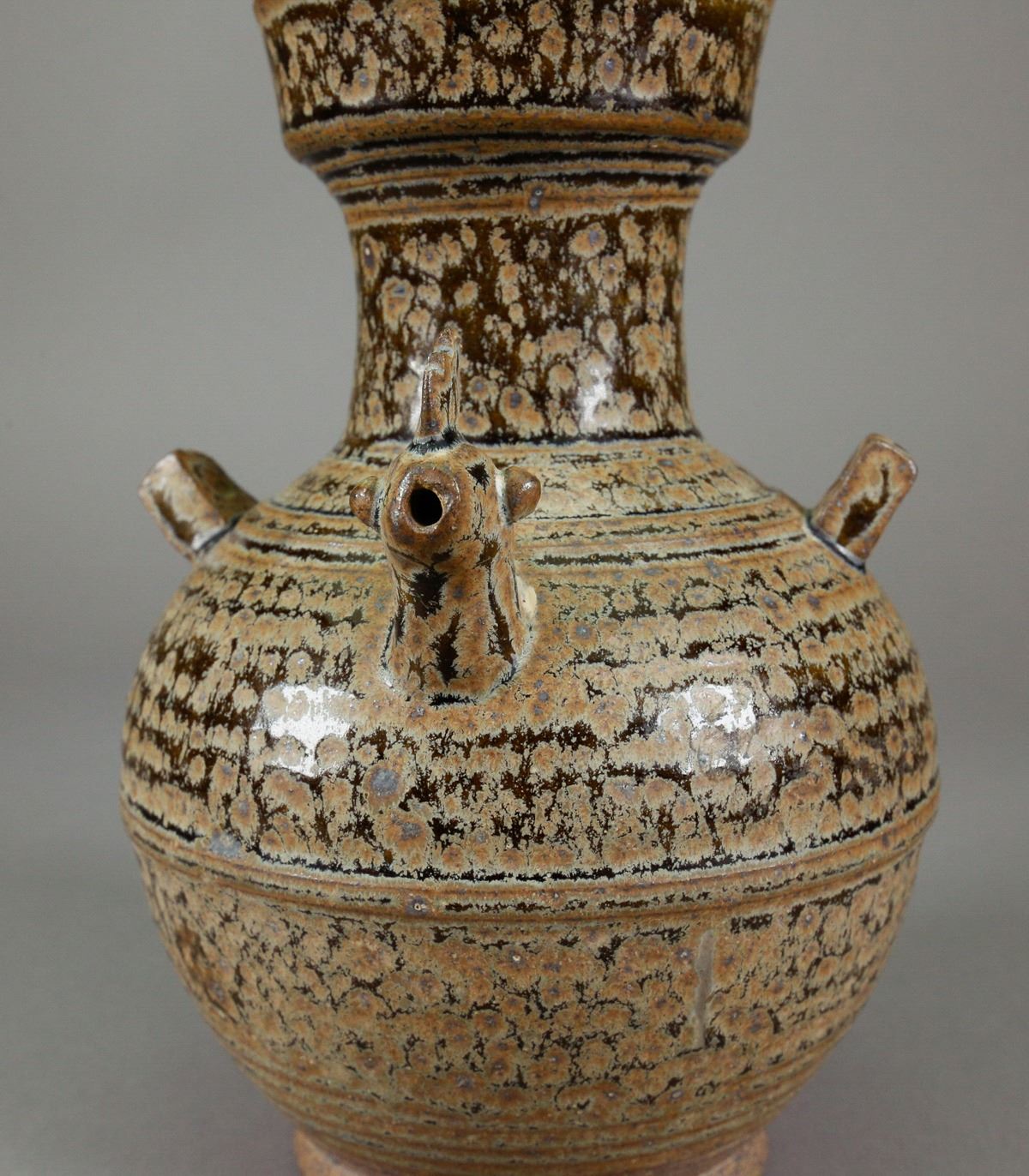 Chinese brown pottery wine pot; of globular body with a slender handle and a short sprout; with two looped lug handles on sides; Jin period; H: 18 cm, D: 13 cm, 844 grams