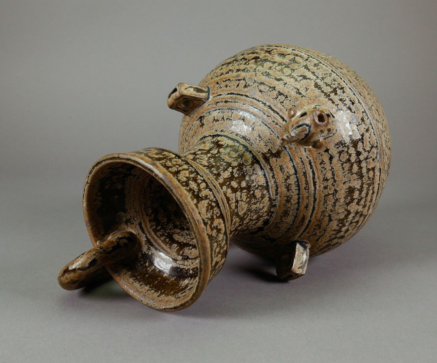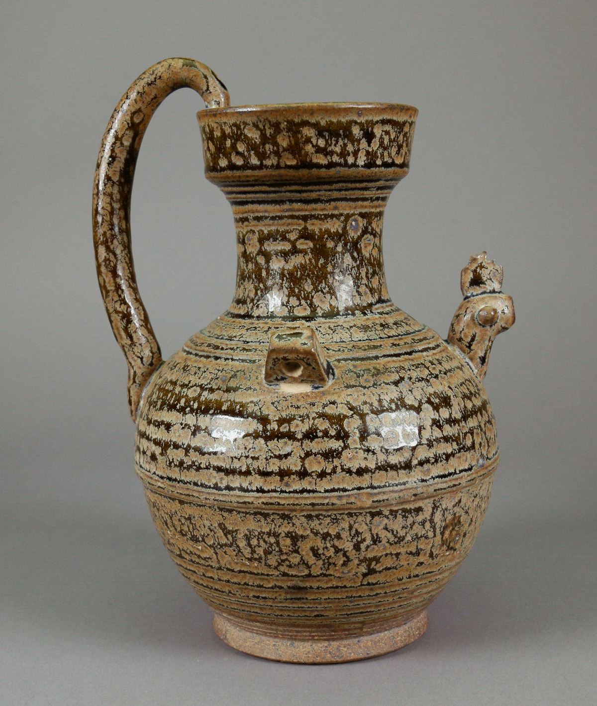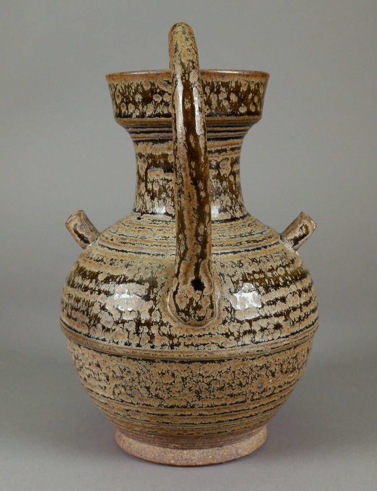 Chinese brown pottery wine pot; of globular body with a slender handle and a short sprout; with two looped lug handles on sides; Jin period; H: 18 cm, D: 13 cm, 844 grams