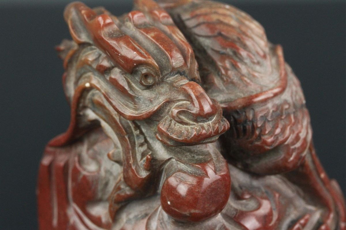 Chinese Shoushan stone carved seal; surmounted by a coiling dragon; with artist signature on side; of red brown tone; H: 11 cm, W: 5.5 cm, L: 5.5 cm, 888 grams