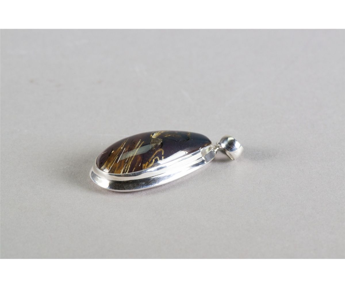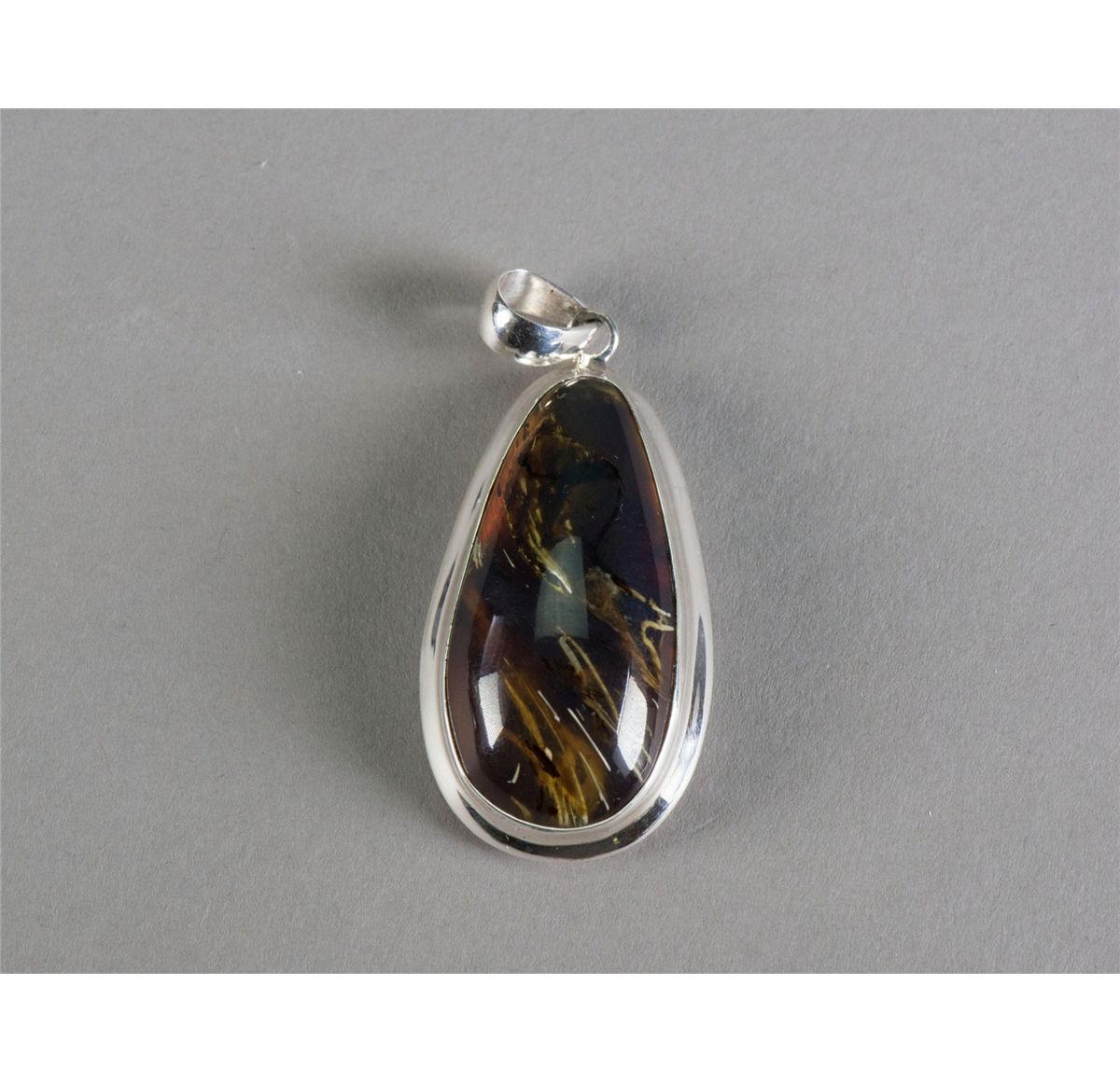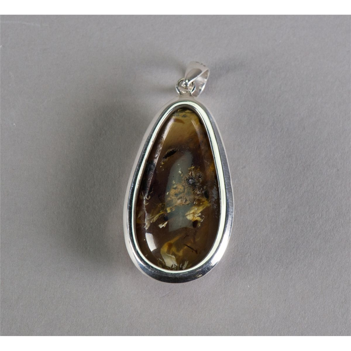 Chinese amber pendant; of cabochon form; with 925 mark silver bail and frame; of butterscotch tone; L: 5 cm, W: 2.8 cm, 18 grams